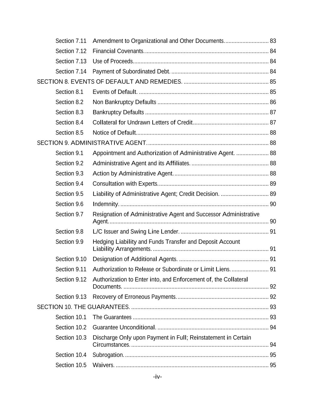 -iv- Section 7.11 Amendment to Organizational and Other Documents. ............................ 83 Section 7.12 Financial Covenants. ................................................................................ 84 Section 7.13 Use of Proceeds........................................................................................ 84 Section 7.14 Payment of Subordinated Debt. ............................................................... 84 SECTION 8. EVENTS OF DEFAULT AND REMEDIES. ....................................................... 85 Section 8.1 Events of Default. .................................................................................... 85 Section 8.2 Non Bankruptcy Defaults ........................................................................ 86 Section 8.3 Bankruptcy Defaults ................................................................................ 87 Section 8.4 Collateral for Undrawn Letters of Credit ................................................. 87 Section 8.5 Notice of Default...................................................................................... 88 SECTION 9. ADMINISTRATIVE AGENT. .............................................................................. 88 Section 9.1 Appointment and Authorization of Administrative Agent. ..................... 88 Section 9.2 Administrative Agent and its Affiliates. .................................................. 88 Section 9.3 Action by Administrative Agent. ............................................................. 88 Section 9.4 Consultation with Experts. ....................................................................... 89 Section 9.5 Liability of Administrative Agent; Credit Decision. ............................... 89 Section 9.6 Indemnity. ................................................................................................ 90 Section 9.7 Resignation of Administrative Agent and Successor Administrative Agent. ....................................................................................................... 90 Section 9.8 L/C Issuer and Swing Line Lender. ......................................................... 91 Section 9.9 Hedging Liability and Funds Transfer and Deposit Account Liability Arrangements. ........................................................................... 91 Section 9.10 Designation of Additional Agents. .......................................................... 91 Section 9.11 Authorization to Release or Subordinate or Limit Liens. ........................ 91 Section 9.12 Authorization to Enter into, and Enforcement of, the Collateral Documents. .............................................................................................. 92 Section 9.13 Recovery of Erroneous Payments. ........................................................... 92 SECTION 10. THE GUARANTEES. ......................................................................................... 93 Section 10.1 The Guarantees ........................................................................................ 93 Section 10.2 Guarantee Unconditional. ........................................................................ 94 Section 10.3 Discharge Only upon Payment in Full; Reinstatement in Certain Circumstances. ......................................................................................... 94 Section 10.4 Subrogation. ............................................................................................. 95 Section 10.5 Waivers. ................................................................................................... 95