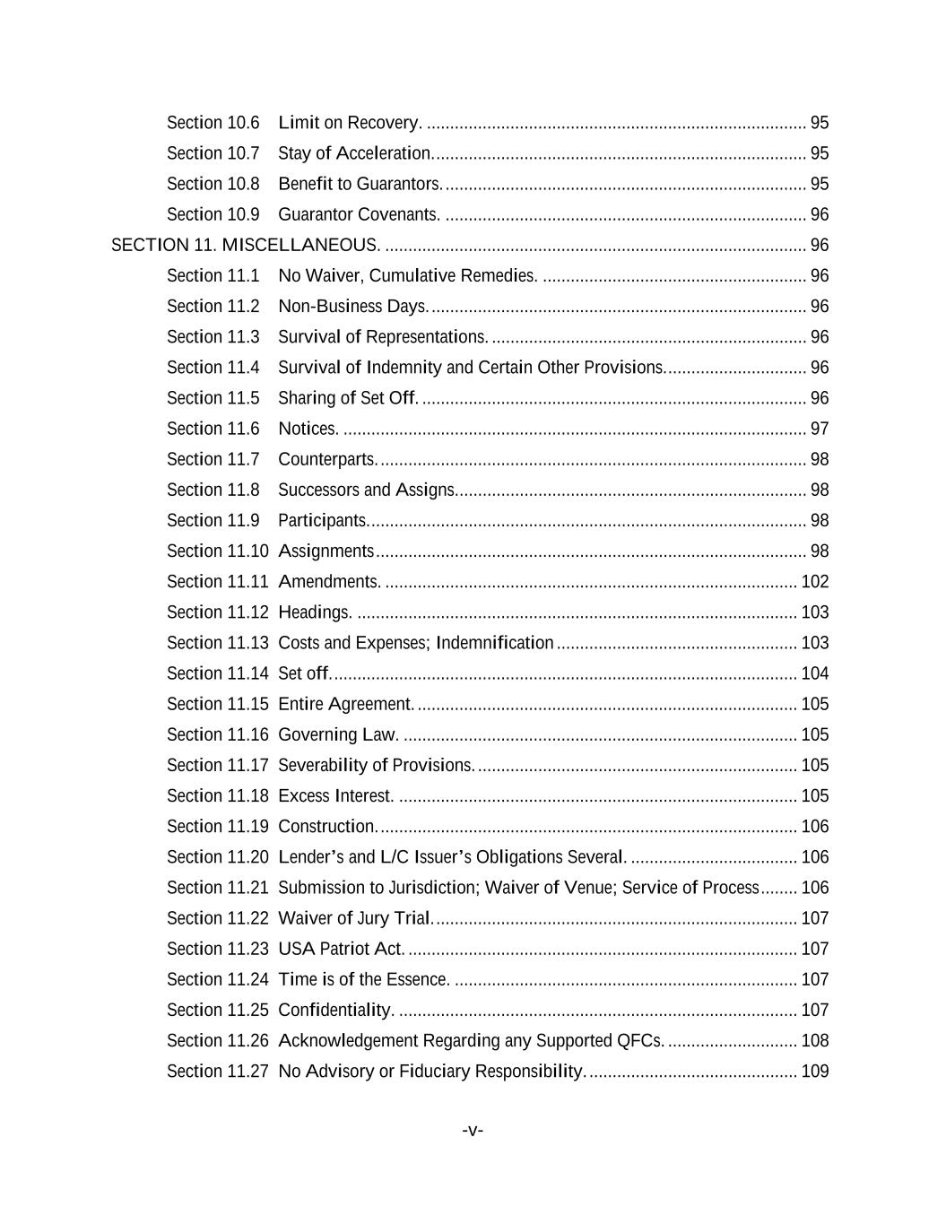 -v- Section 10.6 Limit on Recovery. .................................................................................. 95 Section 10.7 Stay of Acceleration. ................................................................................ 95 Section 10.8 Benefit to Guarantors. .............................................................................. 95 Section 10.9 Guarantor Covenants. .............................................................................. 96 SECTION 11. MISCELLANEOUS. ........................................................................................... 96 Section 11.1 No Waiver, Cumulative Remedies. ......................................................... 96 Section 11.2 Non-Business Days. ................................................................................. 96 Section 11.3 Survival of Representations. .................................................................... 96 Section 11.4 Survival of Indemnity and Certain Other Provisions. .............................. 96 Section 11.5 Sharing of Set Off. ................................................................................... 96 Section 11.6 Notices. .................................................................................................... 97 Section 11.7 Counterparts. ............................................................................................ 98 Section 11.8 Successors and Assigns............................................................................ 98 Section 11.9 Participants. .............................................................................................. 98 Section 11.10 Assignments ............................................................................................. 98 Section 11.11 Amendments. ......................................................................................... 102 Section 11.12 Headings. ............................................................................................... 103 Section 11.13 Costs and Expenses; Indemnification .................................................... 103 Section 11.14 Set off. .................................................................................................... 104 Section 11.15 Entire Agreement. .................................................................................. 105 Section 11.16 Governing Law. ..................................................................................... 105 Section 11.17 Severability of Provisions. ..................................................................... 105 Section 11.18 Excess Interest. ...................................................................................... 105 Section 11.19 Construction. .......................................................................................... 106 Section 11.20 Lender’s and L/C Issuer’s Obligations Several. .................................... 106 Section 11.21 Submission to Jurisdiction; Waiver of Venue; Service of Process ........ 106 Section 11.22 Waiver of Jury Trial. .............................................................................. 107 Section 11.23 USA Patriot Act. .................................................................................... 107 Section 11.24 Time is of the Essence. .......................................................................... 107 Section 11.25 Confidentiality. ...................................................................................... 107 Section 11.26 Acknowledgement Regarding any Supported QFCs. ............................ 108 Section 11.27 No Advisory or Fiduciary Responsibility. ............................................. 109