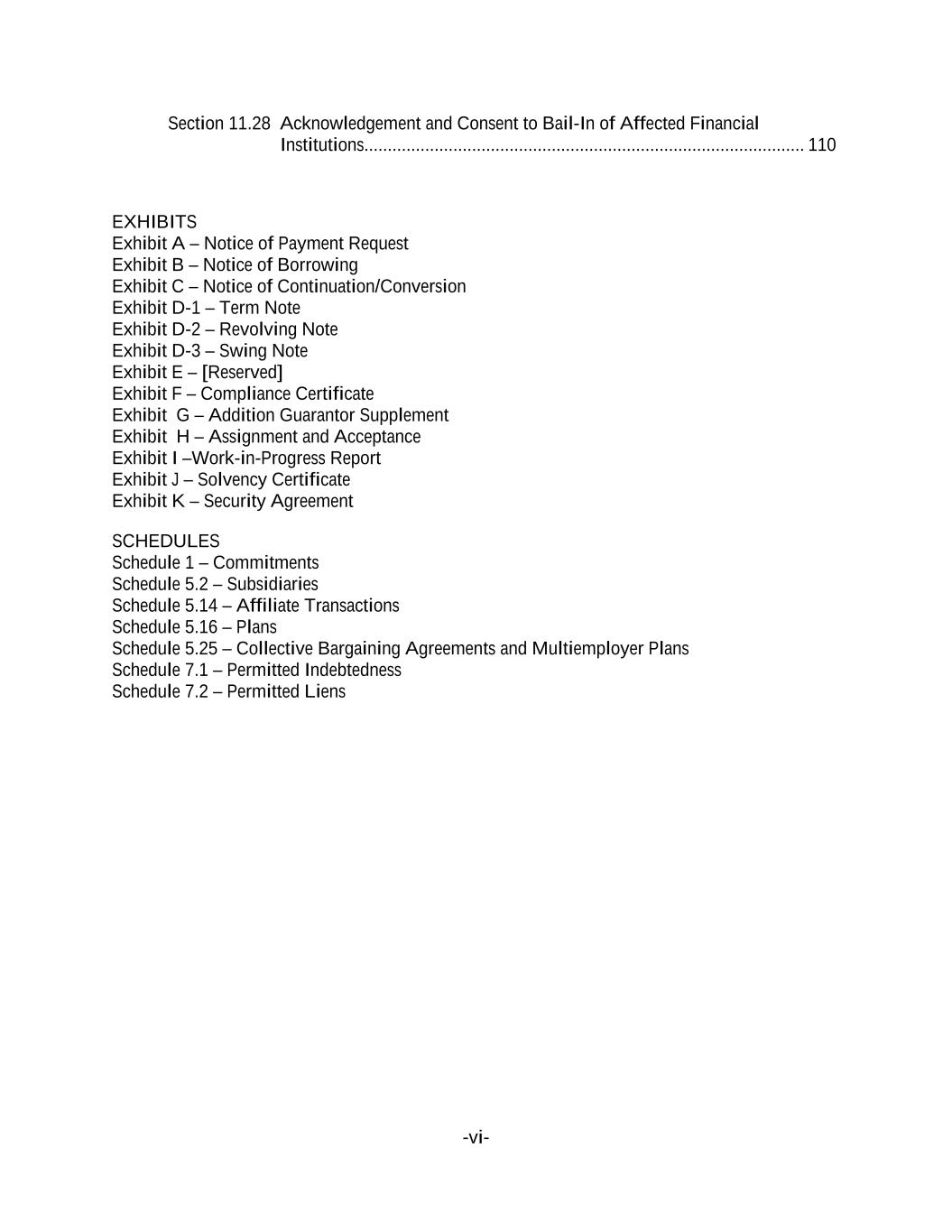 -vi- Section 11.28 Acknowledgement and Consent to Bail-In of Affected Financial Institutions.............................................................................................. 110 EXHIBITS Exhibit A – Notice of Payment Request Exhibit B – Notice of Borrowing Exhibit C – Notice of Continuation/Conversion Exhibit D-1 – Term Note Exhibit D-2 – Revolving Note Exhibit D-3 – Swing Note Exhibit E – [Reserved] Exhibit F – Compliance Certificate Exhibit G – Addition Guarantor Supplement Exhibit H – Assignment and Acceptance Exhibit I –Work-in-Progress Report Exhibit J – Solvency Certificate Exhibit K – Security Agreement SCHEDULES Schedule 1 – Commitments Schedule 5.2 – Subsidiaries Schedule 5.14 – Affiliate Transactions Schedule 5.16 – Plans Schedule 5.25 – Collective Bargaining Agreements and Multiemployer Plans Schedule 7.1 – Permitted Indebtedness Schedule 7.2 – Permitted Liens