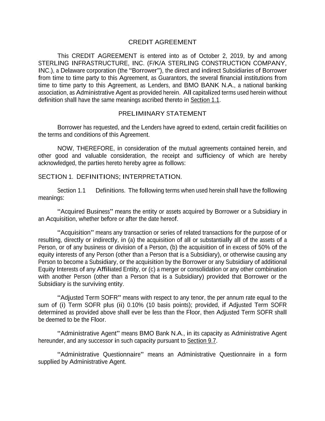 CREDIT AGREEMENT This CREDIT AGREEMENT is entered into as of October 2, 2019, by and among STERLING INFRASTRUCTURE, INC. (F/K/A STERLING CONSTRUCTION COMPANY, INC.), a Delaware corporation (the “Borrower”), the direct and indirect Subsidiaries of Borrower from time to time party to this Agreement, as Guarantors, the several financial institutions from time to time party to this Agreement, as Lenders, and BMO BANK N.A., a national banking association, as Administrative Agent as provided herein. All capitalized terms used herein without definition shall have the same meanings ascribed thereto in Section 1.1. PRELIMINARY STATEMENT Borrower has requested, and the Lenders have agreed to extend, certain credit facilities on the terms and conditions of this Agreement. NOW, THEREFORE, in consideration of the mutual agreements contained herein, and other good and valuable consideration, the receipt and sufficiency of which are hereby acknowledged, the parties hereto hereby agree as follows: SECTION 1. DEFINITIONS; INTERPRETATION. Section 1.1 Definitions. The following terms when used herein shall have the following meanings: “Acquired Business” means the entity or assets acquired by Borrower or a Subsidiary in an Acquisition, whether before or after the date hereof. “Acquisition” means any transaction or series of related transactions for the purpose of or resulting, directly or indirectly, in (a) the acquisition of all or substantially all of the assets of a Person, or of any business or division of a Person, (b) the acquisition of in excess of 50% of the equity interests of any Person (other than a Person that is a Subsidiary), or otherwise causing any Person to become a Subsidiary, or the acquisition by the Borrower or any Subsidiary of additional Equity Interests of any Affiliated Entity, or (c) a merger or consolidation or any other combination with another Person (other than a Person that is a Subsidiary) provided that Borrower or the Subsidiary is the surviving entity. “Adjusted Term SOFR” means with respect to any tenor, the per annum rate equal to the sum of (i) Term SOFR plus (ii) 0.10% (10 basis points); provided, if Adjusted Term SOFR determined as provided above shall ever be less than the Floor, then Adjusted Term SOFR shall be deemed to be the Floor. “Administrative Agent” means BMO Bank N.A., in its capacity as Administrative Agent hereunder, and any successor in such capacity pursuant to Section 9.7. “Administrative Questionnaire” means an Administrative Questionnaire in a form supplied by Administrative Agent.