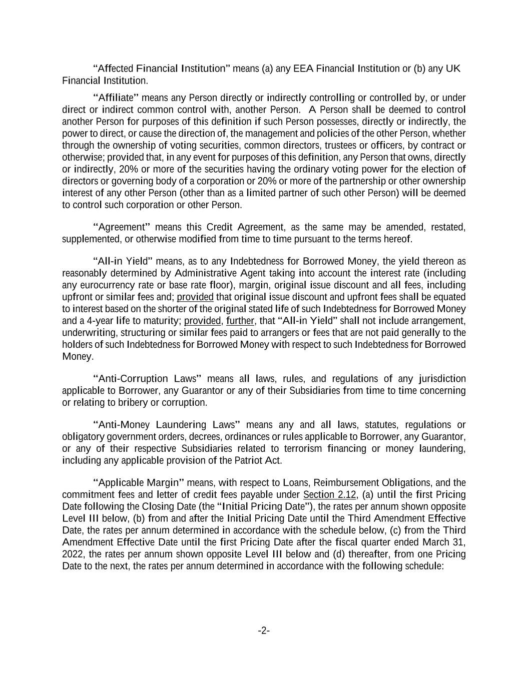 -2- “Affected Financial Institution” means (a) any EEA Financial Institution or (b) any UK Financial Institution. “Affiliate” means any Person directly or indirectly controlling or controlled by, or under direct or indirect common control with, another Person. A Person shall be deemed to control another Person for purposes of this definition if such Person possesses, directly or indirectly, the power to direct, or cause the direction of, the management and policies of the other Person, whether through the ownership of voting securities, common directors, trustees or officers, by contract or otherwise; provided that, in any event for purposes of this definition, any Person that owns, directly or indirectly, 20% or more of the securities having the ordinary voting power for the election of directors or governing body of a corporation or 20% or more of the partnership or other ownership interest of any other Person (other than as a limited partner of such other Person) will be deemed to control such corporation or other Person. “Agreement” means this Credit Agreement, as the same may be amended, restated, supplemented, or otherwise modified from time to time pursuant to the terms hereof. “All-in Yield” means, as to any Indebtedness for Borrowed Money, the yield thereon as reasonably determined by Administrative Agent taking into account the interest rate (including any eurocurrency rate or base rate floor), margin, original issue discount and all fees, including upfront or similar fees and; provided that original issue discount and upfront fees shall be equated to interest based on the shorter of the original stated life of such Indebtedness for Borrowed Money and a 4-year life to maturity; provided, further, that “All-in Yield” shall not include arrangement, underwriting, structuring or similar fees paid to arrangers or fees that are not paid generally to the holders of such Indebtedness for Borrowed Money with respect to such Indebtedness for Borrowed Money. “Anti-Corruption Laws” means all laws, rules, and regulations of any jurisdiction applicable to Borrower, any Guarantor or any of their Subsidiaries from time to time concerning or relating to bribery or corruption. “Anti-Money Laundering Laws” means any and all laws, statutes, regulations or obligatory government orders, decrees, ordinances or rules applicable to Borrower, any Guarantor, or any of their respective Subsidiaries related to terrorism financing or money laundering, including any applicable provision of the Patriot Act. “Applicable Margin” means, with respect to Loans, Reimbursement Obligations, and the commitment fees and letter of credit fees payable under Section 2.12, (a) until the first Pricing Date following the Closing Date (the “Initial Pricing Date”), the rates per annum shown opposite Level III below, (b) from and after the Initial Pricing Date until the Third Amendment Effective Date, the rates per annum determined in accordance with the schedule below, (c) from the Third Amendment Effective Date until the first Pricing Date after the fiscal quarter ended March 31, 2022, the rates per annum shown opposite Level III below and (d) thereafter, from one Pricing Date to the next, the rates per annum determined in accordance with the following schedule: