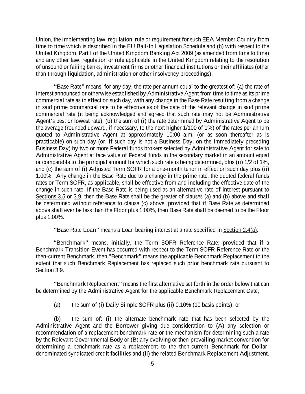 -5- Union, the implementing law, regulation, rule or requirement for such EEA Member Country from time to time which is described in the EU Bail-In Legislation Schedule and (b) with respect to the United Kingdom, Part I of the United Kingdom Banking Act 2009 (as amended from time to time) and any other law, regulation or rule applicable in the United Kingdom relating to the resolution of unsound or failing banks, investment firms or other financial institutions or their affiliates (other than through liquidation, administration or other insolvency proceedings). “Base Rate” means, for any day, the rate per annum equal to the greatest of: (a) the rate of interest announced or otherwise established by Administrative Agent from time to time as its prime commercial rate as in effect on such day, with any change in the Base Rate resulting from a change in said prime commercial rate to be effective as of the date of the relevant change in said prime commercial rate (it being acknowledged and agreed that such rate may not be Administrative Agent’s best or lowest rate), (b) the sum of (i) the rate determined by Administrative Agent to be the average (rounded upward, if necessary, to the next higher 1/100 of 1%) of the rates per annum quoted to Administrative Agent at approximately 10:00 a.m. (or as soon thereafter as is practicable) on such day (or, if such day is not a Business Day, on the immediately preceding Business Day) by two or more Federal funds brokers selected by Administrative Agent for sale to Administrative Agent at face value of Federal funds in the secondary market in an amount equal or comparable to the principal amount for which such rate is being determined, plus (ii) 1/2 of 1%, and (c) the sum of (i) Adjusted Term SOFR for a one-month tenor in effect on such day plus (ii) 1.00%. Any change in the Base Rate due to a change in the prime rate, the quoted federal funds rates or Term SOFR, as applicable, shall be effective from and including the effective date of the change in such rate. If the Base Rate is being used as an alternative rate of interest pursuant to Sections 3.5 or 3.9, then the Base Rate shall be the greater of clauses (a) and (b) above and shall be determined without reference to clause (c) above, provided that if Base Rate as determined above shall ever be less than the Floor plus 1.00%, then Base Rate shall be deemed to be the Floor plus 1.00%. “Base Rate Loan” means a Loan bearing interest at a rate specified in Section 2.4(a). “Benchmark” means, initially, the Term SOFR Reference Rate; provided that if a Benchmark Transition Event has occurred with respect to the Term SOFR Reference Rate or the then-current Benchmark, then “Benchmark” means the applicable Benchmark Replacement to the extent that such Benchmark Replacement has replaced such prior benchmark rate pursuant to Section 3.9. “Benchmark Replacement” means the first alternative set forth in the order below that can be determined by the Administrative Agent for the applicable Benchmark Replacement Date, (a) the sum of (i) Daily Simple SOFR plus (ii) 0.10% (10 basis points); or (b) the sum of: (i) the alternate benchmark rate that has been selected by the Administrative Agent and the Borrower giving due consideration to (A) any selection or recommendation of a replacement benchmark rate or the mechanism for determining such a rate by the Relevant Governmental Body or (B) any evolving or then-prevailing market convention for determining a benchmark rate as a replacement to the then-current Benchmark for Dollar- denominated syndicated credit facilities and (ii) the related Benchmark Replacement Adjustment.