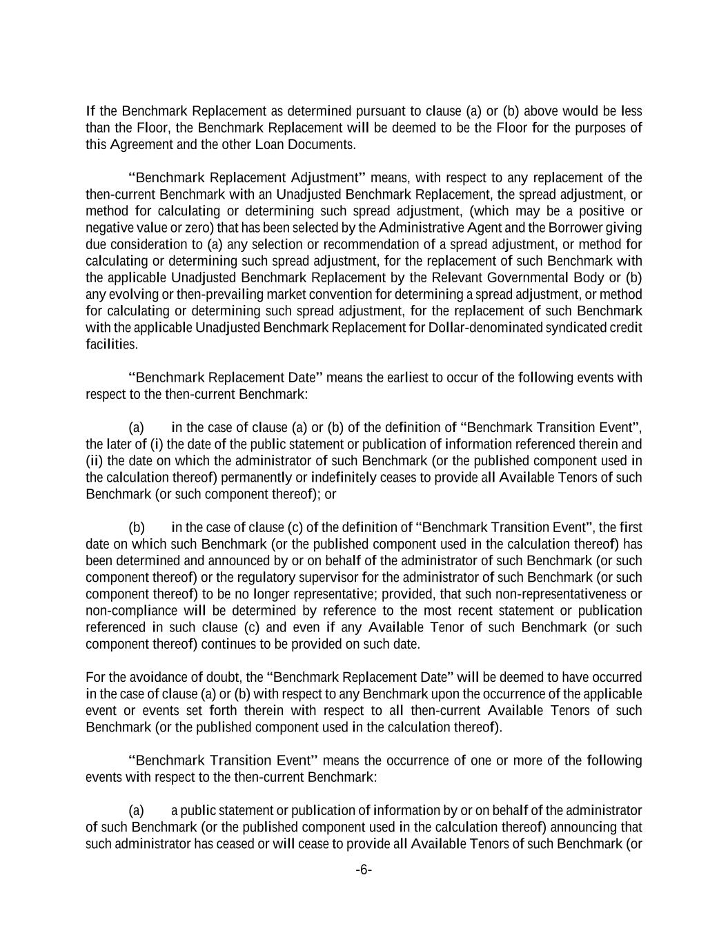 -6- If the Benchmark Replacement as determined pursuant to clause (a) or (b) above would be less than the Floor, the Benchmark Replacement will be deemed to be the Floor for the purposes of this Agreement and the other Loan Documents. “Benchmark Replacement Adjustment” means, with respect to any replacement of the then-current Benchmark with an Unadjusted Benchmark Replacement, the spread adjustment, or method for calculating or determining such spread adjustment, (which may be a positive or negative value or zero) that has been selected by the Administrative Agent and the Borrower giving due consideration to (a) any selection or recommendation of a spread adjustment, or method for calculating or determining such spread adjustment, for the replacement of such Benchmark with the applicable Unadjusted Benchmark Replacement by the Relevant Governmental Body or (b) any evolving or then-prevailing market convention for determining a spread adjustment, or method for calculating or determining such spread adjustment, for the replacement of such Benchmark with the applicable Unadjusted Benchmark Replacement for Dollar-denominated syndicated credit facilities. “Benchmark Replacement Date” means the earliest to occur of the following events with respect to the then-current Benchmark: (a) in the case of clause (a) or (b) of the definition of “Benchmark Transition Event”, the later of (i) the date of the public statement or publication of information referenced therein and (ii) the date on which the administrator of such Benchmark (or the published component used in the calculation thereof) permanently or indefinitely ceases to provide all Available Tenors of such Benchmark (or such component thereof); or (b) in the case of clause (c) of the definition of “Benchmark Transition Event”, the first date on which such Benchmark (or the published component used in the calculation thereof) has been determined and announced by or on behalf of the administrator of such Benchmark (or such component thereof) or the regulatory supervisor for the administrator of such Benchmark (or such component thereof) to be no longer representative; provided, that such non-representativeness or non-compliance will be determined by reference to the most recent statement or publication referenced in such clause (c) and even if any Available Tenor of such Benchmark (or such component thereof) continues to be provided on such date. For the avoidance of doubt, the “Benchmark Replacement Date” will be deemed to have occurred in the case of clause (a) or (b) with respect to any Benchmark upon the occurrence of the applicable event or events set forth therein with respect to all then-current Available Tenors of such Benchmark (or the published component used in the calculation thereof). “Benchmark Transition Event” means the occurrence of one or more of the following events with respect to the then-current Benchmark: (a) a public statement or publication of information by or on behalf of the administrator of such Benchmark (or the published component used in the calculation thereof) announcing that such administrator has ceased or will cease to provide all Available Tenors of such Benchmark (or