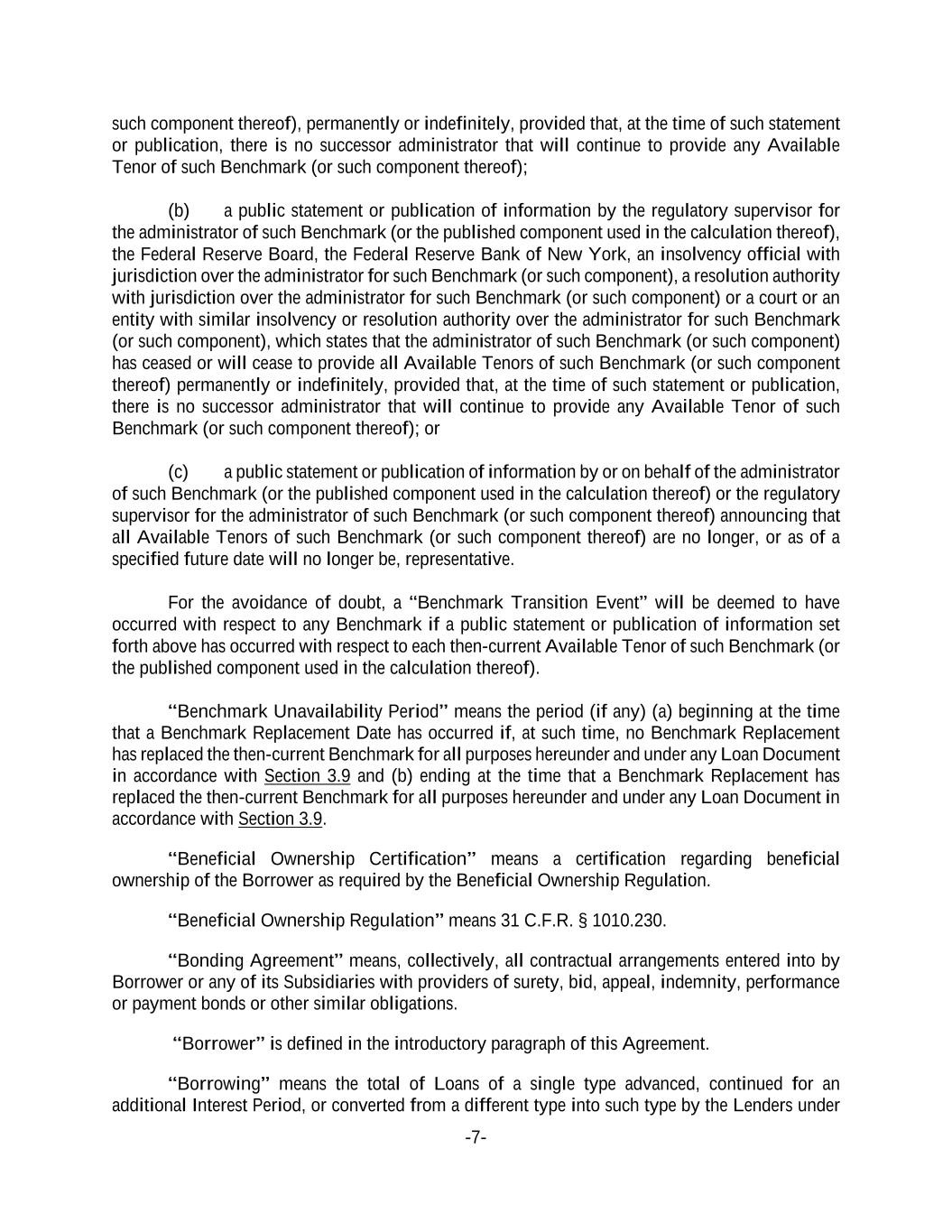 -7- such component thereof), permanently or indefinitely, provided that, at the time of such statement or publication, there is no successor administrator that will continue to provide any Available Tenor of such Benchmark (or such component thereof); (b) a public statement or publication of information by the regulatory supervisor for the administrator of such Benchmark (or the published component used in the calculation thereof), the Federal Reserve Board, the Federal Reserve Bank of New York, an insolvency official with jurisdiction over the administrator for such Benchmark (or such component), a resolution authority with jurisdiction over the administrator for such Benchmark (or such component) or a court or an entity with similar insolvency or resolution authority over the administrator for such Benchmark (or such component), which states that the administrator of such Benchmark (or such component) has ceased or will cease to provide all Available Tenors of such Benchmark (or such component thereof) permanently or indefinitely, provided that, at the time of such statement or publication, there is no successor administrator that will continue to provide any Available Tenor of such Benchmark (or such component thereof); or (c) a public statement or publication of information by or on behalf of the administrator of such Benchmark (or the published component used in the calculation thereof) or the regulatory supervisor for the administrator of such Benchmark (or such component thereof) announcing that all Available Tenors of such Benchmark (or such component thereof) are no longer, or as of a specified future date will no longer be, representative. For the avoidance of doubt, a “Benchmark Transition Event” will be deemed to have occurred with respect to any Benchmark if a public statement or publication of information set forth above has occurred with respect to each then-current Available Tenor of such Benchmark (or the published component used in the calculation thereof). “Benchmark Unavailability Period” means the period (if any) (a) beginning at the time that a Benchmark Replacement Date has occurred if, at such time, no Benchmark Replacement has replaced the then-current Benchmark for all purposes hereunder and under any Loan Document in accordance with Section 3.9 and (b) ending at the time that a Benchmark Replacement has replaced the then-current Benchmark for all purposes hereunder and under any Loan Document in accordance with Section 3.9. “Beneficial Ownership Certification” means a certification regarding beneficial ownership of the Borrower as required by the Beneficial Ownership Regulation. “Beneficial Ownership Regulation” means 31 C.F.R. § 1010.230. “Bonding Agreement” means, collectively, all contractual arrangements entered into by Borrower or any of its Subsidiaries with providers of surety, bid, appeal, indemnity, performance or payment bonds or other similar obligations. “Borrower” is defined in the introductory paragraph of this Agreement. “Borrowing” means the total of Loans of a single type advanced, continued for an additional Interest Period, or converted from a different type into such type by the Lenders under