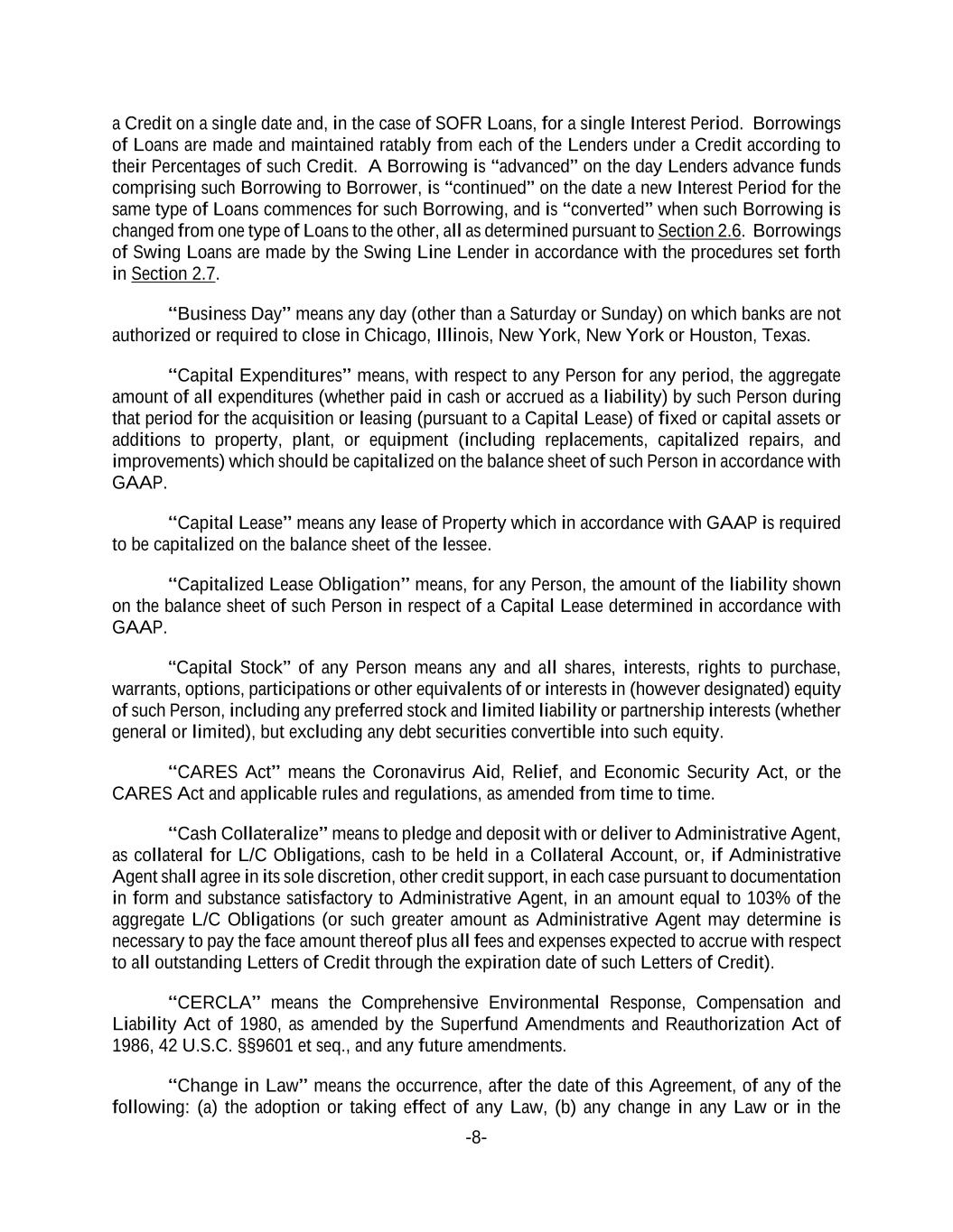 -8- a Credit on a single date and, in the case of SOFR Loans, for a single Interest Period. Borrowings of Loans are made and maintained ratably from each of the Lenders under a Credit according to their Percentages of such Credit. A Borrowing is “advanced” on the day Lenders advance funds comprising such Borrowing to Borrower, is “continued” on the date a new Interest Period for the same type of Loans commences for such Borrowing, and is “converted” when such Borrowing is changed from one type of Loans to the other, all as determined pursuant to Section 2.6. Borrowings of Swing Loans are made by the Swing Line Lender in accordance with the procedures set forth in Section 2.7. “Business Day” means any day (other than a Saturday or Sunday) on which banks are not authorized or required to close in Chicago, Illinois, New York, New York or Houston, Texas. “Capital Expenditures” means, with respect to any Person for any period, the aggregate amount of all expenditures (whether paid in cash or accrued as a liability) by such Person during that period for the acquisition or leasing (pursuant to a Capital Lease) of fixed or capital assets or additions to property, plant, or equipment (including replacements, capitalized repairs, and improvements) which should be capitalized on the balance sheet of such Person in accordance with GAAP. “Capital Lease” means any lease of Property which in accordance with GAAP is required to be capitalized on the balance sheet of the lessee. “Capitalized Lease Obligation” means, for any Person, the amount of the liability shown on the balance sheet of such Person in respect of a Capital Lease determined in accordance with GAAP. “Capital Stock” of any Person means any and all shares, interests, rights to purchase, warrants, options, participations or other equivalents of or interests in (however designated) equity of such Person, including any preferred stock and limited liability or partnership interests (whether general or limited), but excluding any debt securities convertible into such equity. “CARES Act” means the Coronavirus Aid, Relief, and Economic Security Act, or the CARES Act and applicable rules and regulations, as amended from time to time. “Cash Collateralize” means to pledge and deposit with or deliver to Administrative Agent, as collateral for L/C Obligations, cash to be held in a Collateral Account, or, if Administrative Agent shall agree in its sole discretion, other credit support, in each case pursuant to documentation in form and substance satisfactory to Administrative Agent, in an amount equal to 103% of the aggregate L/C Obligations (or such greater amount as Administrative Agent may determine is necessary to pay the face amount thereof plus all fees and expenses expected to accrue with respect to all outstanding Letters of Credit through the expiration date of such Letters of Credit). “CERCLA” means the Comprehensive Environmental Response, Compensation and Liability Act of 1980, as amended by the Superfund Amendments and Reauthorization Act of 1986, 42 U.S.C. §§9601 et seq., and any future amendments. “Change in Law” means the occurrence, after the date of this Agreement, of any of the following: (a) the adoption or taking effect of any Law, (b) any change in any Law or in the