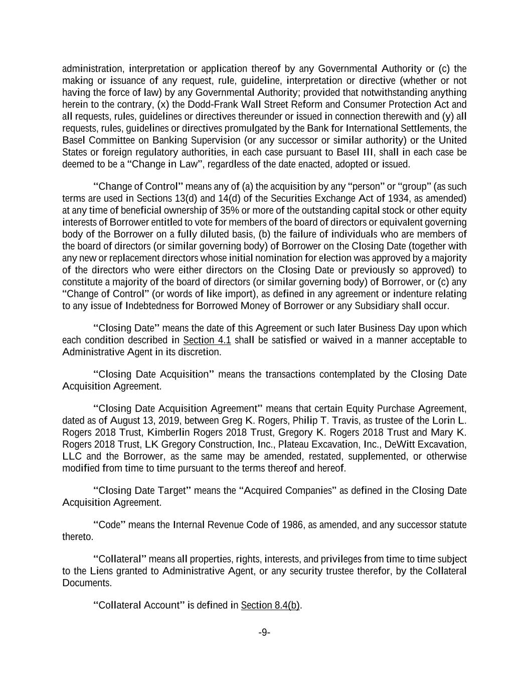 -9- administration, interpretation or application thereof by any Governmental Authority or (c) the making or issuance of any request, rule, guideline, interpretation or directive (whether or not having the force of law) by any Governmental Authority; provided that notwithstanding anything herein to the contrary, (x) the Dodd-Frank Wall Street Reform and Consumer Protection Act and all requests, rules, guidelines or directives thereunder or issued in connection therewith and (y) all requests, rules, guidelines or directives promulgated by the Bank for International Settlements, the Basel Committee on Banking Supervision (or any successor or similar authority) or the United States or foreign regulatory authorities, in each case pursuant to Basel III, shall in each case be deemed to be a “Change in Law”, regardless of the date enacted, adopted or issued. “Change of Control” means any of (a) the acquisition by any “person” or “group” (as such terms are used in Sections 13(d) and 14(d) of the Securities Exchange Act of 1934, as amended) at any time of beneficial ownership of 35% or more of the outstanding capital stock or other equity interests of Borrower entitled to vote for members of the board of directors or equivalent governing body of the Borrower on a fully diluted basis, (b) the failure of individuals who are members of the board of directors (or similar governing body) of Borrower on the Closing Date (together with any new or replacement directors whose initial nomination for election was approved by a majority of the directors who were either directors on the Closing Date or previously so approved) to constitute a majority of the board of directors (or similar governing body) of Borrower, or (c) any “Change of Control” (or words of like import), as defined in any agreement or indenture relating to any issue of Indebtedness for Borrowed Money of Borrower or any Subsidiary shall occur. “Closing Date” means the date of this Agreement or such later Business Day upon which each condition described in Section 4.1 shall be satisfied or waived in a manner acceptable to Administrative Agent in its discretion. “Closing Date Acquisition” means the transactions contemplated by the Closing Date Acquisition Agreement. “Closing Date Acquisition Agreement” means that certain Equity Purchase Agreement, dated as of August 13, 2019, between Greg K. Rogers, Philip T. Travis, as trustee of the Lorin L. Rogers 2018 Trust, Kimberlin Rogers 2018 Trust, Gregory K. Rogers 2018 Trust and Mary K. Rogers 2018 Trust, LK Gregory Construction, Inc., Plateau Excavation, Inc., DeWitt Excavation, LLC and the Borrower, as the same may be amended, restated, supplemented, or otherwise modified from time to time pursuant to the terms thereof and hereof. “Closing Date Target” means the “Acquired Companies” as defined in the Closing Date Acquisition Agreement. “Code” means the Internal Revenue Code of 1986, as amended, and any successor statute thereto. “Collateral” means all properties, rights, interests, and privileges from time to time subject to the Liens granted to Administrative Agent, or any security trustee therefor, by the Collateral Documents. “Collateral Account” is defined in Section 8.4(b).