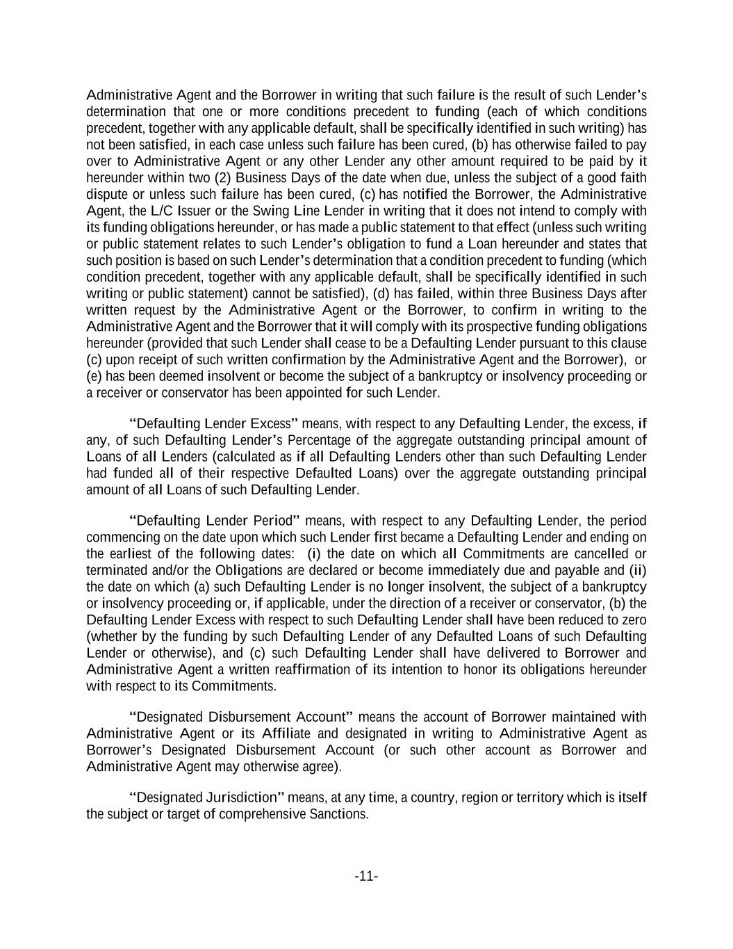 -11- Administrative Agent and the Borrower in writing that such failure is the result of such Lender’s determination that one or more conditions precedent to funding (each of which conditions precedent, together with any applicable default, shall be specifically identified in such writing) has not been satisfied, in each case unless such failure has been cured, (b) has otherwise failed to pay over to Administrative Agent or any other Lender any other amount required to be paid by it hereunder within two (2) Business Days of the date when due, unless the subject of a good faith dispute or unless such failure has been cured, (c) has notified the Borrower, the Administrative Agent, the L/C Issuer or the Swing Line Lender in writing that it does not intend to comply with its funding obligations hereunder, or has made a public statement to that effect (unless such writing or public statement relates to such Lender’s obligation to fund a Loan hereunder and states that such position is based on such Lender’s determination that a condition precedent to funding (which condition precedent, together with any applicable default, shall be specifically identified in such writing or public statement) cannot be satisfied), (d) has failed, within three Business Days after written request by the Administrative Agent or the Borrower, to confirm in writing to the Administrative Agent and the Borrower that it will comply with its prospective funding obligations hereunder (provided that such Lender shall cease to be a Defaulting Lender pursuant to this clause (c) upon receipt of such written confirmation by the Administrative Agent and the Borrower), or (e) has been deemed insolvent or become the subject of a bankruptcy or insolvency proceeding or a receiver or conservator has been appointed for such Lender. “Defaulting Lender Excess” means, with respect to any Defaulting Lender, the excess, if any, of such Defaulting Lender’s Percentage of the aggregate outstanding principal amount of Loans of all Lenders (calculated as if all Defaulting Lenders other than such Defaulting Lender had funded all of their respective Defaulted Loans) over the aggregate outstanding principal amount of all Loans of such Defaulting Lender. “Defaulting Lender Period” means, with respect to any Defaulting Lender, the period commencing on the date upon which such Lender first became a Defaulting Lender and ending on the earliest of the following dates: (i) the date on which all Commitments are cancelled or terminated and/or the Obligations are declared or become immediately due and payable and (ii) the date on which (a) such Defaulting Lender is no longer insolvent, the subject of a bankruptcy or insolvency proceeding or, if applicable, under the direction of a receiver or conservator, (b) the Defaulting Lender Excess with respect to such Defaulting Lender shall have been reduced to zero (whether by the funding by such Defaulting Lender of any Defaulted Loans of such Defaulting Lender or otherwise), and (c) such Defaulting Lender shall have delivered to Borrower and Administrative Agent a written reaffirmation of its intention to honor its obligations hereunder with respect to its Commitments. “Designated Disbursement Account” means the account of Borrower maintained with Administrative Agent or its Affiliate and designated in writing to Administrative Agent as Borrower’s Designated Disbursement Account (or such other account as Borrower and Administrative Agent may otherwise agree). “Designated Jurisdiction” means, at any time, a country, region or territory which is itself the subject or target of comprehensive Sanctions.