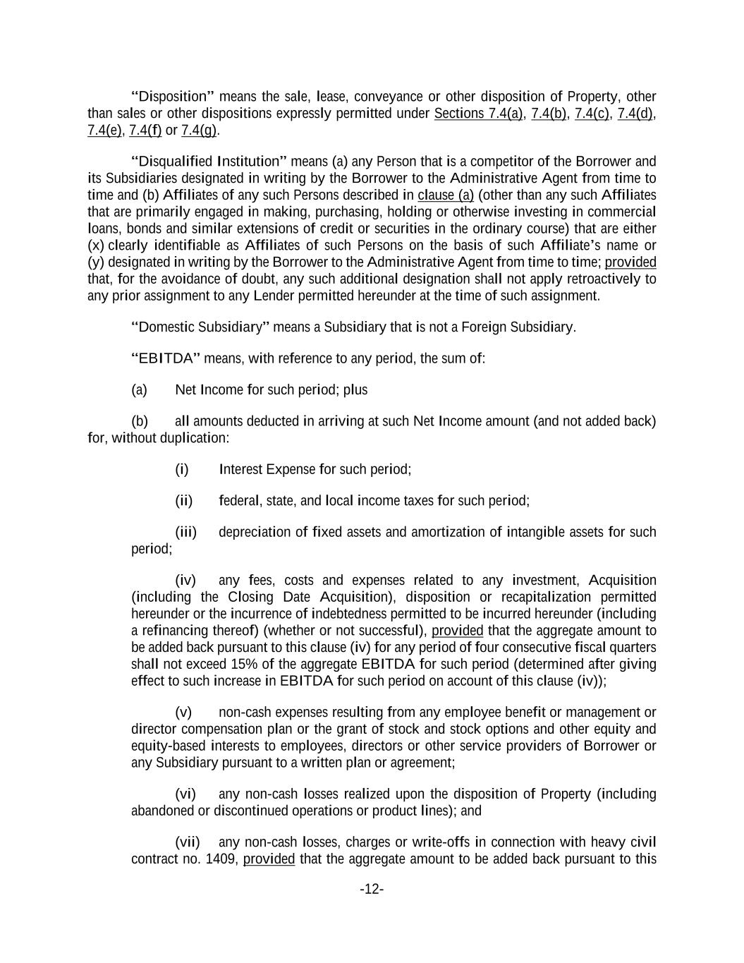 -12- “Disposition” means the sale, lease, conveyance or other disposition of Property, other than sales or other dispositions expressly permitted under Sections 7.4(a), 7.4(b), 7.4(c), 7.4(d), 7.4(e), 7.4(f) or 7.4(g). “Disqualified Institution” means (a) any Person that is a competitor of the Borrower and its Subsidiaries designated in writing by the Borrower to the Administrative Agent from time to time and (b) Affiliates of any such Persons described in clause (a) (other than any such Affiliates that are primarily engaged in making, purchasing, holding or otherwise investing in commercial loans, bonds and similar extensions of credit or securities in the ordinary course) that are either (x) clearly identifiable as Affiliates of such Persons on the basis of such Affiliate’s name or (y) designated in writing by the Borrower to the Administrative Agent from time to time; provided that, for the avoidance of doubt, any such additional designation shall not apply retroactively to any prior assignment to any Lender permitted hereunder at the time of such assignment. “Domestic Subsidiary” means a Subsidiary that is not a Foreign Subsidiary. “EBITDA” means, with reference to any period, the sum of: (a) Net Income for such period; plus (b) all amounts deducted in arriving at such Net Income amount (and not added back) for, without duplication: (i) Interest Expense for such period; (ii) federal, state, and local income taxes for such period; (iii) depreciation of fixed assets and amortization of intangible assets for such period; (iv) any fees, costs and expenses related to any investment, Acquisition (including the Closing Date Acquisition), disposition or recapitalization permitted hereunder or the incurrence of indebtedness permitted to be incurred hereunder (including a refinancing thereof) (whether or not successful), provided that the aggregate amount to be added back pursuant to this clause (iv) for any period of four consecutive fiscal quarters shall not exceed 15% of the aggregate EBITDA for such period (determined after giving effect to such increase in EBITDA for such period on account of this clause (iv)); (v) non-cash expenses resulting from any employee benefit or management or director compensation plan or the grant of stock and stock options and other equity and equity-based interests to employees, directors or other service providers of Borrower or any Subsidiary pursuant to a written plan or agreement; (vi) any non-cash losses realized upon the disposition of Property (including abandoned or discontinued operations or product lines); and (vii) any non-cash losses, charges or write-offs in connection with heavy civil contract no. 1409, provided that the aggregate amount to be added back pursuant to this