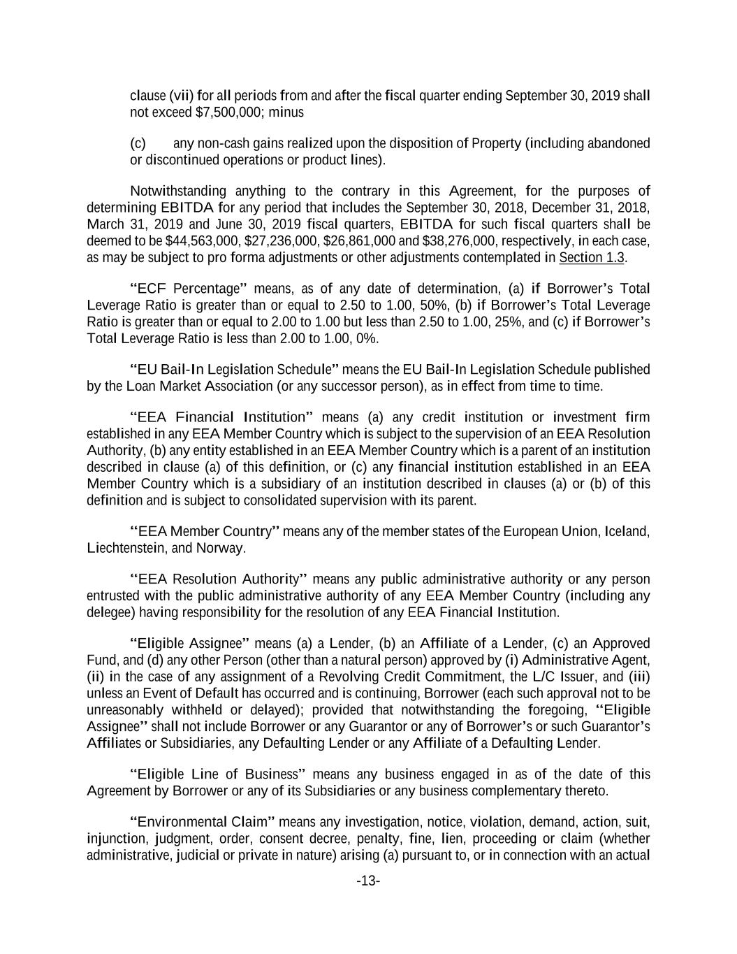 -13- clause (vii) for all periods from and after the fiscal quarter ending September 30, 2019 shall not exceed $7,500,000; minus (c) any non-cash gains realized upon the disposition of Property (including abandoned or discontinued operations or product lines). Notwithstanding anything to the contrary in this Agreement, for the purposes of determining EBITDA for any period that includes the September 30, 2018, December 31, 2018, March 31, 2019 and June 30, 2019 fiscal quarters, EBITDA for such fiscal quarters shall be deemed to be $44,563,000, $27,236,000, $26,861,000 and $38,276,000, respectively, in each case, as may be subject to pro forma adjustments or other adjustments contemplated in Section 1.3. “ECF Percentage” means, as of any date of determination, (a) if Borrower’s Total Leverage Ratio is greater than or equal to 2.50 to 1.00, 50%, (b) if Borrower’s Total Leverage Ratio is greater than or equal to 2.00 to 1.00 but less than 2.50 to 1.00, 25%, and (c) if Borrower’s Total Leverage Ratio is less than 2.00 to 1.00, 0%. “EU Bail-In Legislation Schedule” means the EU Bail-In Legislation Schedule published by the Loan Market Association (or any successor person), as in effect from time to time. “EEA Financial Institution” means (a) any credit institution or investment firm established in any EEA Member Country which is subject to the supervision of an EEA Resolution Authority, (b) any entity established in an EEA Member Country which is a parent of an institution described in clause (a) of this definition, or (c) any financial institution established in an EEA Member Country which is a subsidiary of an institution described in clauses (a) or (b) of this definition and is subject to consolidated supervision with its parent. “EEA Member Country” means any of the member states of the European Union, Iceland, Liechtenstein, and Norway. “EEA Resolution Authority” means any public administrative authority or any person entrusted with the public administrative authority of any EEA Member Country (including any delegee) having responsibility for the resolution of any EEA Financial Institution. “Eligible Assignee” means (a) a Lender, (b) an Affiliate of a Lender, (c) an Approved Fund, and (d) any other Person (other than a natural person) approved by (i) Administrative Agent, (ii) in the case of any assignment of a Revolving Credit Commitment, the L/C Issuer, and (iii) unless an Event of Default has occurred and is continuing, Borrower (each such approval not to be unreasonably withheld or delayed); provided that notwithstanding the foregoing, “Eligible Assignee” shall not include Borrower or any Guarantor or any of Borrower’s or such Guarantor’s Affiliates or Subsidiaries, any Defaulting Lender or any Affiliate of a Defaulting Lender. “Eligible Line of Business” means any business engaged in as of the date of this Agreement by Borrower or any of its Subsidiaries or any business complementary thereto. “Environmental Claim” means any investigation, notice, violation, demand, action, suit, injunction, judgment, order, consent decree, penalty, fine, lien, proceeding or claim (whether administrative, judicial or private in nature) arising (a) pursuant to, or in connection with an actual