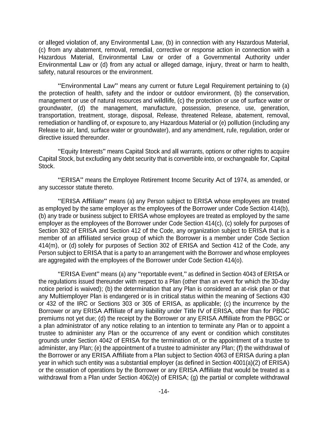 -14- or alleged violation of, any Environmental Law, (b) in connection with any Hazardous Material, (c) from any abatement, removal, remedial, corrective or response action in connection with a Hazardous Material, Environmental Law or order of a Governmental Authority under Environmental Law or (d) from any actual or alleged damage, injury, threat or harm to health, safety, natural resources or the environment. “Environmental Law” means any current or future Legal Requirement pertaining to (a) the protection of health, safety and the indoor or outdoor environment, (b) the conservation, management or use of natural resources and wildlife, (c) the protection or use of surface water or groundwater, (d) the management, manufacture, possession, presence, use, generation, transportation, treatment, storage, disposal, Release, threatened Release, abatement, removal, remediation or handling of, or exposure to, any Hazardous Material or (e) pollution (including any Release to air, land, surface water or groundwater), and any amendment, rule, regulation, order or directive issued thereunder. “Equity Interests” means Capital Stock and all warrants, options or other rights to acquire Capital Stock, but excluding any debt security that is convertible into, or exchangeable for, Capital Stock. “ERISA” means the Employee Retirement Income Security Act of 1974, as amended, or any successor statute thereto. “ERISA Affiliate” means (a) any Person subject to ERISA whose employees are treated as employed by the same employer as the employees of the Borrower under Code Section 414(b), (b) any trade or business subject to ERISA whose employees are treated as employed by the same employer as the employees of the Borrower under Code Section 414(c), (c) solely for purposes of Section 302 of ERISA and Section 412 of the Code, any organization subject to ERISA that is a member of an affiliated service group of which the Borrower is a member under Code Section 414(m), or (d) solely for purposes of Section 302 of ERISA and Section 412 of the Code, any Person subject to ERISA that is a party to an arrangement with the Borrower and whose employees are aggregated with the employees of the Borrower under Code Section 414(o). “ERISA Event” means (a) any “reportable event,” as defined in Section 4043 of ERISA or the regulations issued thereunder with respect to a Plan (other than an event for which the 30-day notice period is waived); (b) the determination that any Plan is considered an at-risk plan or that any Multiemployer Plan is endangered or is in critical status within the meaning of Sections 430 or 432 of the IRC or Sections 303 or 305 of ERISA, as applicable; (c) the incurrence by the Borrower or any ERISA Affiliate of any liability under Title IV of ERISA, other than for PBGC premiums not yet due; (d) the receipt by the Borrower or any ERISA Affiliate from the PBGC or a plan administrator of any notice relating to an intention to terminate any Plan or to appoint a trustee to administer any Plan or the occurrence of any event or condition which constitutes grounds under Section 4042 of ERISA for the termination of, or the appointment of a trustee to administer, any Plan; (e) the appointment of a trustee to administer any Plan; (f) the withdrawal of the Borrower or any ERISA Affiliate from a Plan subject to Section 4063 of ERISA during a plan year in which such entity was a substantial employer (as defined in Section 4001(a)(2) of ERISA) or the cessation of operations by the Borrower or any ERISA Affiliate that would be treated as a withdrawal from a Plan under Section 4062(e) of ERISA; (g) the partial or complete withdrawal