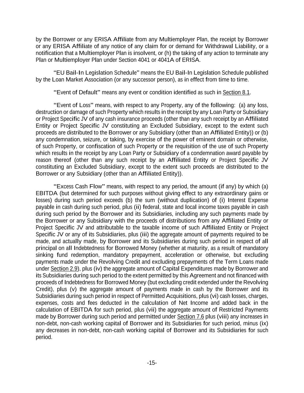 -15- by the Borrower or any ERISA Affiliate from any Multiemployer Plan, the receipt by Borrower or any ERISA Affiliate of any notice of any claim for or demand for Withdrawal Liability, or a notification that a Multiemployer Plan is insolvent, or (h) the taking of any action to terminate any Plan or Multiemployer Plan under Section 4041 or 4041A of ERISA. “EU Bail-In Legislation Schedule” means the EU Bail-In Legislation Schedule published by the Loan Market Association (or any successor person), as in effect from time to time. “Event of Default” means any event or condition identified as such in Section 8.1. “Event of Loss” means, with respect to any Property, any of the following: (a) any loss, destruction or damage of such Property which results in the receipt by any Loan Party or Subsidiary or Project Specific JV of any cash insurance proceeds (other than any such receipt by an Affiliated Entity or Project Specific JV constituting an Excluded Subsidiary, except to the extent such proceeds are distributed to the Borrower or any Subsidiary (other than an Affiliated Entity)) or (b) any condemnation, seizure, or taking, by exercise of the power of eminent domain or otherwise, of such Property, or confiscation of such Property or the requisition of the use of such Property which results in the receipt by any Loan Party or Subsidiary of a condemnation award payable by reason thereof (other than any such receipt by an Affiliated Entity or Project Specific JV constituting an Excluded Subsidiary, except to the extent such proceeds are distributed to the Borrower or any Subsidiary (other than an Affiliated Entity)). “Excess Cash Flow” means, with respect to any period, the amount (if any) by which (a) EBITDA (but determined for such purposes without giving effect to any extraordinary gains or losses) during such period exceeds (b) the sum (without duplication) of (i) Interest Expense payable in cash during such period, plus (ii) federal, state and local income taxes payable in cash during such period by the Borrower and its Subsidiaries, including any such payments made by the Borrower or any Subsidiary with the proceeds of distributions from any Affiliated Entity or Project Specific JV and attributable to the taxable income of such Affiliated Entity or Project Specific JV or any of its Subsidiaries, plus (iii) the aggregate amount of payments required to be made, and actually made, by Borrower and its Subsidiaries during such period in respect of all principal on all Indebtedness for Borrowed Money (whether at maturity, as a result of mandatory sinking fund redemption, mandatory prepayment, acceleration or otherwise, but excluding payments made under the Revolving Credit and excluding prepayments of the Term Loans made under Section 2.9), plus (iv) the aggregate amount of Capital Expenditures made by Borrower and its Subsidiaries during such period to the extent permitted by this Agreement and not financed with proceeds of Indebtedness for Borrowed Money (but excluding credit extended under the Revolving Credit), plus (v) the aggregate amount of payments made in cash by the Borrower and its Subsidiaries during such period in respect of Permitted Acquisitions, plus (vi) cash losses, charges, expenses, costs and fees deducted in the calculation of Net Income and added back in the calculation of EBITDA for such period, plus (vii) the aggregate amount of Restricted Payments made by Borrower during such period and permitted under Section 7.6 plus (viii) any increases in non-debt, non-cash working capital of Borrower and its Subsidiaries for such period, minus (ix) any decreases in non-debt, non-cash working capital of Borrower and its Subsidiaries for such period.
