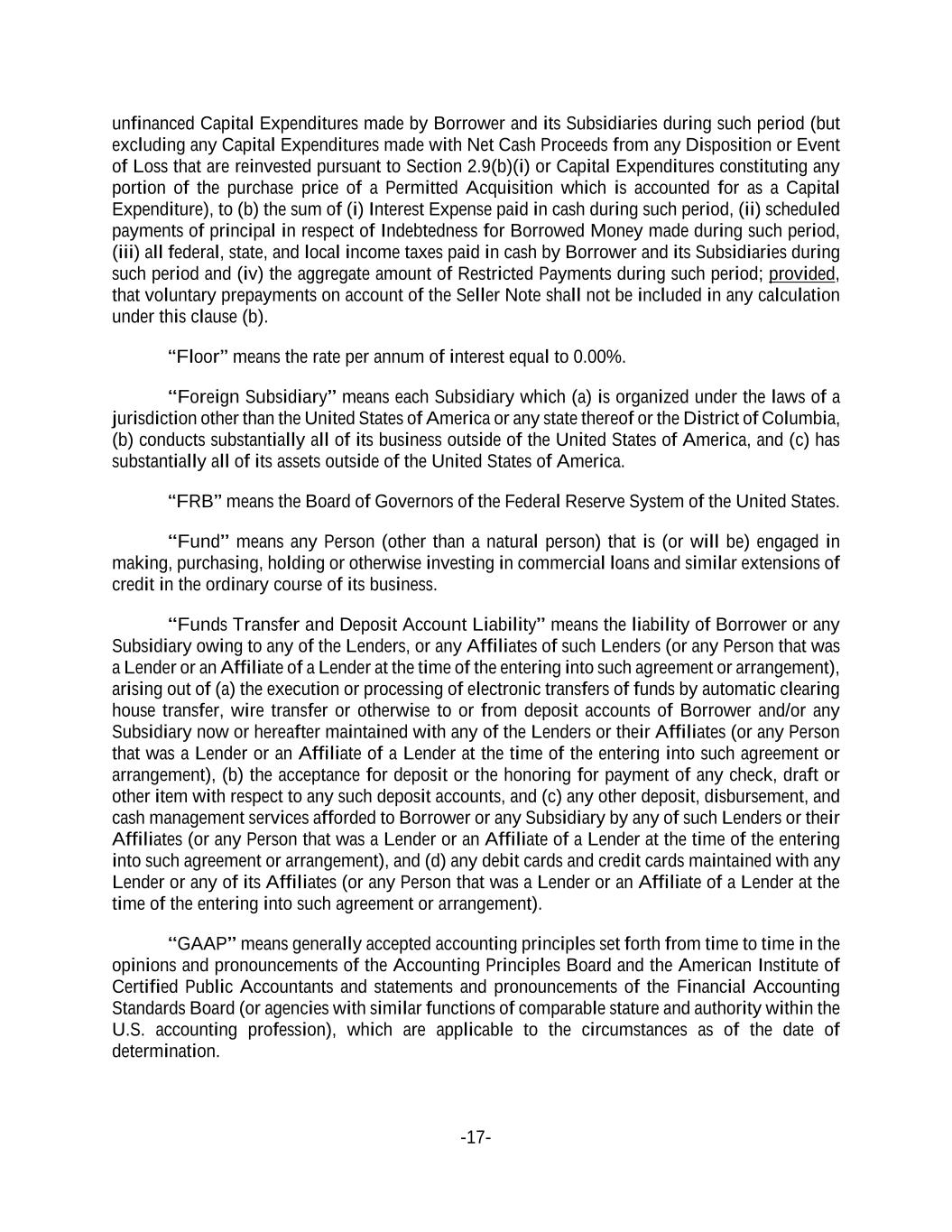 -17- unfinanced Capital Expenditures made by Borrower and its Subsidiaries during such period (but excluding any Capital Expenditures made with Net Cash Proceeds from any Disposition or Event of Loss that are reinvested pursuant to Section 2.9(b)(i) or Capital Expenditures constituting any portion of the purchase price of a Permitted Acquisition which is accounted for as a Capital Expenditure), to (b) the sum of (i) Interest Expense paid in cash during such period, (ii) scheduled payments of principal in respect of Indebtedness for Borrowed Money made during such period, (iii) all federal, state, and local income taxes paid in cash by Borrower and its Subsidiaries during such period and (iv) the aggregate amount of Restricted Payments during such period; provided, that voluntary prepayments on account of the Seller Note shall not be included in any calculation under this clause (b). “Floor” means the rate per annum of interest equal to 0.00%. “Foreign Subsidiary” means each Subsidiary which (a) is organized under the laws of a jurisdiction other than the United States of America or any state thereof or the District of Columbia, (b) conducts substantially all of its business outside of the United States of America, and (c) has substantially all of its assets outside of the United States of America. “FRB” means the Board of Governors of the Federal Reserve System of the United States. “Fund” means any Person (other than a natural person) that is (or will be) engaged in making, purchasing, holding or otherwise investing in commercial loans and similar extensions of credit in the ordinary course of its business. “Funds Transfer and Deposit Account Liability” means the liability of Borrower or any Subsidiary owing to any of the Lenders, or any Affiliates of such Lenders (or any Person that was a Lender or an Affiliate of a Lender at the time of the entering into such agreement or arrangement), arising out of (a) the execution or processing of electronic transfers of funds by automatic clearing house transfer, wire transfer or otherwise to or from deposit accounts of Borrower and/or any Subsidiary now or hereafter maintained with any of the Lenders or their Affiliates (or any Person that was a Lender or an Affiliate of a Lender at the time of the entering into such agreement or arrangement), (b) the acceptance for deposit or the honoring for payment of any check, draft or other item with respect to any such deposit accounts, and (c) any other deposit, disbursement, and cash management services afforded to Borrower or any Subsidiary by any of such Lenders or their Affiliates (or any Person that was a Lender or an Affiliate of a Lender at the time of the entering into such agreement or arrangement), and (d) any debit cards and credit cards maintained with any Lender or any of its Affiliates (or any Person that was a Lender or an Affiliate of a Lender at the time of the entering into such agreement or arrangement). “GAAP” means generally accepted accounting principles set forth from time to time in the opinions and pronouncements of the Accounting Principles Board and the American Institute of Certified Public Accountants and statements and pronouncements of the Financial Accounting Standards Board (or agencies with similar functions of comparable stature and authority within the U.S. accounting profession), which are applicable to the circumstances as of the date of determination.