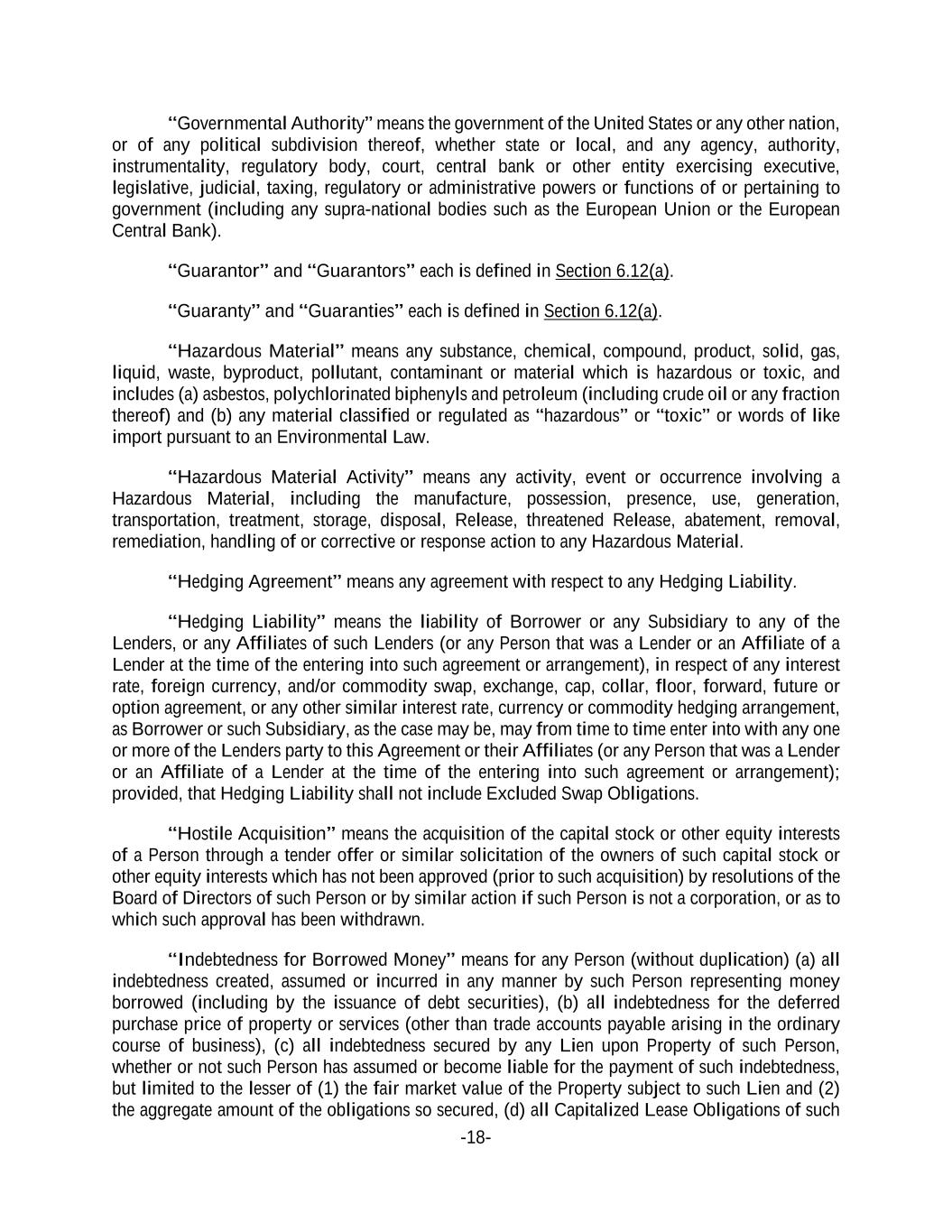 -18- “Governmental Authority” means the government of the United States or any other nation, or of any political subdivision thereof, whether state or local, and any agency, authority, instrumentality, regulatory body, court, central bank or other entity exercising executive, legislative, judicial, taxing, regulatory or administrative powers or functions of or pertaining to government (including any supra-national bodies such as the European Union or the European Central Bank). “Guarantor” and “Guarantors” each is defined in Section 6.12(a). “Guaranty” and “Guaranties” each is defined in Section 6.12(a). “Hazardous Material” means any substance, chemical, compound, product, solid, gas, liquid, waste, byproduct, pollutant, contaminant or material which is hazardous or toxic, and includes (a) asbestos, polychlorinated biphenyls and petroleum (including crude oil or any fraction thereof) and (b) any material classified or regulated as “hazardous” or “toxic” or words of like import pursuant to an Environmental Law. “Hazardous Material Activity” means any activity, event or occurrence involving a Hazardous Material, including the manufacture, possession, presence, use, generation, transportation, treatment, storage, disposal, Release, threatened Release, abatement, removal, remediation, handling of or corrective or response action to any Hazardous Material. “Hedging Agreement” means any agreement with respect to any Hedging Liability. “Hedging Liability” means the liability of Borrower or any Subsidiary to any of the Lenders, or any Affiliates of such Lenders (or any Person that was a Lender or an Affiliate of a Lender at the time of the entering into such agreement or arrangement), in respect of any interest rate, foreign currency, and/or commodity swap, exchange, cap, collar, floor, forward, future or option agreement, or any other similar interest rate, currency or commodity hedging arrangement, as Borrower or such Subsidiary, as the case may be, may from time to time enter into with any one or more of the Lenders party to this Agreement or their Affiliates (or any Person that was a Lender or an Affiliate of a Lender at the time of the entering into such agreement or arrangement); provided, that Hedging Liability shall not include Excluded Swap Obligations. “Hostile Acquisition” means the acquisition of the capital stock or other equity interests of a Person through a tender offer or similar solicitation of the owners of such capital stock or other equity interests which has not been approved (prior to such acquisition) by resolutions of the Board of Directors of such Person or by similar action if such Person is not a corporation, or as to which such approval has been withdrawn. “Indebtedness for Borrowed Money” means for any Person (without duplication) (a) all indebtedness created, assumed or incurred in any manner by such Person representing money borrowed (including by the issuance of debt securities), (b) all indebtedness for the deferred purchase price of property or services (other than trade accounts payable arising in the ordinary course of business), (c) all indebtedness secured by any Lien upon Property of such Person, whether or not such Person has assumed or become liable for the payment of such indebtedness, but limited to the lesser of (1) the fair market value of the Property subject to such Lien and (2) the aggregate amount of the obligations so secured, (d) all Capitalized Lease Obligations of such