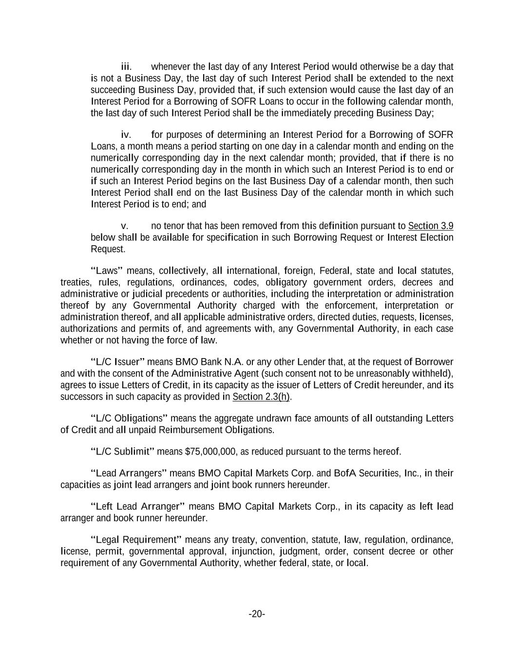 -20- iii. whenever the last day of any Interest Period would otherwise be a day that is not a Business Day, the last day of such Interest Period shall be extended to the next succeeding Business Day, provided that, if such extension would cause the last day of an Interest Period for a Borrowing of SOFR Loans to occur in the following calendar month, the last day of such Interest Period shall be the immediately preceding Business Day; iv. for purposes of determining an Interest Period for a Borrowing of SOFR Loans, a month means a period starting on one day in a calendar month and ending on the numerically corresponding day in the next calendar month; provided, that if there is no numerically corresponding day in the month in which such an Interest Period is to end or if such an Interest Period begins on the last Business Day of a calendar month, then such Interest Period shall end on the last Business Day of the calendar month in which such Interest Period is to end; and v. no tenor that has been removed from this definition pursuant to Section 3.9 below shall be available for specification in such Borrowing Request or Interest Election Request. “Laws” means, collectively, all international, foreign, Federal, state and local statutes, treaties, rules, regulations, ordinances, codes, obligatory government orders, decrees and administrative or judicial precedents or authorities, including the interpretation or administration thereof by any Governmental Authority charged with the enforcement, interpretation or administration thereof, and all applicable administrative orders, directed duties, requests, licenses, authorizations and permits of, and agreements with, any Governmental Authority, in each case whether or not having the force of law. “L/C Issuer” means BMO Bank N.A. or any other Lender that, at the request of Borrower and with the consent of the Administrative Agent (such consent not to be unreasonably withheld), agrees to issue Letters of Credit, in its capacity as the issuer of Letters of Credit hereunder, and its successors in such capacity as provided in Section 2.3(h). “L/C Obligations” means the aggregate undrawn face amounts of all outstanding Letters of Credit and all unpaid Reimbursement Obligations. “L/C Sublimit” means $75,000,000, as reduced pursuant to the terms hereof. “Lead Arrangers” means BMO Capital Markets Corp. and BofA Securities, Inc., in their capacities as joint lead arrangers and joint book runners hereunder. “Left Lead Arranger” means BMO Capital Markets Corp., in its capacity as left lead arranger and book runner hereunder. “Legal Requirement” means any treaty, convention, statute, law, regulation, ordinance, license, permit, governmental approval, injunction, judgment, order, consent decree or other requirement of any Governmental Authority, whether federal, state, or local.