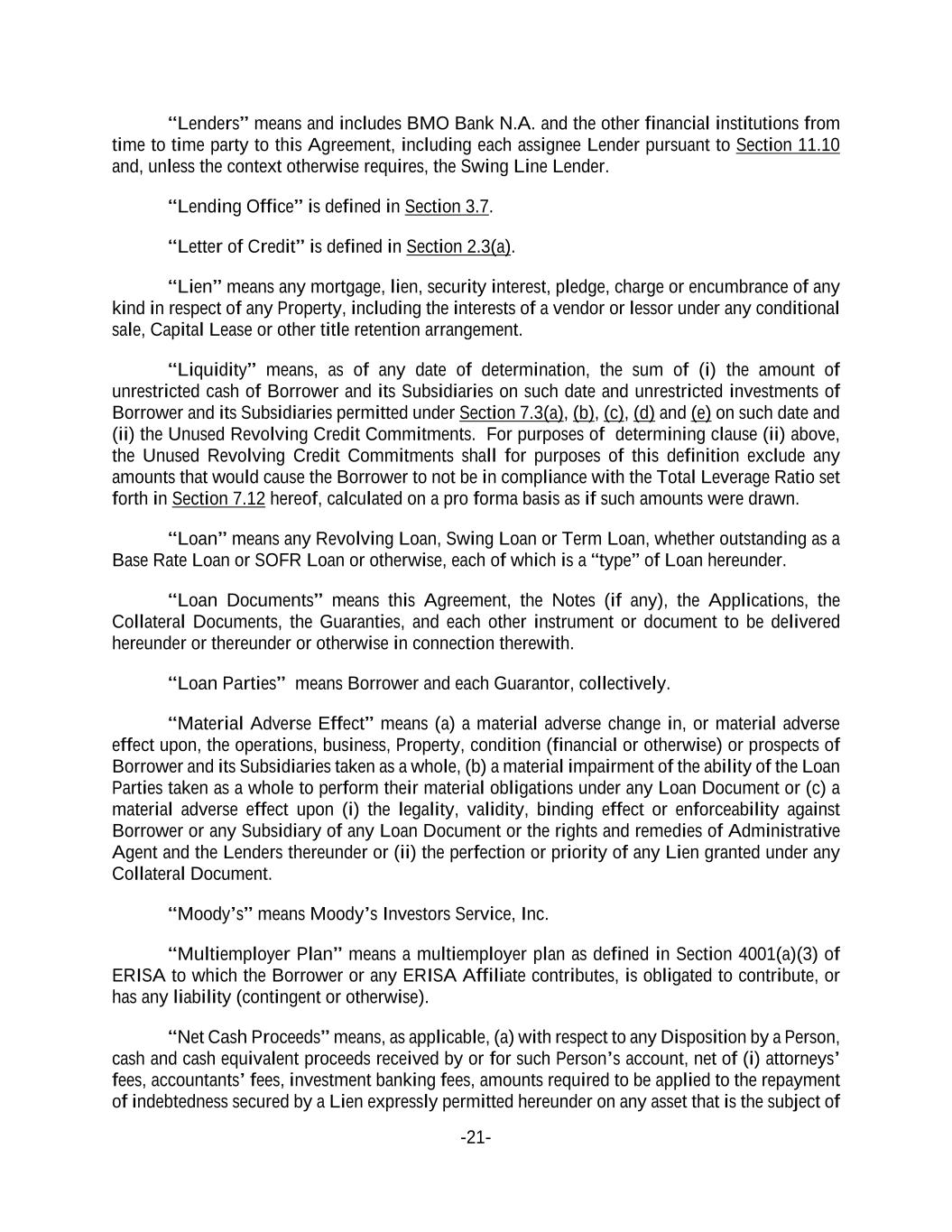 -21- “Lenders” means and includes BMO Bank N.A. and the other financial institutions from time to time party to this Agreement, including each assignee Lender pursuant to Section 11.10 and, unless the context otherwise requires, the Swing Line Lender. “Lending Office” is defined in Section 3.7. “Letter of Credit” is defined in Section 2.3(a). “Lien” means any mortgage, lien, security interest, pledge, charge or encumbrance of any kind in respect of any Property, including the interests of a vendor or lessor under any conditional sale, Capital Lease or other title retention arrangement. “Liquidity” means, as of any date of determination, the sum of (i) the amount of unrestricted cash of Borrower and its Subsidiaries on such date and unrestricted investments of Borrower and its Subsidiaries permitted under Section 7.3(a), (b), (c), (d) and (e) on such date and (ii) the Unused Revolving Credit Commitments. For purposes of determining clause (ii) above, the Unused Revolving Credit Commitments shall for purposes of this definition exclude any amounts that would cause the Borrower to not be in compliance with the Total Leverage Ratio set forth in Section 7.12 hereof, calculated on a pro forma basis as if such amounts were drawn. “Loan” means any Revolving Loan, Swing Loan or Term Loan, whether outstanding as a Base Rate Loan or SOFR Loan or otherwise, each of which is a “type” of Loan hereunder. “Loan Documents” means this Agreement, the Notes (if any), the Applications, the Collateral Documents, the Guaranties, and each other instrument or document to be delivered hereunder or thereunder or otherwise in connection therewith. “Loan Parties” means Borrower and each Guarantor, collectively. “Material Adverse Effect” means (a) a material adverse change in, or material adverse effect upon, the operations, business, Property, condition (financial or otherwise) or prospects of Borrower and its Subsidiaries taken as a whole, (b) a material impairment of the ability of the Loan Parties taken as a whole to perform their material obligations under any Loan Document or (c) a material adverse effect upon (i) the legality, validity, binding effect or enforceability against Borrower or any Subsidiary of any Loan Document or the rights and remedies of Administrative Agent and the Lenders thereunder or (ii) the perfection or priority of any Lien granted under any Collateral Document. “Moody’s” means Moody’s Investors Service, Inc. “Multiemployer Plan” means a multiemployer plan as defined in Section 4001(a)(3) of ERISA to which the Borrower or any ERISA Affiliate contributes, is obligated to contribute, or has any liability (contingent or otherwise). “Net Cash Proceeds” means, as applicable, (a) with respect to any Disposition by a Person, cash and cash equivalent proceeds received by or for such Person’s account, net of (i) attorneys’ fees, accountants’ fees, investment banking fees, amounts required to be applied to the repayment of indebtedness secured by a Lien expressly permitted hereunder on any asset that is the subject of