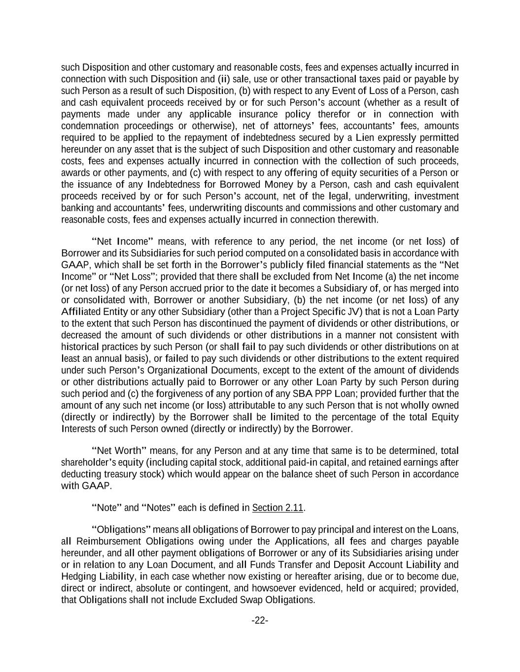 -22- such Disposition and other customary and reasonable costs, fees and expenses actually incurred in connection with such Disposition and (ii) sale, use or other transactional taxes paid or payable by such Person as a result of such Disposition, (b) with respect to any Event of Loss of a Person, cash and cash equivalent proceeds received by or for such Person’s account (whether as a result of payments made under any applicable insurance policy therefor or in connection with condemnation proceedings or otherwise), net of attorneys’ fees, accountants’ fees, amounts required to be applied to the repayment of indebtedness secured by a Lien expressly permitted hereunder on any asset that is the subject of such Disposition and other customary and reasonable costs, fees and expenses actually incurred in connection with the collection of such proceeds, awards or other payments, and (c) with respect to any offering of equity securities of a Person or the issuance of any Indebtedness for Borrowed Money by a Person, cash and cash equivalent proceeds received by or for such Person’s account, net of the legal, underwriting, investment banking and accountants’ fees, underwriting discounts and commissions and other customary and reasonable costs, fees and expenses actually incurred in connection therewith. “Net Income” means, with reference to any period, the net income (or net loss) of Borrower and its Subsidiaries for such period computed on a consolidated basis in accordance with GAAP, which shall be set forth in the Borrower’s publicly filed financial statements as the “Net Income” or “Net Loss”; provided that there shall be excluded from Net Income (a) the net income (or net loss) of any Person accrued prior to the date it becomes a Subsidiary of, or has merged into or consolidated with, Borrower or another Subsidiary, (b) the net income (or net loss) of any Affiliated Entity or any other Subsidiary (other than a Project Specific JV) that is not a Loan Party to the extent that such Person has discontinued the payment of dividends or other distributions, or decreased the amount of such dividends or other distributions in a manner not consistent with historical practices by such Person (or shall fail to pay such dividends or other distributions on at least an annual basis), or failed to pay such dividends or other distributions to the extent required under such Person’s Organizational Documents, except to the extent of the amount of dividends or other distributions actually paid to Borrower or any other Loan Party by such Person during such period and (c) the forgiveness of any portion of any SBA PPP Loan; provided further that the amount of any such net income (or loss) attributable to any such Person that is not wholly owned (directly or indirectly) by the Borrower shall be limited to the percentage of the total Equity Interests of such Person owned (directly or indirectly) by the Borrower. “Net Worth” means, for any Person and at any time that same is to be determined, total shareholder’s equity (including capital stock, additional paid-in capital, and retained earnings after deducting treasury stock) which would appear on the balance sheet of such Person in accordance with GAAP. “Note” and “Notes” each is defined in Section 2.11. “Obligations” means all obligations of Borrower to pay principal and interest on the Loans, all Reimbursement Obligations owing under the Applications, all fees and charges payable hereunder, and all other payment obligations of Borrower or any of its Subsidiaries arising under or in relation to any Loan Document, and all Funds Transfer and Deposit Account Liability and Hedging Liability, in each case whether now existing or hereafter arising, due or to become due, direct or indirect, absolute or contingent, and howsoever evidenced, held or acquired; provided, that Obligations shall not include Excluded Swap Obligations.