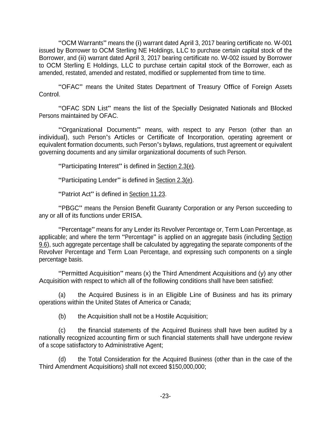 -23- “OCM Warrants” means the (i) warrant dated April 3, 2017 bearing certificate no. W-001 issued by Borrower to OCM Sterling NE Holdings, LLC to purchase certain capital stock of the Borrower, and (ii) warrant dated April 3, 2017 bearing certificate no. W-002 issued by Borrower to OCM Sterling E Holdings, LLC to purchase certain capital stock of the Borrower, each as amended, restated, amended and restated, modified or supplemented from time to time. “OFAC” means the United States Department of Treasury Office of Foreign Assets Control. “OFAC SDN List” means the list of the Specially Designated Nationals and Blocked Persons maintained by OFAC. “Organizational Documents” means, with respect to any Person (other than an individual), such Person’s Articles or Certificate of Incorporation, operating agreement or equivalent formation documents, such Person’s bylaws, regulations, trust agreement or equivalent governing documents and any similar organizational documents of such Person. “Participating Interest” is defined in Section 2.3(e). “Participating Lender” is defined in Section 2.3(e). “Patriot Act” is defined in Section 11.23. “PBGC” means the Pension Benefit Guaranty Corporation or any Person succeeding to any or all of its functions under ERISA. “Percentage” means for any Lender its Revolver Percentage or, Term Loan Percentage, as applicable; and where the term “Percentage” is applied on an aggregate basis (including Section 9.6), such aggregate percentage shall be calculated by aggregating the separate components of the Revolver Percentage and Term Loan Percentage, and expressing such components on a single percentage basis. “Permitted Acquisition” means (x) the Third Amendment Acquisitions and (y) any other Acquisition with respect to which all of the following conditions shall have been satisfied: (a) the Acquired Business is in an Eligible Line of Business and has its primary operations within the United States of America or Canada; (b) the Acquisition shall not be a Hostile Acquisition; (c) the financial statements of the Acquired Business shall have been audited by a nationally recognized accounting firm or such financial statements shall have undergone review of a scope satisfactory to Administrative Agent; (d) the Total Consideration for the Acquired Business (other than in the case of the Third Amendment Acquisitions) shall not exceed $150,000,000;