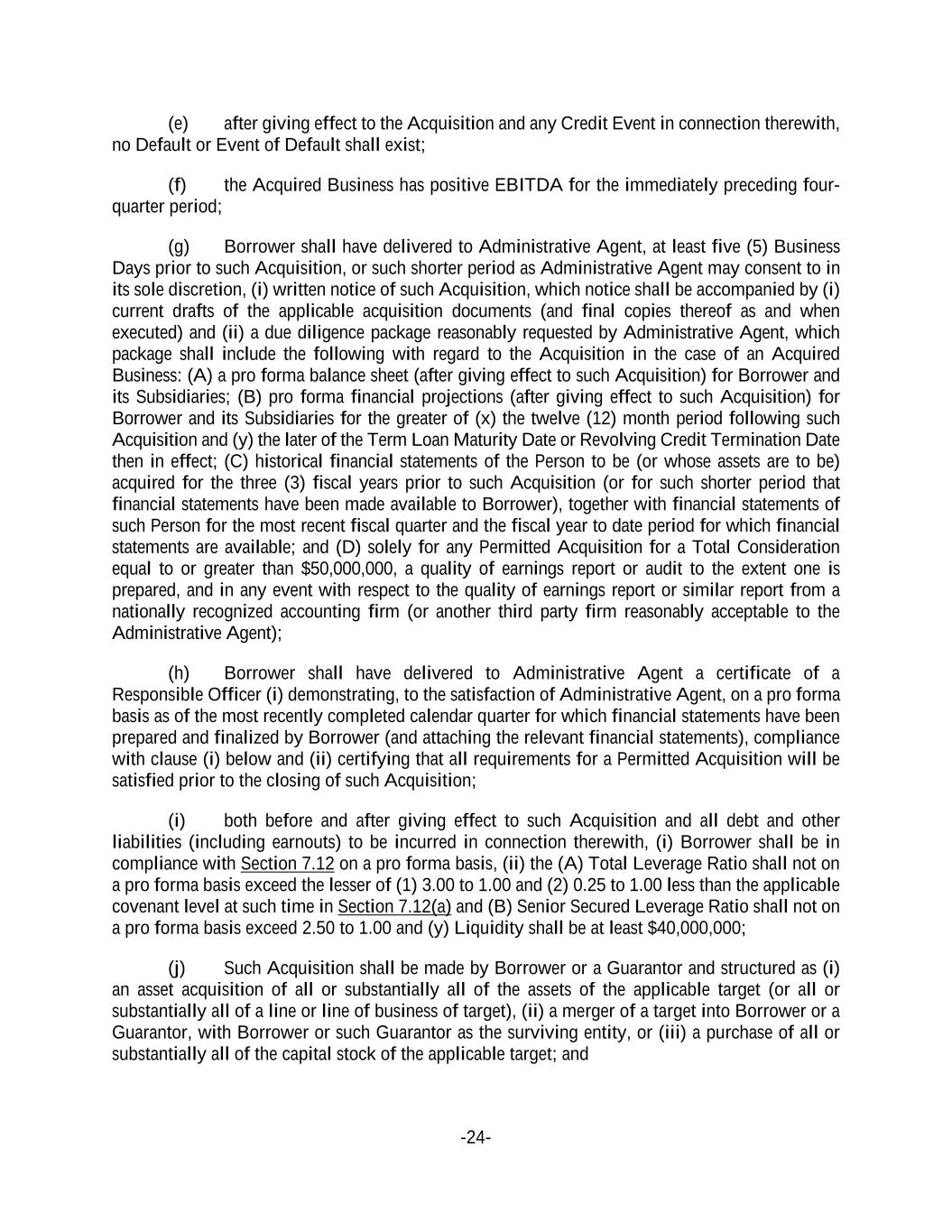 -24- (e) after giving effect to the Acquisition and any Credit Event in connection therewith, no Default or Event of Default shall exist; (f) the Acquired Business has positive EBITDA for the immediately preceding four- quarter period; (g) Borrower shall have delivered to Administrative Agent, at least five (5) Business Days prior to such Acquisition, or such shorter period as Administrative Agent may consent to in its sole discretion, (i) written notice of such Acquisition, which notice shall be accompanied by (i) current drafts of the applicable acquisition documents (and final copies thereof as and when executed) and (ii) a due diligence package reasonably requested by Administrative Agent, which package shall include the following with regard to the Acquisition in the case of an Acquired Business: (A) a pro forma balance sheet (after giving effect to such Acquisition) for Borrower and its Subsidiaries; (B) pro forma financial projections (after giving effect to such Acquisition) for Borrower and its Subsidiaries for the greater of (x) the twelve (12) month period following such Acquisition and (y) the later of the Term Loan Maturity Date or Revolving Credit Termination Date then in effect; (C) historical financial statements of the Person to be (or whose assets are to be) acquired for the three (3) fiscal years prior to such Acquisition (or for such shorter period that financial statements have been made available to Borrower), together with financial statements of such Person for the most recent fiscal quarter and the fiscal year to date period for which financial statements are available; and (D) solely for any Permitted Acquisition for a Total Consideration equal to or greater than $50,000,000, a quality of earnings report or audit to the extent one is prepared, and in any event with respect to the quality of earnings report or similar report from a nationally recognized accounting firm (or another third party firm reasonably acceptable to the Administrative Agent); (h) Borrower shall have delivered to Administrative Agent a certificate of a Responsible Officer (i) demonstrating, to the satisfaction of Administrative Agent, on a pro forma basis as of the most recently completed calendar quarter for which financial statements have been prepared and finalized by Borrower (and attaching the relevant financial statements), compliance with clause (i) below and (ii) certifying that all requirements for a Permitted Acquisition will be satisfied prior to the closing of such Acquisition; (i) both before and after giving effect to such Acquisition and all debt and other liabilities (including earnouts) to be incurred in connection therewith, (i) Borrower shall be in compliance with Section 7.12 on a pro forma basis, (ii) the (A) Total Leverage Ratio shall not on a pro forma basis exceed the lesser of (1) 3.00 to 1.00 and (2) 0.25 to 1.00 less than the applicable covenant level at such time in Section 7.12(a) and (B) Senior Secured Leverage Ratio shall not on a pro forma basis exceed 2.50 to 1.00 and (y) Liquidity shall be at least $40,000,000; (j) Such Acquisition shall be made by Borrower or a Guarantor and structured as (i) an asset acquisition of all or substantially all of the assets of the applicable target (or all or substantially all of a line or line of business of target), (ii) a merger of a target into Borrower or a Guarantor, with Borrower or such Guarantor as the surviving entity, or (iii) a purchase of all or substantially all of the capital stock of the applicable target; and