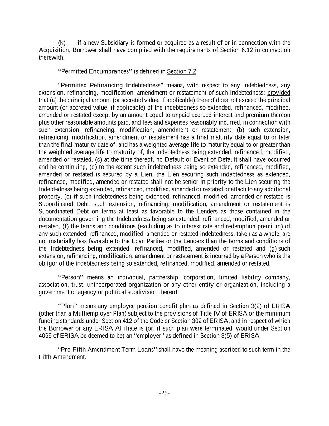 -25- (k) if a new Subsidiary is formed or acquired as a result of or in connection with the Acquisition, Borrower shall have complied with the requirements of Section 6.12 in connection therewith. “Permitted Encumbrances” is defined in Section 7.2. “Permitted Refinancing Indebtedness” means, with respect to any indebtedness, any extension, refinancing, modification, amendment or restatement of such indebtedness; provided that (a) the principal amount (or accreted value, if applicable) thereof does not exceed the principal amount (or accreted value, if applicable) of the indebtedness so extended, refinanced, modified, amended or restated except by an amount equal to unpaid accrued interest and premium thereon plus other reasonable amounts paid, and fees and expenses reasonably incurred, in connection with such extension, refinancing, modification, amendment or restatement, (b) such extension, refinancing, modification, amendment or restatement has a final maturity date equal to or later than the final maturity date of, and has a weighted average life to maturity equal to or greater than the weighted average life to maturity of, the indebtedness being extended, refinanced, modified, amended or restated, (c) at the time thereof, no Default or Event of Default shall have occurred and be continuing, (d) to the extent such indebtedness being so extended, refinanced, modified, amended or restated is secured by a Lien, the Lien securing such indebtedness as extended, refinanced, modified, amended or restated shall not be senior in priority to the Lien securing the Indebtedness being extended, refinanced, modified, amended or restated or attach to any additional property, (e) if such indebtedness being extended, refinanced, modified, amended or restated is Subordinated Debt, such extension, refinancing, modification, amendment or restatement is Subordinated Debt on terms at least as favorable to the Lenders as those contained in the documentation governing the Indebtedness being so extended, refinanced, modified, amended or restated, (f) the terms and conditions (excluding as to interest rate and redemption premium) of any such extended, refinanced, modified, amended or restated indebtedness, taken as a whole, are not materially less favorable to the Loan Parties or the Lenders than the terms and conditions of the Indebtedness being extended, refinanced, modified, amended or restated and (g) such extension, refinancing, modification, amendment or restatement is incurred by a Person who is the obligor of the indebtedness being so extended, refinanced, modified, amended or restated. “Person” means an individual, partnership, corporation, limited liability company, association, trust, unincorporated organization or any other entity or organization, including a government or agency or political subdivision thereof. “Plan” means any employee pension benefit plan as defined in Section 3(2) of ERISA (other than a Multiemployer Plan) subject to the provisions of Title IV of ERISA or the minimum funding standards under Section 412 of the Code or Section 302 of ERISA, and in respect of which the Borrower or any ERISA Affiliate is (or, if such plan were terminated, would under Section 4069 of ERISA be deemed to be) an “employer” as defined in Section 3(5) of ERISA. “Pre-Fifth Amendment Term Loans” shall have the meaning ascribed to such term in the Fifth Amendment.