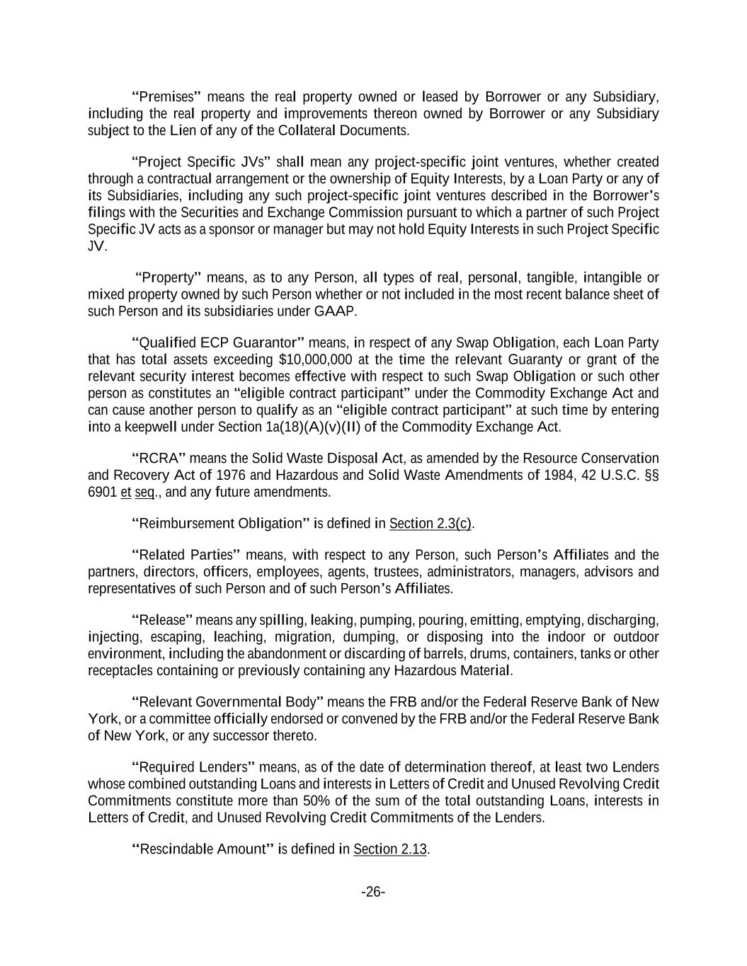 -26- “Premises” means the real property owned or leased by Borrower or any Subsidiary, including the real property and improvements thereon owned by Borrower or any Subsidiary subject to the Lien of any of the Collateral Documents. “Project Specific JVs” shall mean any project-specific joint ventures, whether created through a contractual arrangement or the ownership of Equity Interests, by a Loan Party or any of its Subsidiaries, including any such project-specific joint ventures described in the Borrower’s filings with the Securities and Exchange Commission pursuant to which a partner of such Project Specific JV acts as a sponsor or manager but may not hold Equity Interests in such Project Specific JV. “Property” means, as to any Person, all types of real, personal, tangible, intangible or mixed property owned by such Person whether or not included in the most recent balance sheet of such Person and its subsidiaries under GAAP. “Qualified ECP Guarantor” means, in respect of any Swap Obligation, each Loan Party that has total assets exceeding $10,000,000 at the time the relevant Guaranty or grant of the relevant security interest becomes effective with respect to such Swap Obligation or such other person as constitutes an “eligible contract participant” under the Commodity Exchange Act and can cause another person to qualify as an “eligible contract participant” at such time by entering into a keepwell under Section 1a(18)(A)(v)(II) of the Commodity Exchange Act. “RCRA” means the Solid Waste Disposal Act, as amended by the Resource Conservation and Recovery Act of 1976 and Hazardous and Solid Waste Amendments of 1984, 42 U.S.C. §§ 6901 et seq., and any future amendments. “Reimbursement Obligation” is defined in Section 2.3(c). “Related Parties” means, with respect to any Person, such Person’s Affiliates and the partners, directors, officers, employees, agents, trustees, administrators, managers, advisors and representatives of such Person and of such Person’s Affiliates. “Release” means any spilling, leaking, pumping, pouring, emitting, emptying, discharging, injecting, escaping, leaching, migration, dumping, or disposing into the indoor or outdoor environment, including the abandonment or discarding of barrels, drums, containers, tanks or other receptacles containing or previously containing any Hazardous Material. “Relevant Governmental Body” means the FRB and/or the Federal Reserve Bank of New York, or a committee officially endorsed or convened by the FRB and/or the Federal Reserve Bank of New York, or any successor thereto. “Required Lenders” means, as of the date of determination thereof, at least two Lenders whose combined outstanding Loans and interests in Letters of Credit and Unused Revolving Credit Commitments constitute more than 50% of the sum of the total outstanding Loans, interests in Letters of Credit, and Unused Revolving Credit Commitments of the Lenders. “Rescindable Amount” is defined in Section 2.13.