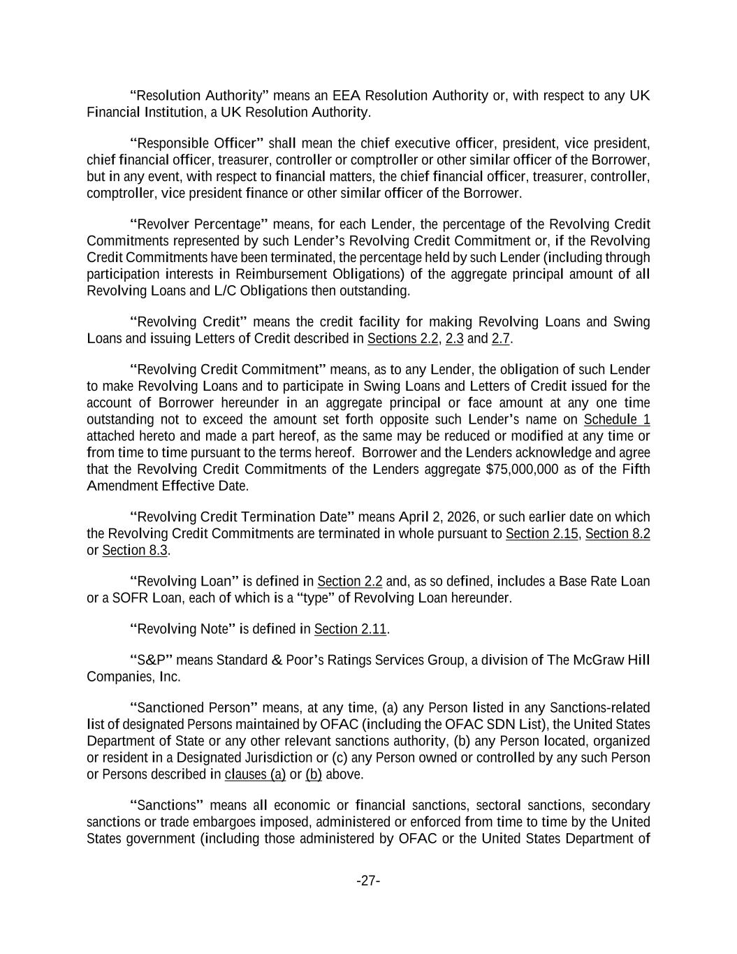 -27- “Resolution Authority” means an EEA Resolution Authority or, with respect to any UK Financial Institution, a UK Resolution Authority. “Responsible Officer” shall mean the chief executive officer, president, vice president, chief financial officer, treasurer, controller or comptroller or other similar officer of the Borrower, but in any event, with respect to financial matters, the chief financial officer, treasurer, controller, comptroller, vice president finance or other similar officer of the Borrower. “Revolver Percentage” means, for each Lender, the percentage of the Revolving Credit Commitments represented by such Lender’s Revolving Credit Commitment or, if the Revolving Credit Commitments have been terminated, the percentage held by such Lender (including through participation interests in Reimbursement Obligations) of the aggregate principal amount of all Revolving Loans and L/C Obligations then outstanding. “Revolving Credit” means the credit facility for making Revolving Loans and Swing Loans and issuing Letters of Credit described in Sections 2.2, 2.3 and 2.7. “Revolving Credit Commitment” means, as to any Lender, the obligation of such Lender to make Revolving Loans and to participate in Swing Loans and Letters of Credit issued for the account of Borrower hereunder in an aggregate principal or face amount at any one time outstanding not to exceed the amount set forth opposite such Lender’s name on Schedule 1 attached hereto and made a part hereof, as the same may be reduced or modified at any time or from time to time pursuant to the terms hereof. Borrower and the Lenders acknowledge and agree that the Revolving Credit Commitments of the Lenders aggregate $75,000,000 as of the Fifth Amendment Effective Date. “Revolving Credit Termination Date” means April 2, 2026, or such earlier date on which the Revolving Credit Commitments are terminated in whole pursuant to Section 2.15, Section 8.2 or Section 8.3. “Revolving Loan” is defined in Section 2.2 and, as so defined, includes a Base Rate Loan or a SOFR Loan, each of which is a “type” of Revolving Loan hereunder. “Revolving Note” is defined in Section 2.11. “S&P” means Standard & Poor’s Ratings Services Group, a division of The McGraw Hill Companies, Inc. “Sanctioned Person” means, at any time, (a) any Person listed in any Sanctions-related list of designated Persons maintained by OFAC (including the OFAC SDN List), the United States Department of State or any other relevant sanctions authority, (b) any Person located, organized or resident in a Designated Jurisdiction or (c) any Person owned or controlled by any such Person or Persons described in clauses (a) or (b) above. “Sanctions” means all economic or financial sanctions, sectoral sanctions, secondary sanctions or trade embargoes imposed, administered or enforced from time to time by the United States government (including those administered by OFAC or the United States Department of