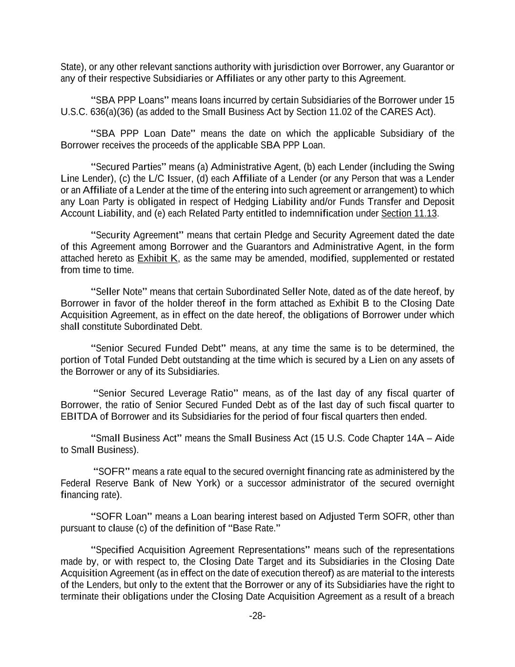 -28- State), or any other relevant sanctions authority with jurisdiction over Borrower, any Guarantor or any of their respective Subsidiaries or Affiliates or any other party to this Agreement. “SBA PPP Loans” means loans incurred by certain Subsidiaries of the Borrower under 15 U.S.C. 636(a)(36) (as added to the Small Business Act by Section 11.02 of the CARES Act). “SBA PPP Loan Date” means the date on which the applicable Subsidiary of the Borrower receives the proceeds of the applicable SBA PPP Loan. “Secured Parties” means (a) Administrative Agent, (b) each Lender (including the Swing Line Lender), (c) the L/C Issuer, (d) each Affiliate of a Lender (or any Person that was a Lender or an Affiliate of a Lender at the time of the entering into such agreement or arrangement) to which any Loan Party is obligated in respect of Hedging Liability and/or Funds Transfer and Deposit Account Liability, and (e) each Related Party entitled to indemnification under Section 11.13. “Security Agreement” means that certain Pledge and Security Agreement dated the date of this Agreement among Borrower and the Guarantors and Administrative Agent, in the form attached hereto as Exhibit K, as the same may be amended, modified, supplemented or restated from time to time. “Seller Note” means that certain Subordinated Seller Note, dated as of the date hereof, by Borrower in favor of the holder thereof in the form attached as Exhibit B to the Closing Date Acquisition Agreement, as in effect on the date hereof, the obligations of Borrower under which shall constitute Subordinated Debt. “Senior Secured Funded Debt” means, at any time the same is to be determined, the portion of Total Funded Debt outstanding at the time which is secured by a Lien on any assets of the Borrower or any of its Subsidiaries. “Senior Secured Leverage Ratio” means, as of the last day of any fiscal quarter of Borrower, the ratio of Senior Secured Funded Debt as of the last day of such fiscal quarter to EBITDA of Borrower and its Subsidiaries for the period of four fiscal quarters then ended. “Small Business Act” means the Small Business Act (15 U.S. Code Chapter 14A – Aide to Small Business). “SOFR” means a rate equal to the secured overnight financing rate as administered by the Federal Reserve Bank of New York) or a successor administrator of the secured overnight financing rate). “SOFR Loan” means a Loan bearing interest based on Adjusted Term SOFR, other than pursuant to clause (c) of the definition of “Base Rate.” “Specified Acquisition Agreement Representations” means such of the representations made by, or with respect to, the Closing Date Target and its Subsidiaries in the Closing Date Acquisition Agreement (as in effect on the date of execution thereof) as are material to the interests of the Lenders, but only to the extent that the Borrower or any of its Subsidiaries have the right to terminate their obligations under the Closing Date Acquisition Agreement as a result of a breach
