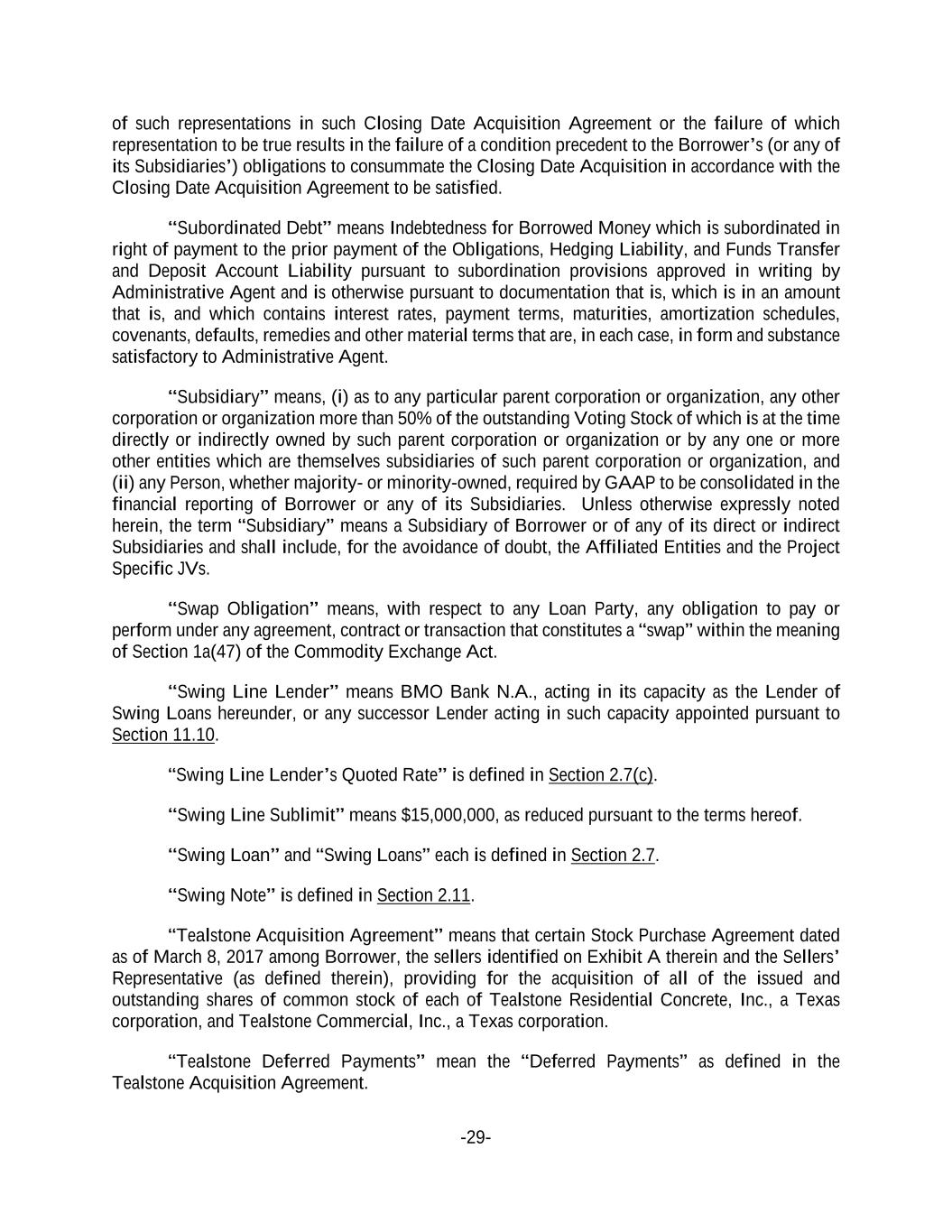 -29- of such representations in such Closing Date Acquisition Agreement or the failure of which representation to be true results in the failure of a condition precedent to the Borrower’s (or any of its Subsidiaries’) obligations to consummate the Closing Date Acquisition in accordance with the Closing Date Acquisition Agreement to be satisfied. “Subordinated Debt” means Indebtedness for Borrowed Money which is subordinated in right of payment to the prior payment of the Obligations, Hedging Liability, and Funds Transfer and Deposit Account Liability pursuant to subordination provisions approved in writing by Administrative Agent and is otherwise pursuant to documentation that is, which is in an amount that is, and which contains interest rates, payment terms, maturities, amortization schedules, covenants, defaults, remedies and other material terms that are, in each case, in form and substance satisfactory to Administrative Agent. “Subsidiary” means, (i) as to any particular parent corporation or organization, any other corporation or organization more than 50% of the outstanding Voting Stock of which is at the time directly or indirectly owned by such parent corporation or organization or by any one or more other entities which are themselves subsidiaries of such parent corporation or organization, and (ii) any Person, whether majority- or minority-owned, required by GAAP to be consolidated in the financial reporting of Borrower or any of its Subsidiaries. Unless otherwise expressly noted herein, the term “Subsidiary” means a Subsidiary of Borrower or of any of its direct or indirect Subsidiaries and shall include, for the avoidance of doubt, the Affiliated Entities and the Project Specific JVs. “Swap Obligation” means, with respect to any Loan Party, any obligation to pay or perform under any agreement, contract or transaction that constitutes a “swap” within the meaning of Section 1a(47) of the Commodity Exchange Act. “Swing Line Lender” means BMO Bank N.A., acting in its capacity as the Lender of Swing Loans hereunder, or any successor Lender acting in such capacity appointed pursuant to Section 11.10. “Swing Line Lender’s Quoted Rate” is defined in Section 2.7(c). “Swing Line Sublimit” means $15,000,000, as reduced pursuant to the terms hereof. “Swing Loan” and “Swing Loans” each is defined in Section 2.7. “Swing Note” is defined in Section 2.11. “Tealstone Acquisition Agreement” means that certain Stock Purchase Agreement dated as of March 8, 2017 among Borrower, the sellers identified on Exhibit A therein and the Sellers’ Representative (as defined therein), providing for the acquisition of all of the issued and outstanding shares of common stock of each of Tealstone Residential Concrete, Inc., a Texas corporation, and Tealstone Commercial, Inc., a Texas corporation. “Tealstone Deferred Payments” mean the “Deferred Payments” as defined in the Tealstone Acquisition Agreement.