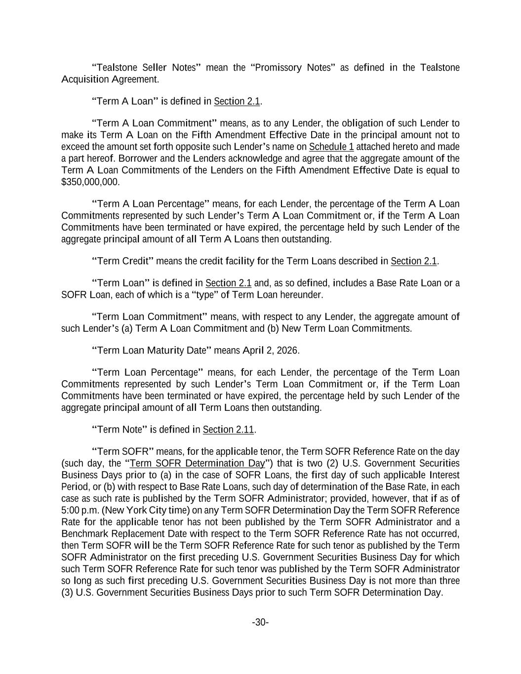 -30- “Tealstone Seller Notes” mean the “Promissory Notes” as defined in the Tealstone Acquisition Agreement. “Term A Loan” is defined in Section 2.1. “Term A Loan Commitment” means, as to any Lender, the obligation of such Lender to make its Term A Loan on the Fifth Amendment Effective Date in the principal amount not to exceed the amount set forth opposite such Lender’s name on Schedule 1 attached hereto and made a part hereof. Borrower and the Lenders acknowledge and agree that the aggregate amount of the Term A Loan Commitments of the Lenders on the Fifth Amendment Effective Date is equal to $350,000,000. “Term A Loan Percentage” means, for each Lender, the percentage of the Term A Loan Commitments represented by such Lender’s Term A Loan Commitment or, if the Term A Loan Commitments have been terminated or have expired, the percentage held by such Lender of the aggregate principal amount of all Term A Loans then outstanding. “Term Credit” means the credit facility for the Term Loans described in Section 2.1. “Term Loan” is defined in Section 2.1 and, as so defined, includes a Base Rate Loan or a SOFR Loan, each of which is a “type” of Term Loan hereunder. “Term Loan Commitment” means, with respect to any Lender, the aggregate amount of such Lender’s (a) Term A Loan Commitment and (b) New Term Loan Commitments. “Term Loan Maturity Date” means April 2, 2026. “Term Loan Percentage” means, for each Lender, the percentage of the Term Loan Commitments represented by such Lender’s Term Loan Commitment or, if the Term Loan Commitments have been terminated or have expired, the percentage held by such Lender of the aggregate principal amount of all Term Loans then outstanding. “Term Note” is defined in Section 2.11. “Term SOFR” means, for the applicable tenor, the Term SOFR Reference Rate on the day (such day, the “Term SOFR Determination Day”) that is two (2) U.S. Government Securities Business Days prior to (a) in the case of SOFR Loans, the first day of such applicable Interest Period, or (b) with respect to Base Rate Loans, such day of determination of the Base Rate, in each case as such rate is published by the Term SOFR Administrator; provided, however, that if as of 5:00 p.m. (New York City time) on any Term SOFR Determination Day the Term SOFR Reference Rate for the applicable tenor has not been published by the Term SOFR Administrator and a Benchmark Replacement Date with respect to the Term SOFR Reference Rate has not occurred, then Term SOFR will be the Term SOFR Reference Rate for such tenor as published by the Term SOFR Administrator on the first preceding U.S. Government Securities Business Day for which such Term SOFR Reference Rate for such tenor was published by the Term SOFR Administrator so long as such first preceding U.S. Government Securities Business Day is not more than three (3) U.S. Government Securities Business Days prior to such Term SOFR Determination Day.