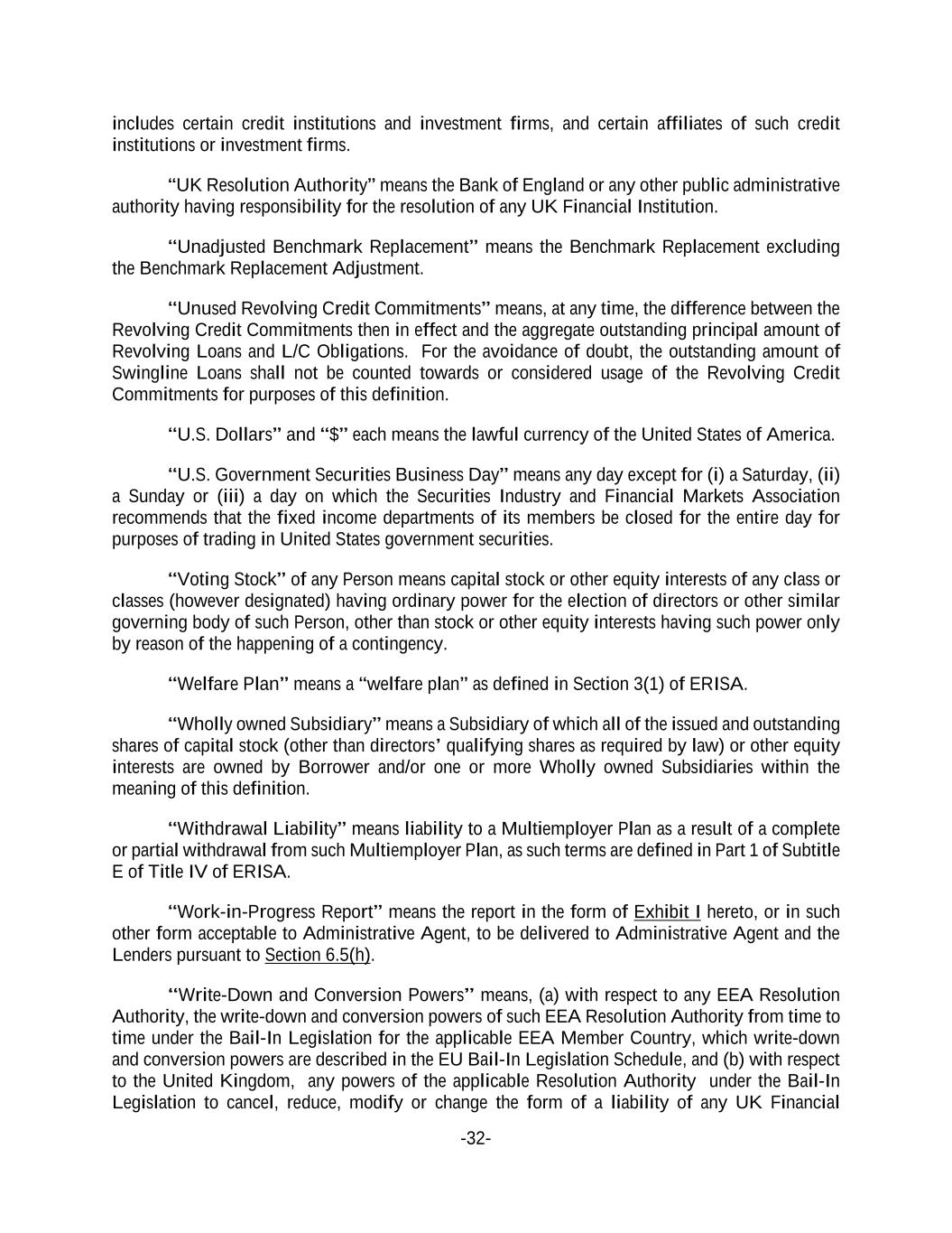 -32- includes certain credit institutions and investment firms, and certain affiliates of such credit institutions or investment firms. “UK Resolution Authority” means the Bank of England or any other public administrative authority having responsibility for the resolution of any UK Financial Institution. “Unadjusted Benchmark Replacement” means the Benchmark Replacement excluding the Benchmark Replacement Adjustment. “Unused Revolving Credit Commitments” means, at any time, the difference between the Revolving Credit Commitments then in effect and the aggregate outstanding principal amount of Revolving Loans and L/C Obligations. For the avoidance of doubt, the outstanding amount of Swingline Loans shall not be counted towards or considered usage of the Revolving Credit Commitments for purposes of this definition. “U.S. Dollars” and “$” each means the lawful currency of the United States of America. “U.S. Government Securities Business Day” means any day except for (i) a Saturday, (ii) a Sunday or (iii) a day on which the Securities Industry and Financial Markets Association recommends that the fixed income departments of its members be closed for the entire day for purposes of trading in United States government securities. “Voting Stock” of any Person means capital stock or other equity interests of any class or classes (however designated) having ordinary power for the election of directors or other similar governing body of such Person, other than stock or other equity interests having such power only by reason of the happening of a contingency. “Welfare Plan” means a “welfare plan” as defined in Section 3(1) of ERISA. “Wholly owned Subsidiary” means a Subsidiary of which all of the issued and outstanding shares of capital stock (other than directors’ qualifying shares as required by law) or other equity interests are owned by Borrower and/or one or more Wholly owned Subsidiaries within the meaning of this definition. “Withdrawal Liability” means liability to a Multiemployer Plan as a result of a complete or partial withdrawal from such Multiemployer Plan, as such terms are defined in Part 1 of Subtitle E of Title IV of ERISA. “Work-in-Progress Report” means the report in the form of Exhibit I hereto, or in such other form acceptable to Administrative Agent, to be delivered to Administrative Agent and the Lenders pursuant to Section 6.5(h). “Write-Down and Conversion Powers” means, (a) with respect to any EEA Resolution Authority, the write-down and conversion powers of such EEA Resolution Authority from time to time under the Bail-In Legislation for the applicable EEA Member Country, which write-down and conversion powers are described in the EU Bail-In Legislation Schedule, and (b) with respect to the United Kingdom, any powers of the applicable Resolution Authority under the Bail-In Legislation to cancel, reduce, modify or change the form of a liability of any UK Financial
