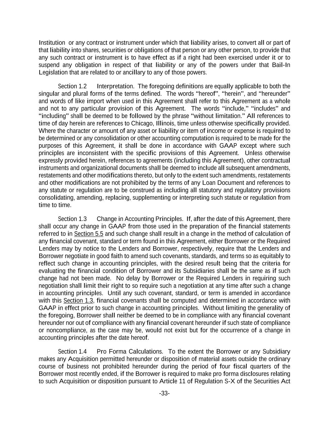 -33- Institution or any contract or instrument under which that liability arises, to convert all or part of that liability into shares, securities or obligations of that person or any other person, to provide that any such contract or instrument is to have effect as if a right had been exercised under it or to suspend any obligation in respect of that liability or any of the powers under that Bail-In Legislation that are related to or ancillary to any of those powers. Section 1.2 Interpretation. The foregoing definitions are equally applicable to both the singular and plural forms of the terms defined. The words “hereof”, “herein”, and “hereunder” and words of like import when used in this Agreement shall refer to this Agreement as a whole and not to any particular provision of this Agreement. The words “include,” “includes” and “including” shall be deemed to be followed by the phrase “without limitation.” All references to time of day herein are references to Chicago, Illinois, time unless otherwise specifically provided. Where the character or amount of any asset or liability or item of income or expense is required to be determined or any consolidation or other accounting computation is required to be made for the purposes of this Agreement, it shall be done in accordance with GAAP except where such principles are inconsistent with the specific provisions of this Agreement. Unless otherwise expressly provided herein, references to agreements (including this Agreement), other contractual instruments and organizational documents shall be deemed to include all subsequent amendments, restatements and other modifications thereto, but only to the extent such amendments, restatements and other modifications are not prohibited by the terms of any Loan Document and references to any statute or regulation are to be construed as including all statutory and regulatory provisions consolidating, amending, replacing, supplementing or interpreting such statute or regulation from time to time. Section 1.3 Change in Accounting Principles. If, after the date of this Agreement, there shall occur any change in GAAP from those used in the preparation of the financial statements referred to in Section 5.5 and such change shall result in a change in the method of calculation of any financial covenant, standard or term found in this Agreement, either Borrower or the Required Lenders may by notice to the Lenders and Borrower, respectively, require that the Lenders and Borrower negotiate in good faith to amend such covenants, standards, and terms so as equitably to reflect such change in accounting principles, with the desired result being that the criteria for evaluating the financial condition of Borrower and its Subsidiaries shall be the same as if such change had not been made. No delay by Borrower or the Required Lenders in requiring such negotiation shall limit their right to so require such a negotiation at any time after such a change in accounting principles. Until any such covenant, standard, or term is amended in accordance with this Section 1.3, financial covenants shall be computed and determined in accordance with GAAP in effect prior to such change in accounting principles. Without limiting the generality of the foregoing, Borrower shall neither be deemed to be in compliance with any financial covenant hereunder nor out of compliance with any financial covenant hereunder if such state of compliance or noncompliance, as the case may be, would not exist but for the occurrence of a change in accounting principles after the date hereof. Section 1.4 Pro Forma Calculations. To the extent the Borrower or any Subsidiary makes any Acquisition permitted hereunder or disposition of material assets outside the ordinary course of business not prohibited hereunder during the period of four fiscal quarters of the Borrower most recently ended, if the Borrower is required to make pro forma disclosures relating to such Acquisition or disposition pursuant to Article 11 of Regulation S-X of the Securities Act