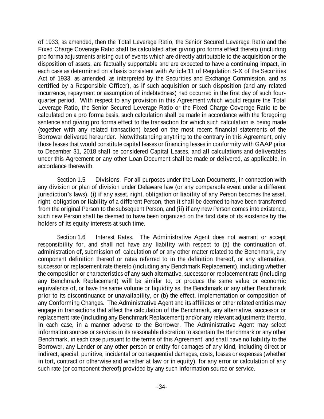 -34- of 1933, as amended, then the Total Leverage Ratio, the Senior Secured Leverage Ratio and the Fixed Charge Coverage Ratio shall be calculated after giving pro forma effect thereto (including pro forma adjustments arising out of events which are directly attributable to the acquisition or the disposition of assets, are factually supportable and are expected to have a continuing impact, in each case as determined on a basis consistent with Article 11 of Regulation S-X of the Securities Act of 1933, as amended, as interpreted by the Securities and Exchange Commission, and as certified by a Responsible Officer), as if such acquisition or such disposition (and any related incurrence, repayment or assumption of indebtedness) had occurred in the first day of such four- quarter period. With respect to any provision in this Agreement which would require the Total Leverage Ratio, the Senior Secured Leverage Ratio or the Fixed Charge Coverage Ratio to be calculated on a pro forma basis, such calculation shall be made in accordance with the foregoing sentence and giving pro forma effect to the transaction for which such calculation is being made (together with any related transaction) based on the most recent financial statements of the Borrower delivered hereunder. Notwithstanding anything to the contrary in this Agreement, only those leases that would constitute capital leases or financing leases in conformity with GAAP prior to December 31, 2018 shall be considered Capital Leases, and all calculations and deliverables under this Agreement or any other Loan Document shall be made or delivered, as applicable, in accordance therewith. Section 1.5 Divisions. For all purposes under the Loan Documents, in connection with any division or plan of division under Delaware law (or any comparable event under a different jurisdiction’s laws), (i) if any asset, right, obligation or liability of any Person becomes the asset, right, obligation or liability of a different Person, then it shall be deemed to have been transferred from the original Person to the subsequent Person, and (ii) if any new Person comes into existence, such new Person shall be deemed to have been organized on the first date of its existence by the holders of its equity interests at such time. Section 1.6 Interest Rates. The Administrative Agent does not warrant or accept responsibility for, and shall not have any liability with respect to (a) the continuation of, administration of, submission of, calculation of or any other matter related to the Benchmark, any component definition thereof or rates referred to in the definition thereof, or any alternative, successor or replacement rate thereto (including any Benchmark Replacement), including whether the composition or characteristics of any such alternative, successor or replacement rate (including any Benchmark Replacement) will be similar to, or produce the same value or economic equivalence of, or have the same volume or liquidity as, the Benchmark or any other Benchmark prior to its discontinuance or unavailability, or (b) the effect, implementation or composition of any Conforming Changes. The Administrative Agent and its affiliates or other related entities may engage in transactions that affect the calculation of the Benchmark, any alternative, successor or replacement rate (including any Benchmark Replacement) and/or any relevant adjustments thereto, in each case, in a manner adverse to the Borrower. The Administrative Agent may select information sources or services in its reasonable discretion to ascertain the Benchmark or any other Benchmark, in each case pursuant to the terms of this Agreement, and shall have no liability to the Borrower, any Lender or any other person or entity for damages of any kind, including direct or indirect, special, punitive, incidental or consequential damages, costs, losses or expenses (whether in tort, contract or otherwise and whether at law or in equity), for any error or calculation of any such rate (or component thereof) provided by any such information source or service.