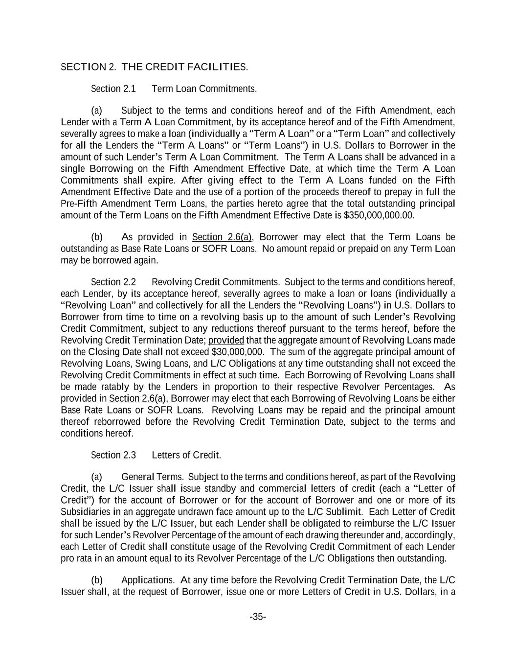 -35- SECTION 2. THE CREDIT FACILITIES. Section 2.1 Term Loan Commitments. (a) Subject to the terms and conditions hereof and of the Fifth Amendment, each Lender with a Term A Loan Commitment, by its acceptance hereof and of the Fifth Amendment, severally agrees to make a loan (individually a “Term A Loan” or a “Term Loan” and collectively for all the Lenders the “Term A Loans” or “Term Loans”) in U.S. Dollars to Borrower in the amount of such Lender’s Term A Loan Commitment. The Term A Loans shall be advanced in a single Borrowing on the Fifth Amendment Effective Date, at which time the Term A Loan Commitments shall expire. After giving effect to the Term A Loans funded on the Fifth Amendment Effective Date and the use of a portion of the proceeds thereof to prepay in full the Pre-Fifth Amendment Term Loans, the parties hereto agree that the total outstanding principal amount of the Term Loans on the Fifth Amendment Effective Date is $350,000,000.00. (b) As provided in Section 2.6(a), Borrower may elect that the Term Loans be outstanding as Base Rate Loans or SOFR Loans. No amount repaid or prepaid on any Term Loan may be borrowed again. Section 2.2 Revolving Credit Commitments. Subject to the terms and conditions hereof, each Lender, by its acceptance hereof, severally agrees to make a loan or loans (individually a “Revolving Loan” and collectively for all the Lenders the “Revolving Loans”) in U.S. Dollars to Borrower from time to time on a revolving basis up to the amount of such Lender’s Revolving Credit Commitment, subject to any reductions thereof pursuant to the terms hereof, before the Revolving Credit Termination Date; provided that the aggregate amount of Revolving Loans made on the Closing Date shall not exceed $30,000,000. The sum of the aggregate principal amount of Revolving Loans, Swing Loans, and L/C Obligations at any time outstanding shall not exceed the Revolving Credit Commitments in effect at such time. Each Borrowing of Revolving Loans shall be made ratably by the Lenders in proportion to their respective Revolver Percentages. As provided in Section 2.6(a), Borrower may elect that each Borrowing of Revolving Loans be either Base Rate Loans or SOFR Loans. Revolving Loans may be repaid and the principal amount thereof reborrowed before the Revolving Credit Termination Date, subject to the terms and conditions hereof. Section 2.3 Letters of Credit. (a) General Terms. Subject to the terms and conditions hereof, as part of the Revolving Credit, the L/C Issuer shall issue standby and commercial letters of credit (each a “Letter of Credit”) for the account of Borrower or for the account of Borrower and one or more of its Subsidiaries in an aggregate undrawn face amount up to the L/C Sublimit. Each Letter of Credit shall be issued by the L/C Issuer, but each Lender shall be obligated to reimburse the L/C Issuer for such Lender’s Revolver Percentage of the amount of each drawing thereunder and, accordingly, each Letter of Credit shall constitute usage of the Revolving Credit Commitment of each Lender pro rata in an amount equal to its Revolver Percentage of the L/C Obligations then outstanding. (b) Applications. At any time before the Revolving Credit Termination Date, the L/C Issuer shall, at the request of Borrower, issue one or more Letters of Credit in U.S. Dollars, in a
