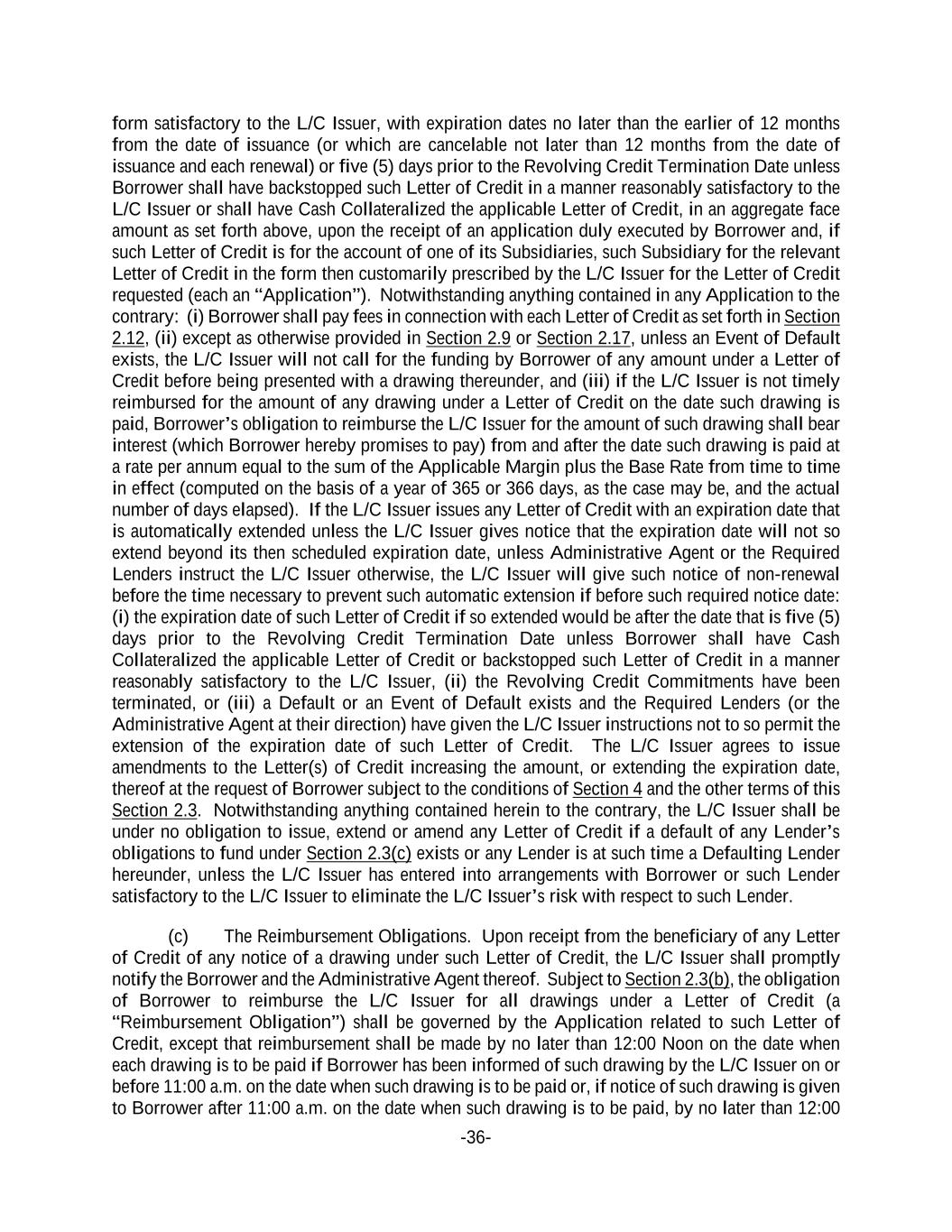 -36- form satisfactory to the L/C Issuer, with expiration dates no later than the earlier of 12 months from the date of issuance (or which are cancelable not later than 12 months from the date of issuance and each renewal) or five (5) days prior to the Revolving Credit Termination Date unless Borrower shall have backstopped such Letter of Credit in a manner reasonably satisfactory to the L/C Issuer or shall have Cash Collateralized the applicable Letter of Credit, in an aggregate face amount as set forth above, upon the receipt of an application duly executed by Borrower and, if such Letter of Credit is for the account of one of its Subsidiaries, such Subsidiary for the relevant Letter of Credit in the form then customarily prescribed by the L/C Issuer for the Letter of Credit requested (each an “Application”). Notwithstanding anything contained in any Application to the contrary: (i) Borrower shall pay fees in connection with each Letter of Credit as set forth in Section 2.12, (ii) except as otherwise provided in Section 2.9 or Section 2.17, unless an Event of Default exists, the L/C Issuer will not call for the funding by Borrower of any amount under a Letter of Credit before being presented with a drawing thereunder, and (iii) if the L/C Issuer is not timely reimbursed for the amount of any drawing under a Letter of Credit on the date such drawing is paid, Borrower’s obligation to reimburse the L/C Issuer for the amount of such drawing shall bear interest (which Borrower hereby promises to pay) from and after the date such drawing is paid at a rate per annum equal to the sum of the Applicable Margin plus the Base Rate from time to time in effect (computed on the basis of a year of 365 or 366 days, as the case may be, and the actual number of days elapsed). If the L/C Issuer issues any Letter of Credit with an expiration date that is automatically extended unless the L/C Issuer gives notice that the expiration date will not so extend beyond its then scheduled expiration date, unless Administrative Agent or the Required Lenders instruct the L/C Issuer otherwise, the L/C Issuer will give such notice of non-renewal before the time necessary to prevent such automatic extension if before such required notice date: (i) the expiration date of such Letter of Credit if so extended would be after the date that is five (5) days prior to the Revolving Credit Termination Date unless Borrower shall have Cash Collateralized the applicable Letter of Credit or backstopped such Letter of Credit in a manner reasonably satisfactory to the L/C Issuer, (ii) the Revolving Credit Commitments have been terminated, or (iii) a Default or an Event of Default exists and the Required Lenders (or the Administrative Agent at their direction) have given the L/C Issuer instructions not to so permit the extension of the expiration date of such Letter of Credit. The L/C Issuer agrees to issue amendments to the Letter(s) of Credit increasing the amount, or extending the expiration date, thereof at the request of Borrower subject to the conditions of Section 4 and the other terms of this Section 2.3. Notwithstanding anything contained herein to the contrary, the L/C Issuer shall be under no obligation to issue, extend or amend any Letter of Credit if a default of any Lender’s obligations to fund under Section 2.3(c) exists or any Lender is at such time a Defaulting Lender hereunder, unless the L/C Issuer has entered into arrangements with Borrower or such Lender satisfactory to the L/C Issuer to eliminate the L/C Issuer’s risk with respect to such Lender. (c) The Reimbursement Obligations. Upon receipt from the beneficiary of any Letter of Credit of any notice of a drawing under such Letter of Credit, the L/C Issuer shall promptly notify the Borrower and the Administrative Agent thereof. Subject to Section 2.3(b), the obligation of Borrower to reimburse the L/C Issuer for all drawings under a Letter of Credit (a “Reimbursement Obligation”) shall be governed by the Application related to such Letter of Credit, except that reimbursement shall be made by no later than 12:00 Noon on the date when each drawing is to be paid if Borrower has been informed of such drawing by the L/C Issuer on or before 11:00 a.m. on the date when such drawing is to be paid or, if notice of such drawing is given to Borrower after 11:00 a.m. on the date when such drawing is to be paid, by no later than 12:00