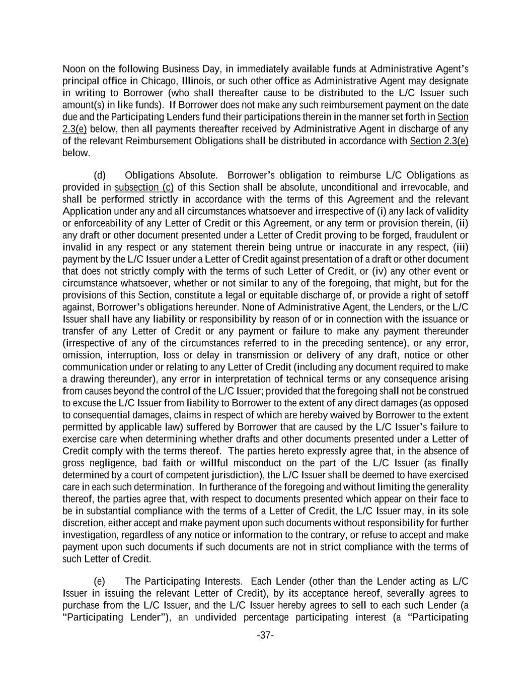 -37- Noon on the following Business Day, in immediately available funds at Administrative Agent’s principal office in Chicago, Illinois, or such other office as Administrative Agent may designate in writing to Borrower (who shall thereafter cause to be distributed to the L/C Issuer such amount(s) in like funds). If Borrower does not make any such reimbursement payment on the date due and the Participating Lenders fund their participations therein in the manner set forth in Section 2.3(e) below, then all payments thereafter received by Administrative Agent in discharge of any of the relevant Reimbursement Obligations shall be distributed in accordance with Section 2.3(e) below. (d) Obligations Absolute. Borrower’s obligation to reimburse L/C Obligations as provided in subsection (c) of this Section shall be absolute, unconditional and irrevocable, and shall be performed strictly in accordance with the terms of this Agreement and the relevant Application under any and all circumstances whatsoever and irrespective of (i) any lack of validity or enforceability of any Letter of Credit or this Agreement, or any term or provision therein, (ii) any draft or other document presented under a Letter of Credit proving to be forged, fraudulent or invalid in any respect or any statement therein being untrue or inaccurate in any respect, (iii) payment by the L/C Issuer under a Letter of Credit against presentation of a draft or other document that does not strictly comply with the terms of such Letter of Credit, or (iv) any other event or circumstance whatsoever, whether or not similar to any of the foregoing, that might, but for the provisions of this Section, constitute a legal or equitable discharge of, or provide a right of setoff against, Borrower’s obligations hereunder. None of Administrative Agent, the Lenders, or the L/C Issuer shall have any liability or responsibility by reason of or in connection with the issuance or transfer of any Letter of Credit or any payment or failure to make any payment thereunder (irrespective of any of the circumstances referred to in the preceding sentence), or any error, omission, interruption, loss or delay in transmission or delivery of any draft, notice or other communication under or relating to any Letter of Credit (including any document required to make a drawing thereunder), any error in interpretation of technical terms or any consequence arising from causes beyond the control of the L/C Issuer; provided that the foregoing shall not be construed to excuse the L/C Issuer from liability to Borrower to the extent of any direct damages (as opposed to consequential damages, claims in respect of which are hereby waived by Borrower to the extent permitted by applicable law) suffered by Borrower that are caused by the L/C Issuer’s failure to exercise care when determining whether drafts and other documents presented under a Letter of Credit comply with the terms thereof. The parties hereto expressly agree that, in the absence of gross negligence, bad faith or willful misconduct on the part of the L/C Issuer (as finally determined by a court of competent jurisdiction), the L/C Issuer shall be deemed to have exercised care in each such determination. In furtherance of the foregoing and without limiting the generality thereof, the parties agree that, with respect to documents presented which appear on their face to be in substantial compliance with the terms of a Letter of Credit, the L/C Issuer may, in its sole discretion, either accept and make payment upon such documents without responsibility for further investigation, regardless of any notice or information to the contrary, or refuse to accept and make payment upon such documents if such documents are not in strict compliance with the terms of such Letter of Credit. (e) The Participating Interests. Each Lender (other than the Lender acting as L/C Issuer in issuing the relevant Letter of Credit), by its acceptance hereof, severally agrees to purchase from the L/C Issuer, and the L/C Issuer hereby agrees to sell to each such Lender (a “Participating Lender”), an undivided percentage participating interest (a “Participating