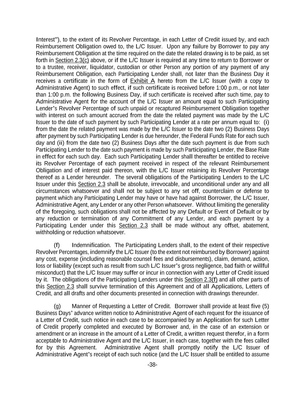 -38- Interest”), to the extent of its Revolver Percentage, in each Letter of Credit issued by, and each Reimbursement Obligation owed to, the L/C Issuer. Upon any failure by Borrower to pay any Reimbursement Obligation at the time required on the date the related drawing is to be paid, as set forth in Section 2.3(c) above, or if the L/C Issuer is required at any time to return to Borrower or to a trustee, receiver, liquidator, custodian or other Person any portion of any payment of any Reimbursement Obligation, each Participating Lender shall, not later than the Business Day it receives a certificate in the form of Exhibit A hereto from the L/C Issuer (with a copy to Administrative Agent) to such effect, if such certificate is received before 1:00 p.m., or not later than 1:00 p.m. the following Business Day, if such certificate is received after such time, pay to Administrative Agent for the account of the L/C Issuer an amount equal to such Participating Lender’s Revolver Percentage of such unpaid or recaptured Reimbursement Obligation together with interest on such amount accrued from the date the related payment was made by the L/C Issuer to the date of such payment by such Participating Lender at a rate per annum equal to: (i) from the date the related payment was made by the L/C Issuer to the date two (2) Business Days after payment by such Participating Lender is due hereunder, the Federal Funds Rate for each such day and (ii) from the date two (2) Business Days after the date such payment is due from such Participating Lender to the date such payment is made by such Participating Lender, the Base Rate in effect for each such day. Each such Participating Lender shall thereafter be entitled to receive its Revolver Percentage of each payment received in respect of the relevant Reimbursement Obligation and of interest paid thereon, with the L/C Issuer retaining its Revolver Percentage thereof as a Lender hereunder. The several obligations of the Participating Lenders to the L/C Issuer under this Section 2.3 shall be absolute, irrevocable, and unconditional under any and all circumstances whatsoever and shall not be subject to any set off, counterclaim or defense to payment which any Participating Lender may have or have had against Borrower, the L/C Issuer, Administrative Agent, any Lender or any other Person whatsoever. Without limiting the generality of the foregoing, such obligations shall not be affected by any Default or Event of Default or by any reduction or termination of any Commitment of any Lender, and each payment by a Participating Lender under this Section 2.3 shall be made without any offset, abatement, withholding or reduction whatsoever. (f) Indemnification. The Participating Lenders shall, to the extent of their respective Revolver Percentages, indemnify the L/C Issuer (to the extent not reimbursed by Borrower) against any cost, expense (including reasonable counsel fees and disbursements), claim, demand, action, loss or liability (except such as result from such L/C Issuer’s gross negligence, bad faith or willful misconduct) that the L/C Issuer may suffer or incur in connection with any Letter of Credit issued by it. The obligations of the Participating Lenders under this Section 2.3(f) and all other parts of this Section 2.3 shall survive termination of this Agreement and of all Applications, Letters of Credit, and all drafts and other documents presented in connection with drawings thereunder. (g) Manner of Requesting a Letter of Credit. Borrower shall provide at least five (5) Business Days’ advance written notice to Administrative Agent of each request for the issuance of a Letter of Credit, such notice in each case to be accompanied by an Application for such Letter of Credit properly completed and executed by Borrower and, in the case of an extension or amendment or an increase in the amount of a Letter of Credit, a written request therefor, in a form acceptable to Administrative Agent and the L/C Issuer, in each case, together with the fees called for by this Agreement. Administrative Agent shall promptly notify the L/C Issuer of Administrative Agent’s receipt of each such notice (and the L/C Issuer shall be entitled to assume