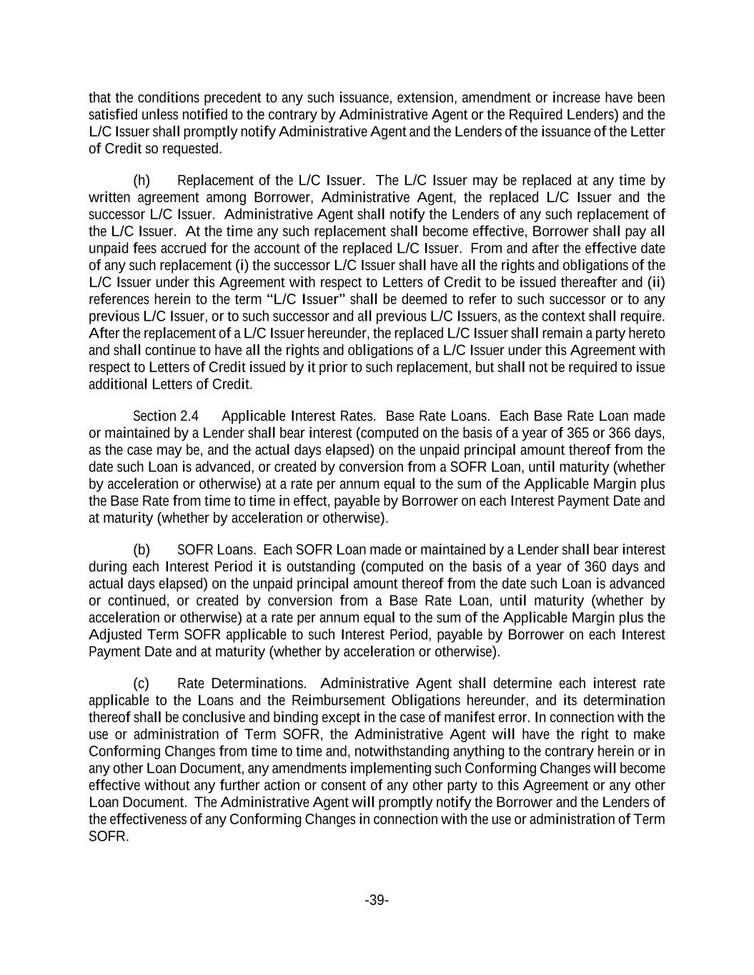 -39- that the conditions precedent to any such issuance, extension, amendment or increase have been satisfied unless notified to the contrary by Administrative Agent or the Required Lenders) and the L/C Issuer shall promptly notify Administrative Agent and the Lenders of the issuance of the Letter of Credit so requested. (h) Replacement of the L/C Issuer. The L/C Issuer may be replaced at any time by written agreement among Borrower, Administrative Agent, the replaced L/C Issuer and the successor L/C Issuer. Administrative Agent shall notify the Lenders of any such replacement of the L/C Issuer. At the time any such replacement shall become effective, Borrower shall pay all unpaid fees accrued for the account of the replaced L/C Issuer. From and after the effective date of any such replacement (i) the successor L/C Issuer shall have all the rights and obligations of the L/C Issuer under this Agreement with respect to Letters of Credit to be issued thereafter and (ii) references herein to the term “L/C Issuer” shall be deemed to refer to such successor or to any previous L/C Issuer, or to such successor and all previous L/C Issuers, as the context shall require. After the replacement of a L/C Issuer hereunder, the replaced L/C Issuer shall remain a party hereto and shall continue to have all the rights and obligations of a L/C Issuer under this Agreement with respect to Letters of Credit issued by it prior to such replacement, but shall not be required to issue additional Letters of Credit. Section 2.4 Applicable Interest Rates. Base Rate Loans. Each Base Rate Loan made or maintained by a Lender shall bear interest (computed on the basis of a year of 365 or 366 days, as the case may be, and the actual days elapsed) on the unpaid principal amount thereof from the date such Loan is advanced, or created by conversion from a SOFR Loan, until maturity (whether by acceleration or otherwise) at a rate per annum equal to the sum of the Applicable Margin plus the Base Rate from time to time in effect, payable by Borrower on each Interest Payment Date and at maturity (whether by acceleration or otherwise). (b) SOFR Loans. Each SOFR Loan made or maintained by a Lender shall bear interest during each Interest Period it is outstanding (computed on the basis of a year of 360 days and actual days elapsed) on the unpaid principal amount thereof from the date such Loan is advanced or continued, or created by conversion from a Base Rate Loan, until maturity (whether by acceleration or otherwise) at a rate per annum equal to the sum of the Applicable Margin plus the Adjusted Term SOFR applicable to such Interest Period, payable by Borrower on each Interest Payment Date and at maturity (whether by acceleration or otherwise). (c) Rate Determinations. Administrative Agent shall determine each interest rate applicable to the Loans and the Reimbursement Obligations hereunder, and its determination thereof shall be conclusive and binding except in the case of manifest error. In connection with the use or administration of Term SOFR, the Administrative Agent will have the right to make Conforming Changes from time to time and, notwithstanding anything to the contrary herein or in any other Loan Document, any amendments implementing such Conforming Changes will become effective without any further action or consent of any other party to this Agreement or any other Loan Document. The Administrative Agent will promptly notify the Borrower and the Lenders of the effectiveness of any Conforming Changes in connection with the use or administration of Term SOFR.