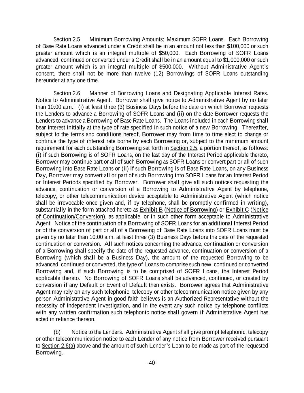 -40- Section 2.5 Minimum Borrowing Amounts; Maximum SOFR Loans. Each Borrowing of Base Rate Loans advanced under a Credit shall be in an amount not less than $100,000 or such greater amount which is an integral multiple of $50,000. Each Borrowing of SOFR Loans advanced, continued or converted under a Credit shall be in an amount equal to $1,000,000 or such greater amount which is an integral multiple of $500,000. Without Administrative Agent’s consent, there shall not be more than twelve (12) Borrowings of SOFR Loans outstanding hereunder at any one time. Section 2.6 Manner of Borrowing Loans and Designating Applicable Interest Rates. Notice to Administrative Agent. Borrower shall give notice to Administrative Agent by no later than 10:00 a.m.: (i) at least three (3) Business Days before the date on which Borrower requests the Lenders to advance a Borrowing of SOFR Loans and (ii) on the date Borrower requests the Lenders to advance a Borrowing of Base Rate Loans. The Loans included in each Borrowing shall bear interest initially at the type of rate specified in such notice of a new Borrowing. Thereafter, subject to the terms and conditions hereof, Borrower may from time to time elect to change or continue the type of interest rate borne by each Borrowing or, subject to the minimum amount requirement for each outstanding Borrowing set forth in Section 2.5, a portion thereof, as follows: (i) if such Borrowing is of SOFR Loans, on the last day of the Interest Period applicable thereto, Borrower may continue part or all of such Borrowing as SOFR Loans or convert part or all of such Borrowing into Base Rate Loans or (ii) if such Borrowing is of Base Rate Loans, on any Business Day, Borrower may convert all or part of such Borrowing into SOFR Loans for an Interest Period or Interest Periods specified by Borrower. Borrower shall give all such notices requesting the advance, continuation or conversion of a Borrowing to Administrative Agent by telephone, telecopy, or other telecommunication device acceptable to Administrative Agent (which notice shall be irrevocable once given and, if by telephone, shall be promptly confirmed in writing), substantially in the form attached hereto as Exhibit B (Notice of Borrowing) or Exhibit C (Notice of Continuation/Conversion), as applicable, or in such other form acceptable to Administrative Agent. Notice of the continuation of a Borrowing of SOFR Loans for an additional Interest Period or of the conversion of part or all of a Borrowing of Base Rate Loans into SOFR Loans must be given by no later than 10:00 a.m. at least three (3) Business Days before the date of the requested continuation or conversion. All such notices concerning the advance, continuation or conversion of a Borrowing shall specify the date of the requested advance, continuation or conversion of a Borrowing (which shall be a Business Day), the amount of the requested Borrowing to be advanced, continued or converted, the type of Loans to comprise such new, continued or converted Borrowing and, if such Borrowing is to be comprised of SOFR Loans, the Interest Period applicable thereto. No Borrowing of SOFR Loans shall be advanced, continued, or created by conversion if any Default or Event of Default then exists. Borrower agrees that Administrative Agent may rely on any such telephonic, telecopy or other telecommunication notice given by any person Administrative Agent in good faith believes is an Authorized Representative without the necessity of independent investigation, and in the event any such notice by telephone conflicts with any written confirmation such telephonic notice shall govern if Administrative Agent has acted in reliance thereon. (b) Notice to the Lenders. Administrative Agent shall give prompt telephonic, telecopy or other telecommunication notice to each Lender of any notice from Borrower received pursuant to Section 2.6(a) above and the amount of such Lender’s Loan to be made as part of the requested Borrowing.