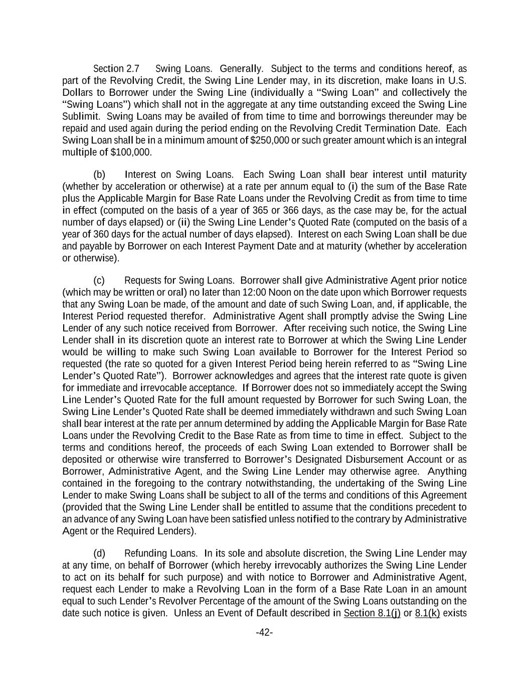 -42- Section 2.7 Swing Loans. Generally. Subject to the terms and conditions hereof, as part of the Revolving Credit, the Swing Line Lender may, in its discretion, make loans in U.S. Dollars to Borrower under the Swing Line (individually a “Swing Loan” and collectively the “Swing Loans”) which shall not in the aggregate at any time outstanding exceed the Swing Line Sublimit. Swing Loans may be availed of from time to time and borrowings thereunder may be repaid and used again during the period ending on the Revolving Credit Termination Date. Each Swing Loan shall be in a minimum amount of $250,000 or such greater amount which is an integral multiple of $100,000. (b) Interest on Swing Loans. Each Swing Loan shall bear interest until maturity (whether by acceleration or otherwise) at a rate per annum equal to (i) the sum of the Base Rate plus the Applicable Margin for Base Rate Loans under the Revolving Credit as from time to time in effect (computed on the basis of a year of 365 or 366 days, as the case may be, for the actual number of days elapsed) or (ii) the Swing Line Lender’s Quoted Rate (computed on the basis of a year of 360 days for the actual number of days elapsed). Interest on each Swing Loan shall be due and payable by Borrower on each Interest Payment Date and at maturity (whether by acceleration or otherwise). (c) Requests for Swing Loans. Borrower shall give Administrative Agent prior notice (which may be written or oral) no later than 12:00 Noon on the date upon which Borrower requests that any Swing Loan be made, of the amount and date of such Swing Loan, and, if applicable, the Interest Period requested therefor. Administrative Agent shall promptly advise the Swing Line Lender of any such notice received from Borrower. After receiving such notice, the Swing Line Lender shall in its discretion quote an interest rate to Borrower at which the Swing Line Lender would be willing to make such Swing Loan available to Borrower for the Interest Period so requested (the rate so quoted for a given Interest Period being herein referred to as “Swing Line Lender’s Quoted Rate”). Borrower acknowledges and agrees that the interest rate quote is given for immediate and irrevocable acceptance. If Borrower does not so immediately accept the Swing Line Lender’s Quoted Rate for the full amount requested by Borrower for such Swing Loan, the Swing Line Lender’s Quoted Rate shall be deemed immediately withdrawn and such Swing Loan shall bear interest at the rate per annum determined by adding the Applicable Margin for Base Rate Loans under the Revolving Credit to the Base Rate as from time to time in effect. Subject to the terms and conditions hereof, the proceeds of each Swing Loan extended to Borrower shall be deposited or otherwise wire transferred to Borrower’s Designated Disbursement Account or as Borrower, Administrative Agent, and the Swing Line Lender may otherwise agree. Anything contained in the foregoing to the contrary notwithstanding, the undertaking of the Swing Line Lender to make Swing Loans shall be subject to all of the terms and conditions of this Agreement (provided that the Swing Line Lender shall be entitled to assume that the conditions precedent to an advance of any Swing Loan have been satisfied unless notified to the contrary by Administrative Agent or the Required Lenders). (d) Refunding Loans. In its sole and absolute discretion, the Swing Line Lender may at any time, on behalf of Borrower (which hereby irrevocably authorizes the Swing Line Lender to act on its behalf for such purpose) and with notice to Borrower and Administrative Agent, request each Lender to make a Revolving Loan in the form of a Base Rate Loan in an amount equal to such Lender’s Revolver Percentage of the amount of the Swing Loans outstanding on the date such notice is given. Unless an Event of Default described in Section 8.1(j) or 8.1(k) exists