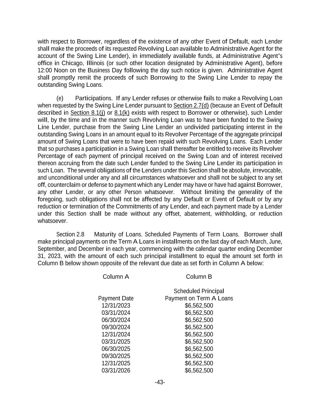 -43- with respect to Borrower, regardless of the existence of any other Event of Default, each Lender shall make the proceeds of its requested Revolving Loan available to Administrative Agent for the account of the Swing Line Lender), in immediately available funds, at Administrative Agent’s office in Chicago, Illinois (or such other location designated by Administrative Agent), before 12:00 Noon on the Business Day following the day such notice is given. Administrative Agent shall promptly remit the proceeds of such Borrowing to the Swing Line Lender to repay the outstanding Swing Loans. (e) Participations. If any Lender refuses or otherwise fails to make a Revolving Loan when requested by the Swing Line Lender pursuant to Section 2.7(d) (because an Event of Default described in Section 8.1(j) or 8.1(k) exists with respect to Borrower or otherwise), such Lender will, by the time and in the manner such Revolving Loan was to have been funded to the Swing Line Lender, purchase from the Swing Line Lender an undivided participating interest in the outstanding Swing Loans in an amount equal to its Revolver Percentage of the aggregate principal amount of Swing Loans that were to have been repaid with such Revolving Loans. Each Lender that so purchases a participation in a Swing Loan shall thereafter be entitled to receive its Revolver Percentage of each payment of principal received on the Swing Loan and of interest received thereon accruing from the date such Lender funded to the Swing Line Lender its participation in such Loan. The several obligations of the Lenders under this Section shall be absolute, irrevocable, and unconditional under any and all circumstances whatsoever and shall not be subject to any set off, counterclaim or defense to payment which any Lender may have or have had against Borrower, any other Lender, or any other Person whatsoever. Without limiting the generality of the foregoing, such obligations shall not be affected by any Default or Event of Default or by any reduction or termination of the Commitments of any Lender, and each payment made by a Lender under this Section shall be made without any offset, abatement, withholding, or reduction whatsoever. Section 2.8 Maturity of Loans. Scheduled Payments of Term Loans. Borrower shall make principal payments on the Term A Loans in installments on the last day of each March, June, September, and December in each year, commencing with the calendar quarter ending December 31, 2023, with the amount of each such principal installment to equal the amount set forth in Column B below shown opposite of the relevant due date as set forth in Column A below: Column A Payment Date Column B Scheduled Principal Payment on Term A Loans 12/31/2023 $6,562,500 03/31/2024 $6,562,500 06/30/2024 $6,562,500 09/30/2024 $6,562,500 12/31/2024 $6,562,500 03/31/2025 $6,562,500 06/30/2025 $6,562,500 09/30/2025 $6,562,500 12/31/2025 $6,562,500 03/31/2026 $6,562,500