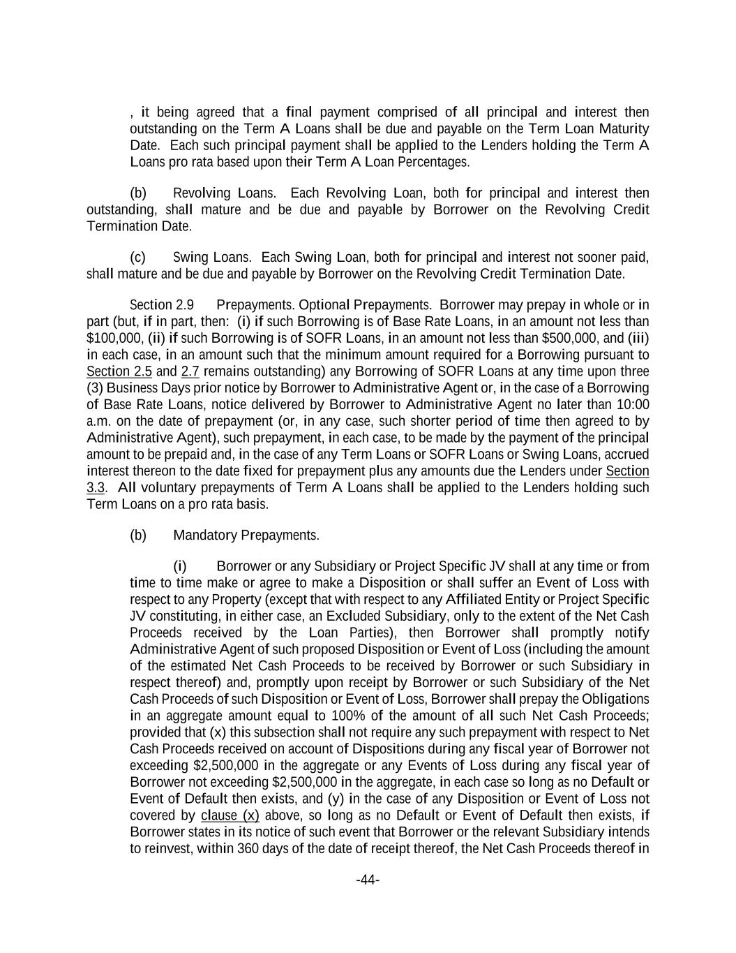 -44- , it being agreed that a final payment comprised of all principal and interest then outstanding on the Term A Loans shall be due and payable on the Term Loan Maturity Date. Each such principal payment shall be applied to the Lenders holding the Term A Loans pro rata based upon their Term A Loan Percentages. (b) Revolving Loans. Each Revolving Loan, both for principal and interest then outstanding, shall mature and be due and payable by Borrower on the Revolving Credit Termination Date. (c) Swing Loans. Each Swing Loan, both for principal and interest not sooner paid, shall mature and be due and payable by Borrower on the Revolving Credit Termination Date. Section 2.9 Prepayments. Optional Prepayments. Borrower may prepay in whole or in part (but, if in part, then: (i) if such Borrowing is of Base Rate Loans, in an amount not less than $100,000, (ii) if such Borrowing is of SOFR Loans, in an amount not less than $500,000, and (iii) in each case, in an amount such that the minimum amount required for a Borrowing pursuant to Section 2.5 and 2.7 remains outstanding) any Borrowing of SOFR Loans at any time upon three (3) Business Days prior notice by Borrower to Administrative Agent or, in the case of a Borrowing of Base Rate Loans, notice delivered by Borrower to Administrative Agent no later than 10:00 a.m. on the date of prepayment (or, in any case, such shorter period of time then agreed to by Administrative Agent), such prepayment, in each case, to be made by the payment of the principal amount to be prepaid and, in the case of any Term Loans or SOFR Loans or Swing Loans, accrued interest thereon to the date fixed for prepayment plus any amounts due the Lenders under Section 3.3. All voluntary prepayments of Term A Loans shall be applied to the Lenders holding such Term Loans on a pro rata basis. (b) Mandatory Prepayments. (i) Borrower or any Subsidiary or Project Specific JV shall at any time or from time to time make or agree to make a Disposition or shall suffer an Event of Loss with respect to any Property (except that with respect to any Affiliated Entity or Project Specific JV constituting, in either case, an Excluded Subsidiary, only to the extent of the Net Cash Proceeds received by the Loan Parties), then Borrower shall promptly notify Administrative Agent of such proposed Disposition or Event of Loss (including the amount of the estimated Net Cash Proceeds to be received by Borrower or such Subsidiary in respect thereof) and, promptly upon receipt by Borrower or such Subsidiary of the Net Cash Proceeds of such Disposition or Event of Loss, Borrower shall prepay the Obligations in an aggregate amount equal to 100% of the amount of all such Net Cash Proceeds; provided that (x) this subsection shall not require any such prepayment with respect to Net Cash Proceeds received on account of Dispositions during any fiscal year of Borrower not exceeding $2,500,000 in the aggregate or any Events of Loss during any fiscal year of Borrower not exceeding $2,500,000 in the aggregate, in each case so long as no Default or Event of Default then exists, and (y) in the case of any Disposition or Event of Loss not covered by clause (x) above, so long as no Default or Event of Default then exists, if Borrower states in its notice of such event that Borrower or the relevant Subsidiary intends to reinvest, within 360 days of the date of receipt thereof, the Net Cash Proceeds thereof in