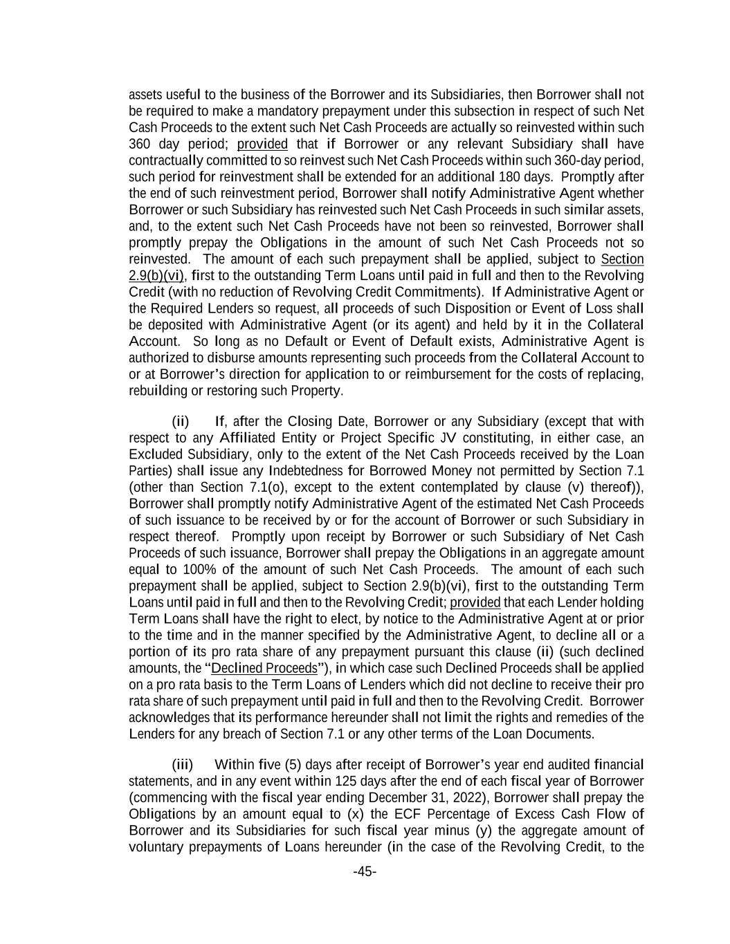 -45- assets useful to the business of the Borrower and its Subsidiaries, then Borrower shall not be required to make a mandatory prepayment under this subsection in respect of such Net Cash Proceeds to the extent such Net Cash Proceeds are actually so reinvested within such 360 day period; provided that if Borrower or any relevant Subsidiary shall have contractually committed to so reinvest such Net Cash Proceeds within such 360-day period, such period for reinvestment shall be extended for an additional 180 days. Promptly after the end of such reinvestment period, Borrower shall notify Administrative Agent whether Borrower or such Subsidiary has reinvested such Net Cash Proceeds in such similar assets, and, to the extent such Net Cash Proceeds have not been so reinvested, Borrower shall promptly prepay the Obligations in the amount of such Net Cash Proceeds not so reinvested. The amount of each such prepayment shall be applied, subject to Section 2.9(b)(vi), first to the outstanding Term Loans until paid in full and then to the Revolving Credit (with no reduction of Revolving Credit Commitments). If Administrative Agent or the Required Lenders so request, all proceeds of such Disposition or Event of Loss shall be deposited with Administrative Agent (or its agent) and held by it in the Collateral Account. So long as no Default or Event of Default exists, Administrative Agent is authorized to disburse amounts representing such proceeds from the Collateral Account to or at Borrower’s direction for application to or reimbursement for the costs of replacing, rebuilding or restoring such Property. (ii) If, after the Closing Date, Borrower or any Subsidiary (except that with respect to any Affiliated Entity or Project Specific JV constituting, in either case, an Excluded Subsidiary, only to the extent of the Net Cash Proceeds received by the Loan Parties) shall issue any Indebtedness for Borrowed Money not permitted by Section 7.1 (other than Section 7.1(o), except to the extent contemplated by clause (v) thereof)), Borrower shall promptly notify Administrative Agent of the estimated Net Cash Proceeds of such issuance to be received by or for the account of Borrower or such Subsidiary in respect thereof. Promptly upon receipt by Borrower or such Subsidiary of Net Cash Proceeds of such issuance, Borrower shall prepay the Obligations in an aggregate amount equal to 100% of the amount of such Net Cash Proceeds. The amount of each such prepayment shall be applied, subject to Section 2.9(b)(vi), first to the outstanding Term Loans until paid in full and then to the Revolving Credit; provided that each Lender holding Term Loans shall have the right to elect, by notice to the Administrative Agent at or prior to the time and in the manner specified by the Administrative Agent, to decline all or a portion of its pro rata share of any prepayment pursuant this clause (ii) (such declined amounts, the “Declined Proceeds”), in which case such Declined Proceeds shall be applied on a pro rata basis to the Term Loans of Lenders which did not decline to receive their pro rata share of such prepayment until paid in full and then to the Revolving Credit. Borrower acknowledges that its performance hereunder shall not limit the rights and remedies of the Lenders for any breach of Section 7.1 or any other terms of the Loan Documents. (iii) Within five (5) days after receipt of Borrower’s year end audited financial statements, and in any event within 125 days after the end of each fiscal year of Borrower (commencing with the fiscal year ending December 31, 2022), Borrower shall prepay the Obligations by an amount equal to (x) the ECF Percentage of Excess Cash Flow of Borrower and its Subsidiaries for such fiscal year minus (y) the aggregate amount of voluntary prepayments of Loans hereunder (in the case of the Revolving Credit, to the