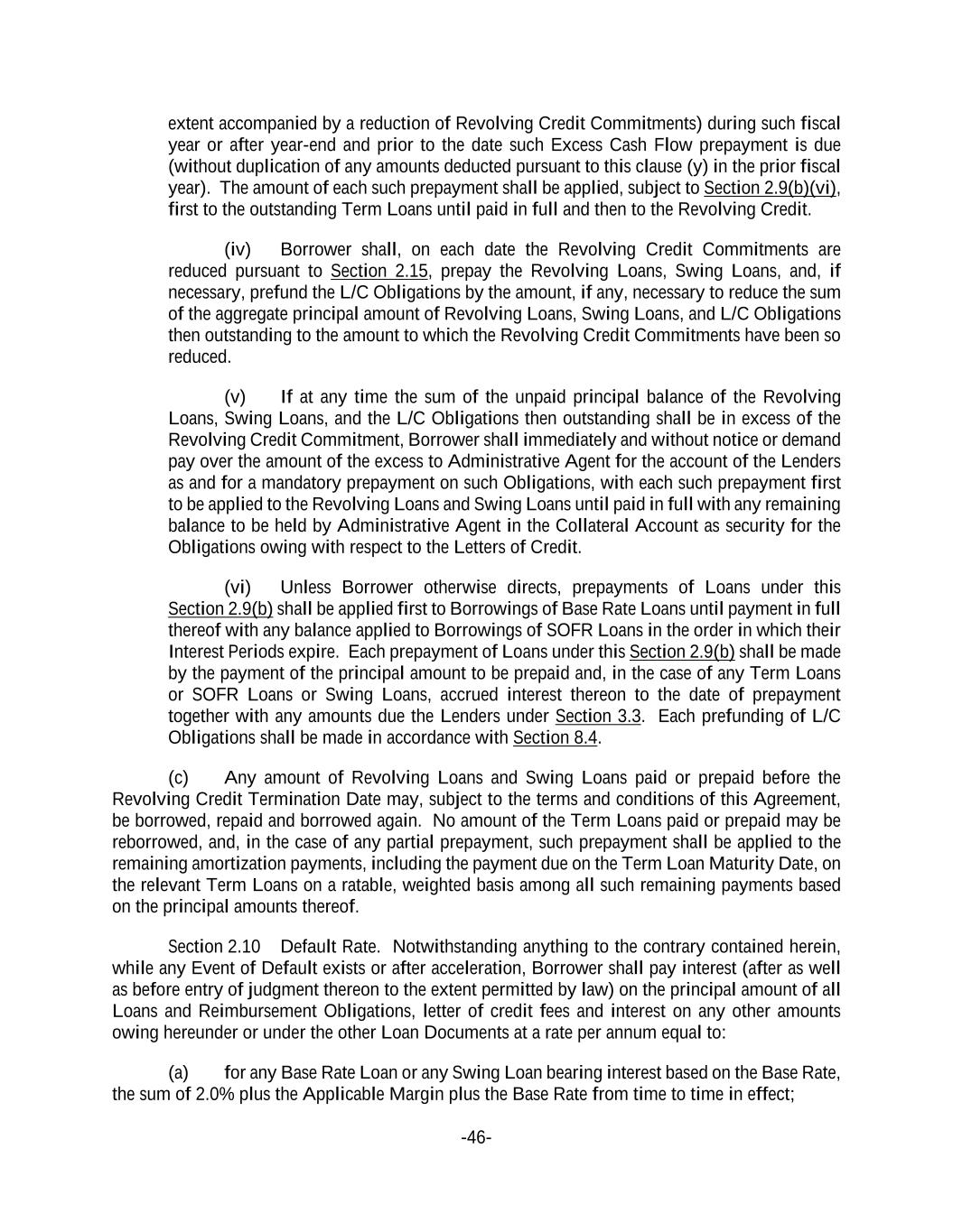 -46- extent accompanied by a reduction of Revolving Credit Commitments) during such fiscal year or after year-end and prior to the date such Excess Cash Flow prepayment is due (without duplication of any amounts deducted pursuant to this clause (y) in the prior fiscal year). The amount of each such prepayment shall be applied, subject to Section 2.9(b)(vi), first to the outstanding Term Loans until paid in full and then to the Revolving Credit. (iv) Borrower shall, on each date the Revolving Credit Commitments are reduced pursuant to Section 2.15, prepay the Revolving Loans, Swing Loans, and, if necessary, prefund the L/C Obligations by the amount, if any, necessary to reduce the sum of the aggregate principal amount of Revolving Loans, Swing Loans, and L/C Obligations then outstanding to the amount to which the Revolving Credit Commitments have been so reduced. (v) If at any time the sum of the unpaid principal balance of the Revolving Loans, Swing Loans, and the L/C Obligations then outstanding shall be in excess of the Revolving Credit Commitment, Borrower shall immediately and without notice or demand pay over the amount of the excess to Administrative Agent for the account of the Lenders as and for a mandatory prepayment on such Obligations, with each such prepayment first to be applied to the Revolving Loans and Swing Loans until paid in full with any remaining balance to be held by Administrative Agent in the Collateral Account as security for the Obligations owing with respect to the Letters of Credit. (vi) Unless Borrower otherwise directs, prepayments of Loans under this Section 2.9(b) shall be applied first to Borrowings of Base Rate Loans until payment in full thereof with any balance applied to Borrowings of SOFR Loans in the order in which their Interest Periods expire. Each prepayment of Loans under this Section 2.9(b) shall be made by the payment of the principal amount to be prepaid and, in the case of any Term Loans or SOFR Loans or Swing Loans, accrued interest thereon to the date of prepayment together with any amounts due the Lenders under Section 3.3. Each prefunding of L/C Obligations shall be made in accordance with Section 8.4. (c) Any amount of Revolving Loans and Swing Loans paid or prepaid before the Revolving Credit Termination Date may, subject to the terms and conditions of this Agreement, be borrowed, repaid and borrowed again. No amount of the Term Loans paid or prepaid may be reborrowed, and, in the case of any partial prepayment, such prepayment shall be applied to the remaining amortization payments, including the payment due on the Term Loan Maturity Date, on the relevant Term Loans on a ratable, weighted basis among all such remaining payments based on the principal amounts thereof. Section 2.10 Default Rate. Notwithstanding anything to the contrary contained herein, while any Event of Default exists or after acceleration, Borrower shall pay interest (after as well as before entry of judgment thereon to the extent permitted by law) on the principal amount of all Loans and Reimbursement Obligations, letter of credit fees and interest on any other amounts owing hereunder or under the other Loan Documents at a rate per annum equal to: (a) for any Base Rate Loan or any Swing Loan bearing interest based on the Base Rate, the sum of 2.0% plus the Applicable Margin plus the Base Rate from time to time in effect;