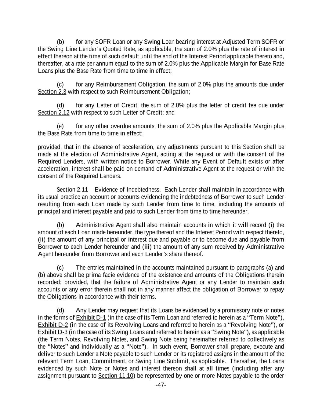 -47- (b) for any SOFR Loan or any Swing Loan bearing interest at Adjusted Term SOFR or the Swing Line Lender’s Quoted Rate, as applicable, the sum of 2.0% plus the rate of interest in effect thereon at the time of such default until the end of the Interest Period applicable thereto and, thereafter, at a rate per annum equal to the sum of 2.0% plus the Applicable Margin for Base Rate Loans plus the Base Rate from time to time in effect; (c) for any Reimbursement Obligation, the sum of 2.0% plus the amounts due under Section 2.3 with respect to such Reimbursement Obligation; (d) for any Letter of Credit, the sum of 2.0% plus the letter of credit fee due under Section 2.12 with respect to such Letter of Credit; and (e) for any other overdue amounts, the sum of 2.0% plus the Applicable Margin plus the Base Rate from time to time in effect; provided, that in the absence of acceleration, any adjustments pursuant to this Section shall be made at the election of Administrative Agent, acting at the request or with the consent of the Required Lenders, with written notice to Borrower. While any Event of Default exists or after acceleration, interest shall be paid on demand of Administrative Agent at the request or with the consent of the Required Lenders. Section 2.11 Evidence of Indebtedness. Each Lender shall maintain in accordance with its usual practice an account or accounts evidencing the indebtedness of Borrower to such Lender resulting from each Loan made by such Lender from time to time, including the amounts of principal and interest payable and paid to such Lender from time to time hereunder. (b) Administrative Agent shall also maintain accounts in which it will record (i) the amount of each Loan made hereunder, the type thereof and the Interest Period with respect thereto, (ii) the amount of any principal or interest due and payable or to become due and payable from Borrower to each Lender hereunder and (iii) the amount of any sum received by Administrative Agent hereunder from Borrower and each Lender’s share thereof. (c) The entries maintained in the accounts maintained pursuant to paragraphs (a) and (b) above shall be prima facie evidence of the existence and amounts of the Obligations therein recorded; provided, that the failure of Administrative Agent or any Lender to maintain such accounts or any error therein shall not in any manner affect the obligation of Borrower to repay the Obligations in accordance with their terms. (d) Any Lender may request that its Loans be evidenced by a promissory note or notes in the forms of Exhibit D-1 (in the case of its Term Loan and referred to herein as a “Term Note”), Exhibit D-2 (in the case of its Revolving Loans and referred to herein as a “Revolving Note”), or Exhibit D-3 (in the case of its Swing Loans and referred to herein as a “Swing Note”), as applicable (the Term Notes, Revolving Notes, and Swing Note being hereinafter referred to collectively as the “Notes” and individually as a “Note”). In such event, Borrower shall prepare, execute and deliver to such Lender a Note payable to such Lender or its registered assigns in the amount of the relevant Term Loan, Commitment, or Swing Line Sublimit, as applicable. Thereafter, the Loans evidenced by such Note or Notes and interest thereon shall at all times (including after any assignment pursuant to Section 11.10) be represented by one or more Notes payable to the order