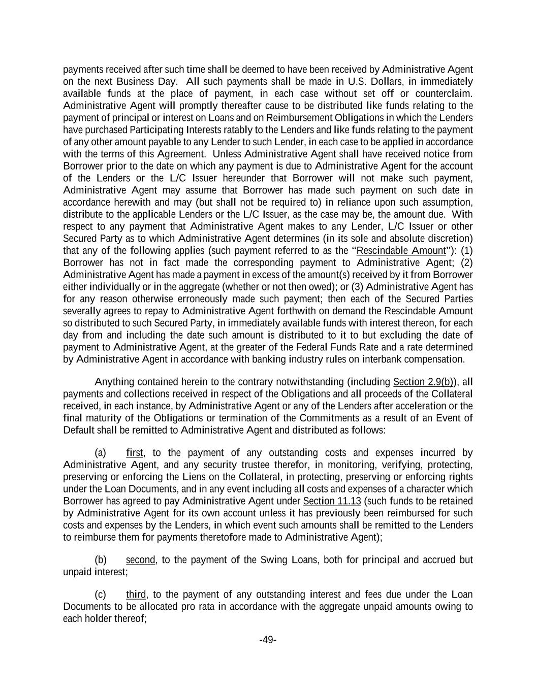 -49- payments received after such time shall be deemed to have been received by Administrative Agent on the next Business Day. All such payments shall be made in U.S. Dollars, in immediately available funds at the place of payment, in each case without set off or counterclaim. Administrative Agent will promptly thereafter cause to be distributed like funds relating to the payment of principal or interest on Loans and on Reimbursement Obligations in which the Lenders have purchased Participating Interests ratably to the Lenders and like funds relating to the payment of any other amount payable to any Lender to such Lender, in each case to be applied in accordance with the terms of this Agreement. Unless Administrative Agent shall have received notice from Borrower prior to the date on which any payment is due to Administrative Agent for the account of the Lenders or the L/C Issuer hereunder that Borrower will not make such payment, Administrative Agent may assume that Borrower has made such payment on such date in accordance herewith and may (but shall not be required to) in reliance upon such assumption, distribute to the applicable Lenders or the L/C Issuer, as the case may be, the amount due. With respect to any payment that Administrative Agent makes to any Lender, L/C Issuer or other Secured Party as to which Administrative Agent determines (in its sole and absolute discretion) that any of the following applies (such payment referred to as the “Rescindable Amount”): (1) Borrower has not in fact made the corresponding payment to Administrative Agent; (2) Administrative Agent has made a payment in excess of the amount(s) received by it from Borrower either individually or in the aggregate (whether or not then owed); or (3) Administrative Agent has for any reason otherwise erroneously made such payment; then each of the Secured Parties severally agrees to repay to Administrative Agent forthwith on demand the Rescindable Amount so distributed to such Secured Party, in immediately available funds with interest thereon, for each day from and including the date such amount is distributed to it to but excluding the date of payment to Administrative Agent, at the greater of the Federal Funds Rate and a rate determined by Administrative Agent in accordance with banking industry rules on interbank compensation. Anything contained herein to the contrary notwithstanding (including Section 2.9(b)), all payments and collections received in respect of the Obligations and all proceeds of the Collateral received, in each instance, by Administrative Agent or any of the Lenders after acceleration or the final maturity of the Obligations or termination of the Commitments as a result of an Event of Default shall be remitted to Administrative Agent and distributed as follows: (a) first, to the payment of any outstanding costs and expenses incurred by Administrative Agent, and any security trustee therefor, in monitoring, verifying, protecting, preserving or enforcing the Liens on the Collateral, in protecting, preserving or enforcing rights under the Loan Documents, and in any event including all costs and expenses of a character which Borrower has agreed to pay Administrative Agent under Section 11.13 (such funds to be retained by Administrative Agent for its own account unless it has previously been reimbursed for such costs and expenses by the Lenders, in which event such amounts shall be remitted to the Lenders to reimburse them for payments theretofore made to Administrative Agent); (b) second, to the payment of the Swing Loans, both for principal and accrued but unpaid interest; (c) third, to the payment of any outstanding interest and fees due under the Loan Documents to be allocated pro rata in accordance with the aggregate unpaid amounts owing to each holder thereof;