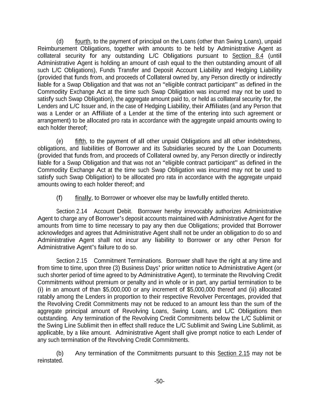 -50- (d) fourth, to the payment of principal on the Loans (other than Swing Loans), unpaid Reimbursement Obligations, together with amounts to be held by Administrative Agent as collateral security for any outstanding L/C Obligations pursuant to Section 8.4 (until Administrative Agent is holding an amount of cash equal to the then outstanding amount of all such L/C Obligations), Funds Transfer and Deposit Account Liability and Hedging Liability (provided that funds from, and proceeds of Collateral owned by, any Person directly or indirectly liable for a Swap Obligation and that was not an “eligible contract participant” as defined in the Commodity Exchange Act at the time such Swap Obligation was incurred may not be used to satisfy such Swap Obligation), the aggregate amount paid to, or held as collateral security for, the Lenders and L/C Issuer and, in the case of Hedging Liability, their Affiliates (and any Person that was a Lender or an Affiliate of a Lender at the time of the entering into such agreement or arrangement) to be allocated pro rata in accordance with the aggregate unpaid amounts owing to each holder thereof; (e) fifth, to the payment of all other unpaid Obligations and all other indebtedness, obligations, and liabilities of Borrower and its Subsidiaries secured by the Loan Documents (provided that funds from, and proceeds of Collateral owned by, any Person directly or indirectly liable for a Swap Obligation and that was not an “eligible contract participant” as defined in the Commodity Exchange Act at the time such Swap Obligation was incurred may not be used to satisfy such Swap Obligation) to be allocated pro rata in accordance with the aggregate unpaid amounts owing to each holder thereof; and (f) finally, to Borrower or whoever else may be lawfully entitled thereto. Section 2.14 Account Debit. Borrower hereby irrevocably authorizes Administrative Agent to charge any of Borrower’s deposit accounts maintained with Administrative Agent for the amounts from time to time necessary to pay any then due Obligations; provided that Borrower acknowledges and agrees that Administrative Agent shall not be under an obligation to do so and Administrative Agent shall not incur any liability to Borrower or any other Person for Administrative Agent’s failure to do so. Section 2.15 Commitment Terminations. Borrower shall have the right at any time and from time to time, upon three (3) Business Days’ prior written notice to Administrative Agent (or such shorter period of time agreed to by Administrative Agent), to terminate the Revolving Credit Commitments without premium or penalty and in whole or in part, any partial termination to be (i) in an amount of than $5,000,000 or any increment of $5,000,000 thereof and (ii) allocated ratably among the Lenders in proportion to their respective Revolver Percentages, provided that the Revolving Credit Commitments may not be reduced to an amount less than the sum of the aggregate principal amount of Revolving Loans, Swing Loans, and L/C Obligations then outstanding. Any termination of the Revolving Credit Commitments below the L/C Sublimit or the Swing Line Sublimit then in effect shall reduce the L/C Sublimit and Swing Line Sublimit, as applicable, by a like amount. Administrative Agent shall give prompt notice to each Lender of any such termination of the Revolving Credit Commitments. (b) Any termination of the Commitments pursuant to this Section 2.15 may not be reinstated.