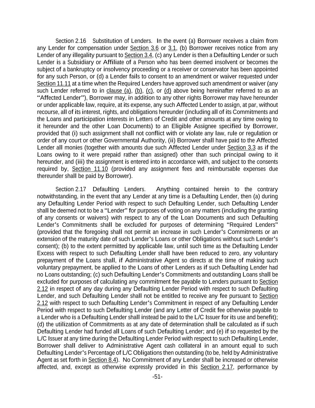 -51- Section 2.16 Substitution of Lenders. In the event (a) Borrower receives a claim from any Lender for compensation under Section 3.6 or 3.1, (b) Borrower receives notice from any Lender of any illegality pursuant to Section 3.4, (c) any Lender is then a Defaulting Lender or such Lender is a Subsidiary or Affiliate of a Person who has been deemed insolvent or becomes the subject of a bankruptcy or insolvency proceeding or a receiver or conservator has been appointed for any such Person, or (d) a Lender fails to consent to an amendment or waiver requested under Section 11.11 at a time when the Required Lenders have approved such amendment or waiver (any such Lender referred to in clause (a), (b), (c), or (d) above being hereinafter referred to as an “Affected Lender”), Borrower may, in addition to any other rights Borrower may have hereunder or under applicable law, require, at its expense, any such Affected Lender to assign, at par, without recourse, all of its interest, rights, and obligations hereunder (including all of its Commitments and the Loans and participation interests in Letters of Credit and other amounts at any time owing to it hereunder and the other Loan Documents) to an Eligible Assignee specified by Borrower, provided that (i) such assignment shall not conflict with or violate any law, rule or regulation or order of any court or other Governmental Authority, (ii) Borrower shall have paid to the Affected Lender all monies (together with amounts due such Affected Lender under Section 3.3 as if the Loans owing to it were prepaid rather than assigned) other than such principal owing to it hereunder, and (iii) the assignment is entered into in accordance with, and subject to the consents required by, Section 11.10 (provided any assignment fees and reimbursable expenses due thereunder shall be paid by Borrower). Section 2.17 Defaulting Lenders. Anything contained herein to the contrary notwithstanding, in the event that any Lender at any time is a Defaulting Lender, then (a) during any Defaulting Lender Period with respect to such Defaulting Lender, such Defaulting Lender shall be deemed not to be a “Lender” for purposes of voting on any matters (including the granting of any consents or waivers) with respect to any of the Loan Documents and such Defaulting Lender’s Commitments shall be excluded for purposes of determining “Required Lenders” (provided that the foregoing shall not permit an increase in such Lender’s Commitments or an extension of the maturity date of such Lender’s Loans or other Obligations without such Lender’s consent); (b) to the extent permitted by applicable law, until such time as the Defaulting Lender Excess with respect to such Defaulting Lender shall have been reduced to zero, any voluntary prepayment of the Loans shall, if Administrative Agent so directs at the time of making such voluntary prepayment, be applied to the Loans of other Lenders as if such Defaulting Lender had no Loans outstanding; (c) such Defaulting Lender’s Commitments and outstanding Loans shall be excluded for purposes of calculating any commitment fee payable to Lenders pursuant to Section 2.12 in respect of any day during any Defaulting Lender Period with respect to such Defaulting Lender, and such Defaulting Lender shall not be entitled to receive any fee pursuant to Section 2.12 with respect to such Defaulting Lender’s Commitment in respect of any Defaulting Lender Period with respect to such Defaulting Lender (and any Letter of Credit fee otherwise payable to a Lender who is a Defaulting Lender shall instead be paid to the L/C Issuer for its use and benefit); (d) the utilization of Commitments as at any date of determination shall be calculated as if such Defaulting Lender had funded all Loans of such Defaulting Lender; and (e) if so requested by the L/C Issuer at any time during the Defaulting Lender Period with respect to such Defaulting Lender, Borrower shall deliver to Administrative Agent cash collateral in an amount equal to such Defaulting Lender’s Percentage of L/C Obligations then outstanding (to be, held by Administrative Agent as set forth in Section 8.4). No Commitment of any Lender shall be increased or otherwise affected, and, except as otherwise expressly provided in this Section 2.17, performance by