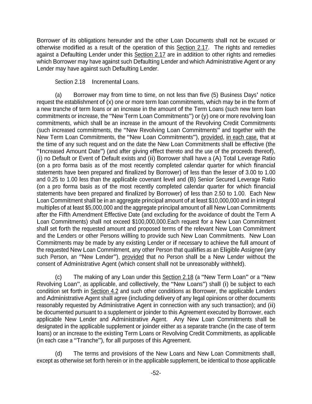 -52- Borrower of its obligations hereunder and the other Loan Documents shall not be excused or otherwise modified as a result of the operation of this Section 2.17. The rights and remedies against a Defaulting Lender under this Section 2.17 are in addition to other rights and remedies which Borrower may have against such Defaulting Lender and which Administrative Agent or any Lender may have against such Defaulting Lender. Section 2.18 Incremental Loans. (a) Borrower may from time to time, on not less than five (5) Business Days’ notice request the establishment of (x) one or more term loan commitments, which may be in the form of a new tranche of term loans or an increase in the amount of the Term Loans (such new term loan commitments or increase, the “New Term Loan Commitments”) or (y) one or more revolving loan commitments, which shall be an increase in the amount of the Revolving Credit Commitments (such increased commitments, the “New Revolving Loan Commitments” and together with the New Term Loan Commitments, the “New Loan Commitments”), provided, in each case, that at the time of any such request and on the date the New Loan Commitments shall be effective (the “Increased Amount Date”) (and after giving effect thereto and the use of the proceeds thereof), (i) no Default or Event of Default exists and (ii) Borrower shall have a (A) Total Leverage Ratio (on a pro forma basis as of the most recently completed calendar quarter for which financial statements have been prepared and finalized by Borrower) of less than the lesser of 3.00 to 1.00 and 0.25 to 1.00 less than the applicable covenant level and (B) Senior Secured Leverage Ratio (on a pro forma basis as of the most recently completed calendar quarter for which financial statements have been prepared and finalized by Borrower) of less than 2.50 to 1.00. Each New Loan Commitment shall be in an aggregate principal amount of at least $10,000,000 and in integral multiples of at least $5,000,000 and the aggregate principal amount of all New Loan Commitments after the Fifth Amendment Effective Date (and excluding for the avoidance of doubt the Term A Loan Commitments) shall not exceed $100,000,000.Each request for a New Loan Commitment shall set forth the requested amount and proposed terms of the relevant New Loan Commitment and the Lenders or other Persons willing to provide such New Loan Commitments. New Loan Commitments may be made by any existing Lender or if necessary to achieve the full amount of the requested New Loan Commitment, any other Person that qualifies as an Eligible Assignee (any such Person, an “New Lender”), provided that no Person shall be a New Lender without the consent of Administrative Agent (which consent shall not be unreasonably withheld). (c) The making of any Loan under this Section 2.18 (a “New Term Loan” or a “New Revolving Loan”, as applicable, and collectively, the “New Loans”) shall (i) be subject to each condition set forth in Section 4.2 and such other conditions as Borrower, the applicable Lenders and Administrative Agent shall agree (including delivery of any legal opinions or other documents reasonably requested by Administrative Agent in connection with any such transaction); and (ii) be documented pursuant to a supplement or joinder to this Agreement executed by Borrower, each applicable New Lender and Administrative Agent. Any New Loan Commitments shall be designated in the applicable supplement or joinder either as a separate tranche (in the case of term loans) or an increase to the existing Term Loans or Revolving Credit Commitments, as applicable (in each case a “Tranche”), for all purposes of this Agreement. (d) The terms and provisions of the New Loans and New Loan Commitments shall, except as otherwise set forth herein or in the applicable supplement, be identical to those applicable