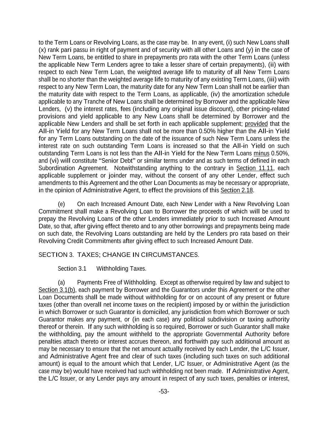 -53- to the Term Loans or Revolving Loans, as the case may be. In any event, (i) such New Loans shall (x) rank pari passu in right of payment and of security with all other Loans and (y) in the case of New Term Loans, be entitled to share in prepayments pro rata with the other Term Loans (unless the applicable New Term Lenders agree to take a lesser share of certain prepayments), (ii) with respect to each New Term Loan, the weighted average life to maturity of all New Term Loans shall be no shorter than the weighted average life to maturity of any existing Term Loans, (iii) with respect to any New Term Loan, the maturity date for any New Term Loan shall not be earlier than the maturity date with respect to the Term Loans, as applicable, (iv) the amortization schedule applicable to any Tranche of New Loans shall be determined by Borrower and the applicable New Lenders, (v) the interest rates, fees (including any original issue discount), other pricing-related provisions and yield applicable to any New Loans shall be determined by Borrower and the applicable New Lenders and shall be set forth in each applicable supplement; provided that the All-in Yield for any New Term Loans shall not be more than 0.50% higher than the All-in Yield for any Term Loans outstanding on the date of the issuance of such New Term Loans unless the interest rate on such outstanding Term Loans is increased so that the All-in Yield on such outstanding Term Loans is not less than the All-in Yield for the New Term Loans minus 0.50%, and (vi) will constitute “Senior Debt” or similar terms under and as such terms of defined in each Subordination Agreement. Notwithstanding anything to the contrary in Section 11.11, each applicable supplement or joinder may, without the consent of any other Lender, effect such amendments to this Agreement and the other Loan Documents as may be necessary or appropriate, in the opinion of Administrative Agent, to effect the provisions of this Section 2.18. (e) On each Increased Amount Date, each New Lender with a New Revolving Loan Commitment shall make a Revolving Loan to Borrower the proceeds of which will be used to prepay the Revolving Loans of the other Lenders immediately prior to such Increased Amount Date, so that, after giving effect thereto and to any other borrowings and prepayments being made on such date, the Revolving Loans outstanding are held by the Lenders pro rata based on their Revolving Credit Commitments after giving effect to such Increased Amount Date. SECTION 3. TAXES; CHANGE IN CIRCUMSTANCES. Section 3.1 Withholding Taxes. (a) Payments Free of Withholding. Except as otherwise required by law and subject to Section 3.1(b), each payment by Borrower and the Guarantors under this Agreement or the other Loan Documents shall be made without withholding for or on account of any present or future taxes (other than overall net income taxes on the recipient) imposed by or within the jurisdiction in which Borrower or such Guarantor is domiciled, any jurisdiction from which Borrower or such Guarantor makes any payment, or (in each case) any political subdivision or taxing authority thereof or therein. If any such withholding is so required, Borrower or such Guarantor shall make the withholding, pay the amount withheld to the appropriate Governmental Authority before penalties attach thereto or interest accrues thereon, and forthwith pay such additional amount as may be necessary to ensure that the net amount actually received by each Lender, the L/C Issuer, and Administrative Agent free and clear of such taxes (including such taxes on such additional amount) is equal to the amount which that Lender, L/C Issuer, or Administrative Agent (as the case may be) would have received had such withholding not been made. If Administrative Agent, the L/C Issuer, or any Lender pays any amount in respect of any such taxes, penalties or interest,