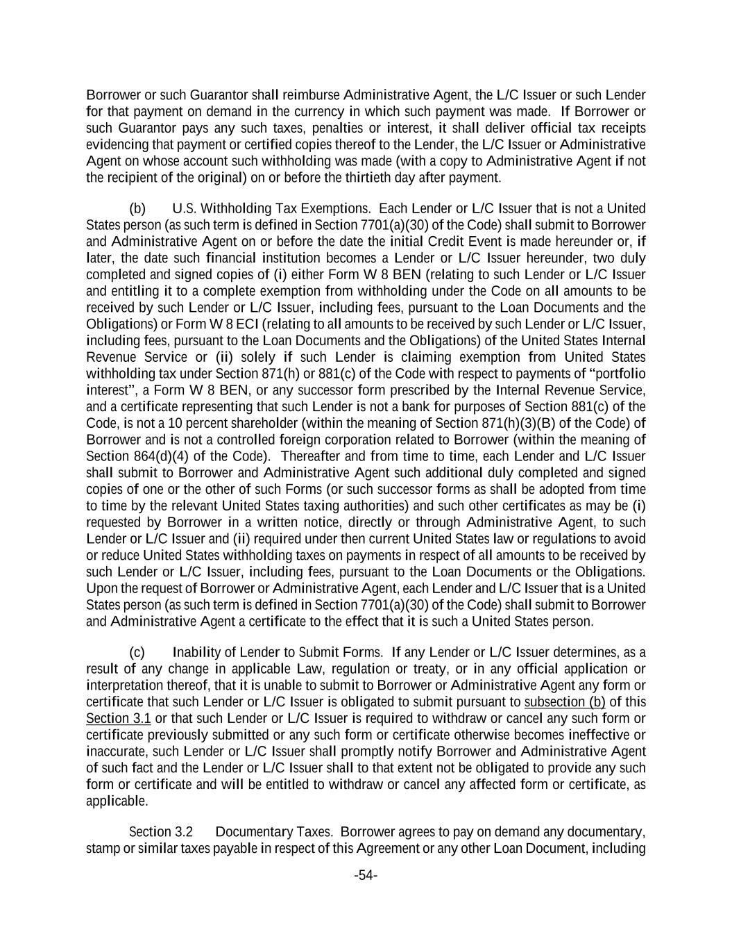 -54- Borrower or such Guarantor shall reimburse Administrative Agent, the L/C Issuer or such Lender for that payment on demand in the currency in which such payment was made. If Borrower or such Guarantor pays any such taxes, penalties or interest, it shall deliver official tax receipts evidencing that payment or certified copies thereof to the Lender, the L/C Issuer or Administrative Agent on whose account such withholding was made (with a copy to Administrative Agent if not the recipient of the original) on or before the thirtieth day after payment. (b) U.S. Withholding Tax Exemptions. Each Lender or L/C Issuer that is not a United States person (as such term is defined in Section 7701(a)(30) of the Code) shall submit to Borrower and Administrative Agent on or before the date the initial Credit Event is made hereunder or, if later, the date such financial institution becomes a Lender or L/C Issuer hereunder, two duly completed and signed copies of (i) either Form W 8 BEN (relating to such Lender or L/C Issuer and entitling it to a complete exemption from withholding under the Code on all amounts to be received by such Lender or L/C Issuer, including fees, pursuant to the Loan Documents and the Obligations) or Form W 8 ECI (relating to all amounts to be received by such Lender or L/C Issuer, including fees, pursuant to the Loan Documents and the Obligations) of the United States Internal Revenue Service or (ii) solely if such Lender is claiming exemption from United States withholding tax under Section 871(h) or 881(c) of the Code with respect to payments of “portfolio interest”, a Form W 8 BEN, or any successor form prescribed by the Internal Revenue Service, and a certificate representing that such Lender is not a bank for purposes of Section 881(c) of the Code, is not a 10 percent shareholder (within the meaning of Section 871(h)(3)(B) of the Code) of Borrower and is not a controlled foreign corporation related to Borrower (within the meaning of Section 864(d)(4) of the Code). Thereafter and from time to time, each Lender and L/C Issuer shall submit to Borrower and Administrative Agent such additional duly completed and signed copies of one or the other of such Forms (or such successor forms as shall be adopted from time to time by the relevant United States taxing authorities) and such other certificates as may be (i) requested by Borrower in a written notice, directly or through Administrative Agent, to such Lender or L/C Issuer and (ii) required under then current United States law or regulations to avoid or reduce United States withholding taxes on payments in respect of all amounts to be received by such Lender or L/C Issuer, including fees, pursuant to the Loan Documents or the Obligations. Upon the request of Borrower or Administrative Agent, each Lender and L/C Issuer that is a United States person (as such term is defined in Section 7701(a)(30) of the Code) shall submit to Borrower and Administrative Agent a certificate to the effect that it is such a United States person. (c) Inability of Lender to Submit Forms. If any Lender or L/C Issuer determines, as a result of any change in applicable Law, regulation or treaty, or in any official application or interpretation thereof, that it is unable to submit to Borrower or Administrative Agent any form or certificate that such Lender or L/C Issuer is obligated to submit pursuant to subsection (b) of this Section 3.1 or that such Lender or L/C Issuer is required to withdraw or cancel any such form or certificate previously submitted or any such form or certificate otherwise becomes ineffective or inaccurate, such Lender or L/C Issuer shall promptly notify Borrower and Administrative Agent of such fact and the Lender or L/C Issuer shall to that extent not be obligated to provide any such form or certificate and will be entitled to withdraw or cancel any affected form or certificate, as applicable. Section 3.2 Documentary Taxes. Borrower agrees to pay on demand any documentary, stamp or similar taxes payable in respect of this Agreement or any other Loan Document, including