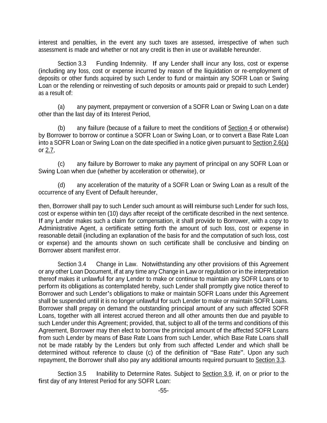 -55- interest and penalties, in the event any such taxes are assessed, irrespective of when such assessment is made and whether or not any credit is then in use or available hereunder. Section 3.3 Funding Indemnity. If any Lender shall incur any loss, cost or expense (including any loss, cost or expense incurred by reason of the liquidation or re-employment of deposits or other funds acquired by such Lender to fund or maintain any SOFR Loan or Swing Loan or the relending or reinvesting of such deposits or amounts paid or prepaid to such Lender) as a result of: (a) any payment, prepayment or conversion of a SOFR Loan or Swing Loan on a date other than the last day of its Interest Period, (b) any failure (because of a failure to meet the conditions of Section 4 or otherwise) by Borrower to borrow or continue a SOFR Loan or Swing Loan, or to convert a Base Rate Loan into a SOFR Loan or Swing Loan on the date specified in a notice given pursuant to Section 2.6(a) or 2.7, (c) any failure by Borrower to make any payment of principal on any SOFR Loan or Swing Loan when due (whether by acceleration or otherwise), or (d) any acceleration of the maturity of a SOFR Loan or Swing Loan as a result of the occurrence of any Event of Default hereunder, then, Borrower shall pay to such Lender such amount as will reimburse such Lender for such loss, cost or expense within ten (10) days after receipt of the certificate described in the next sentence. If any Lender makes such a claim for compensation, it shall provide to Borrower, with a copy to Administrative Agent, a certificate setting forth the amount of such loss, cost or expense in reasonable detail (including an explanation of the basis for and the computation of such loss, cost or expense) and the amounts shown on such certificate shall be conclusive and binding on Borrower absent manifest error. Section 3.4 Change in Law. Notwithstanding any other provisions of this Agreement or any other Loan Document, if at any time any Change in Law or regulation or in the interpretation thereof makes it unlawful for any Lender to make or continue to maintain any SOFR Loans or to perform its obligations as contemplated hereby, such Lender shall promptly give notice thereof to Borrower and such Lender’s obligations to make or maintain SOFR Loans under this Agreement shall be suspended until it is no longer unlawful for such Lender to make or maintain SOFR Loans. Borrower shall prepay on demand the outstanding principal amount of any such affected SOFR Loans, together with all interest accrued thereon and all other amounts then due and payable to such Lender under this Agreement; provided, that, subject to all of the terms and conditions of this Agreement, Borrower may then elect to borrow the principal amount of the affected SOFR Loans from such Lender by means of Base Rate Loans from such Lender, which Base Rate Loans shall not be made ratably by the Lenders but only from such affected Lender and which shall be determined without reference to clause (c) of the definition of “Base Rate”. Upon any such repayment, the Borrower shall also pay any additional amounts required pursuant to Section 3.3. Section 3.5 Inability to Determine Rates. Subject to Section 3.9, if, on or prior to the first day of any Interest Period for any SOFR Loan: